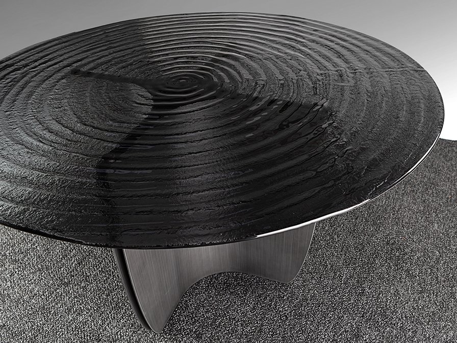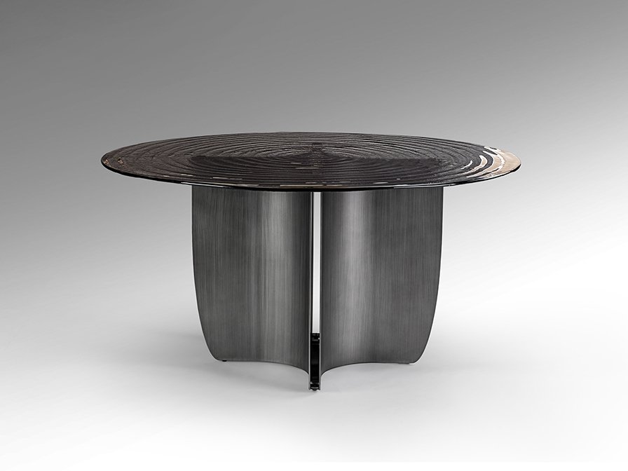 Круглый обеденный стол из металла с патинированной свинцово-серой отделкой. Столешница из серого термоформованного стекла с текстурой концентрических волн.