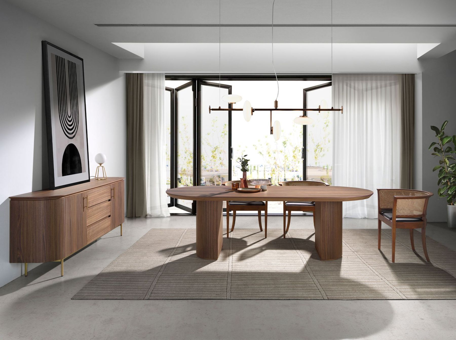 Неподвижный обеденный стол с овальной столешницей из шпона орехового дерева.