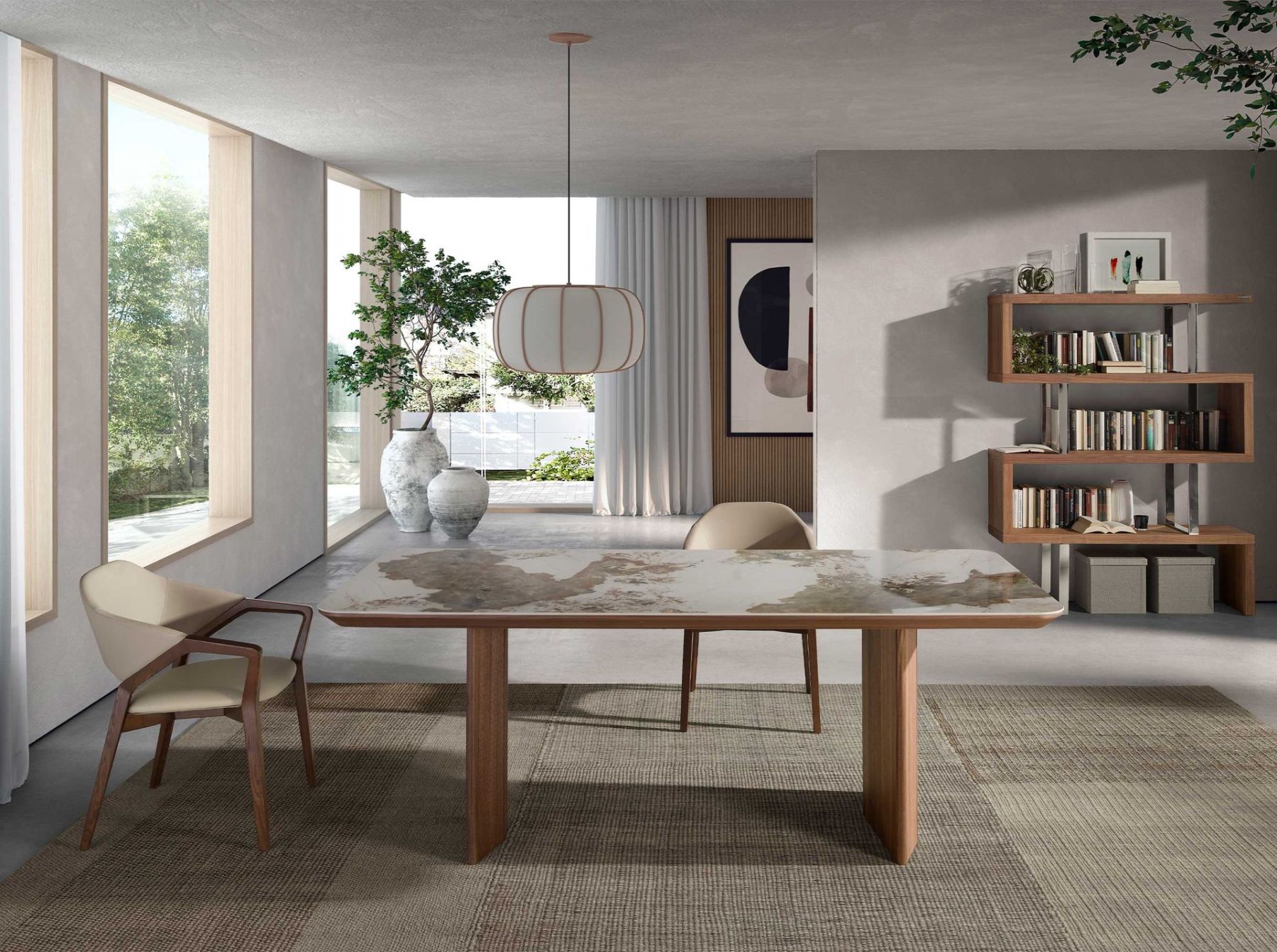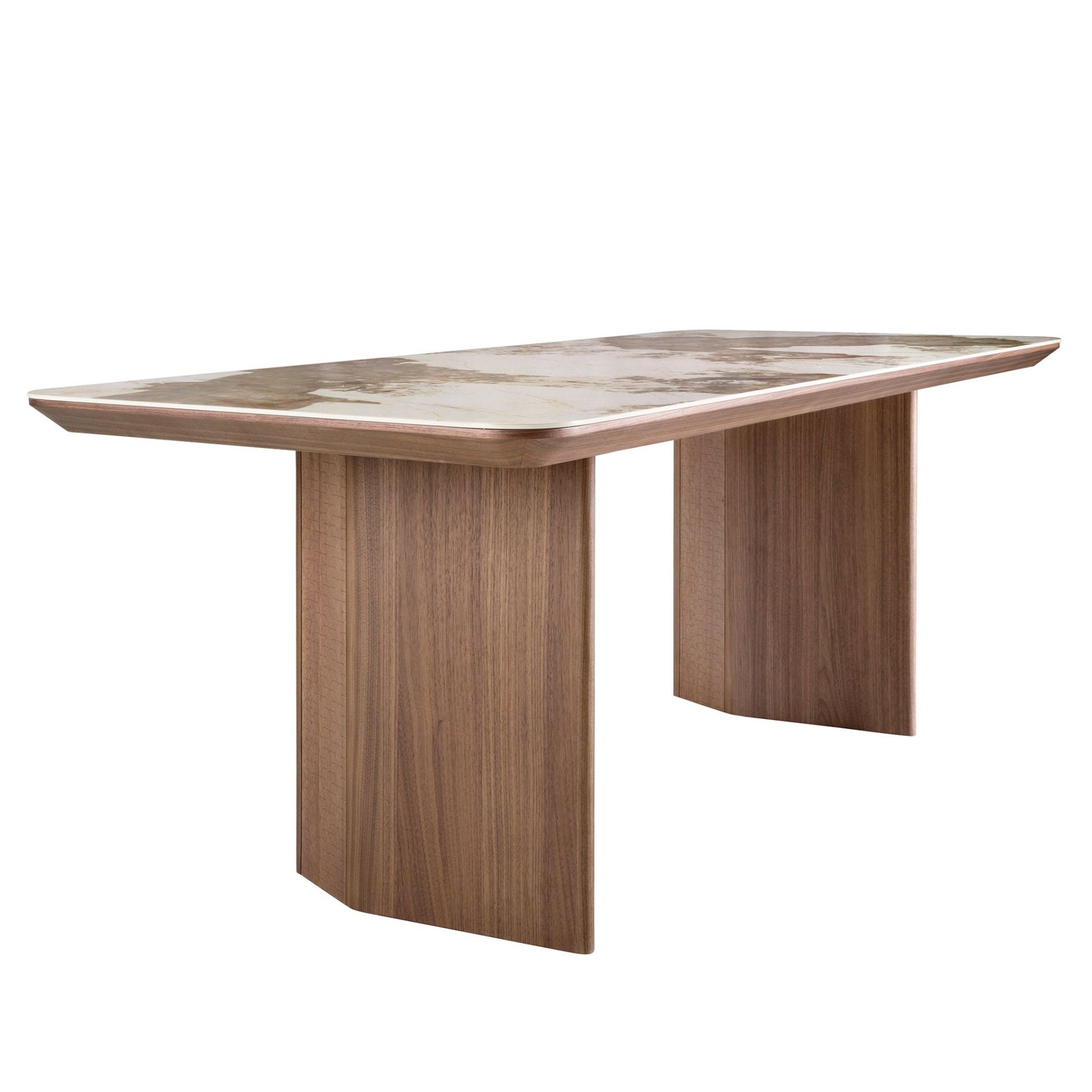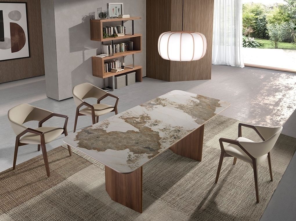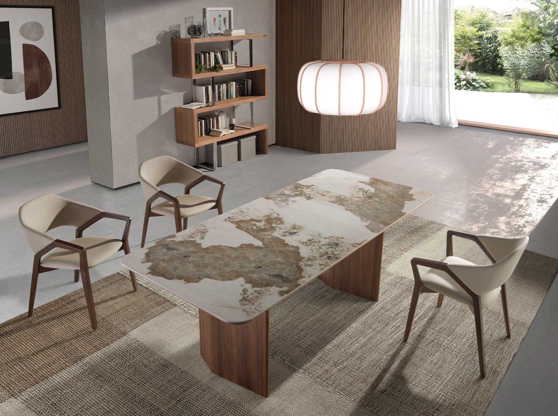 Прямоугольный обеденный стол современного дизайна с фиксированной столешницей из белого керамогранита с прожилками земляных тонов и глянцевой отделкой. Его оригинальные деревянные ножки, покрытые шпоном натурального ореха, являются ключевым элементом дизайна.