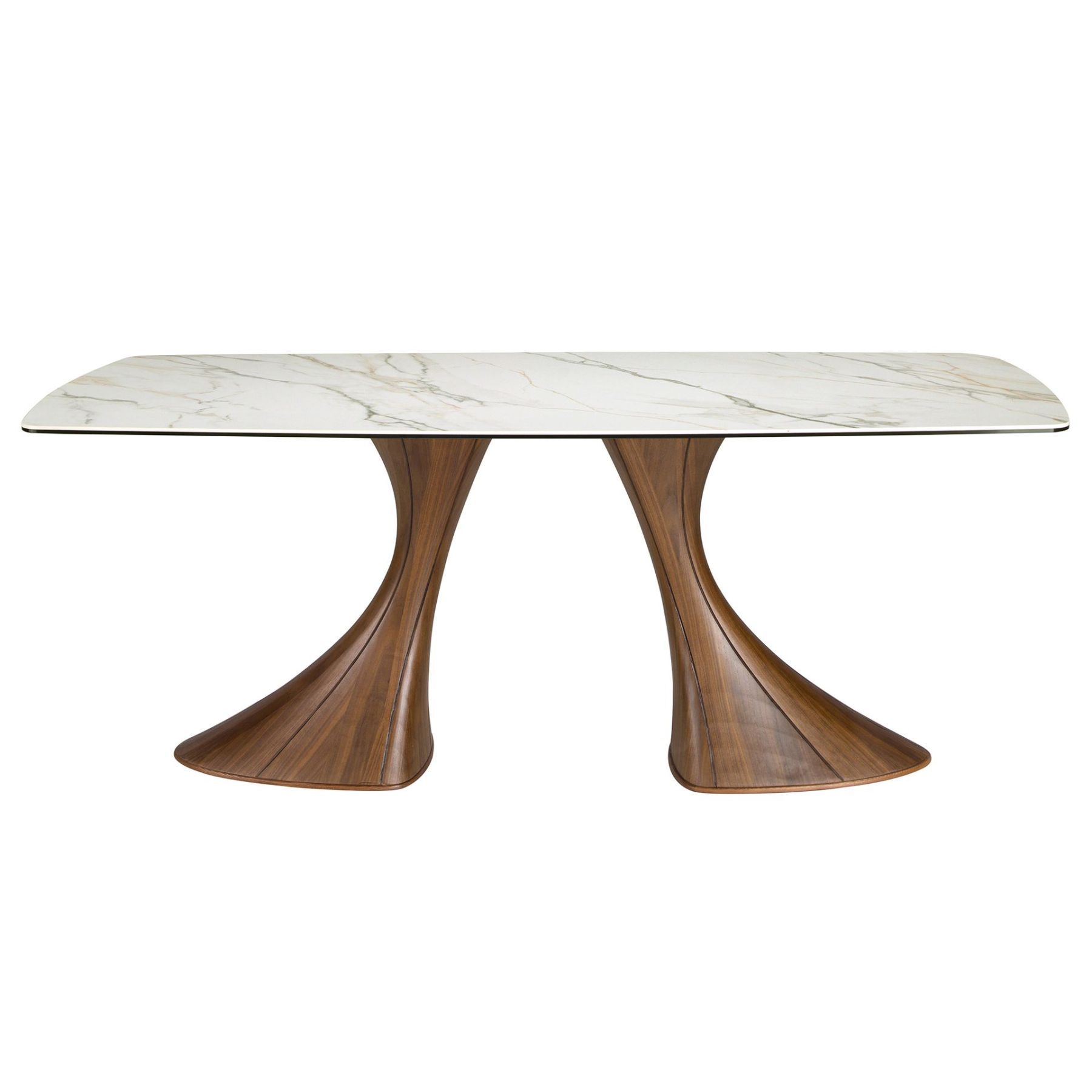 Современный обеденный стол овальной формы с фиксированной столешницей из белого керамогранита с серыми и коричневыми прожилками в матовой отделке. Оригинальные деревянные ножки цвета ореха – ключевой элемент, подчеркивающий его дизайн.