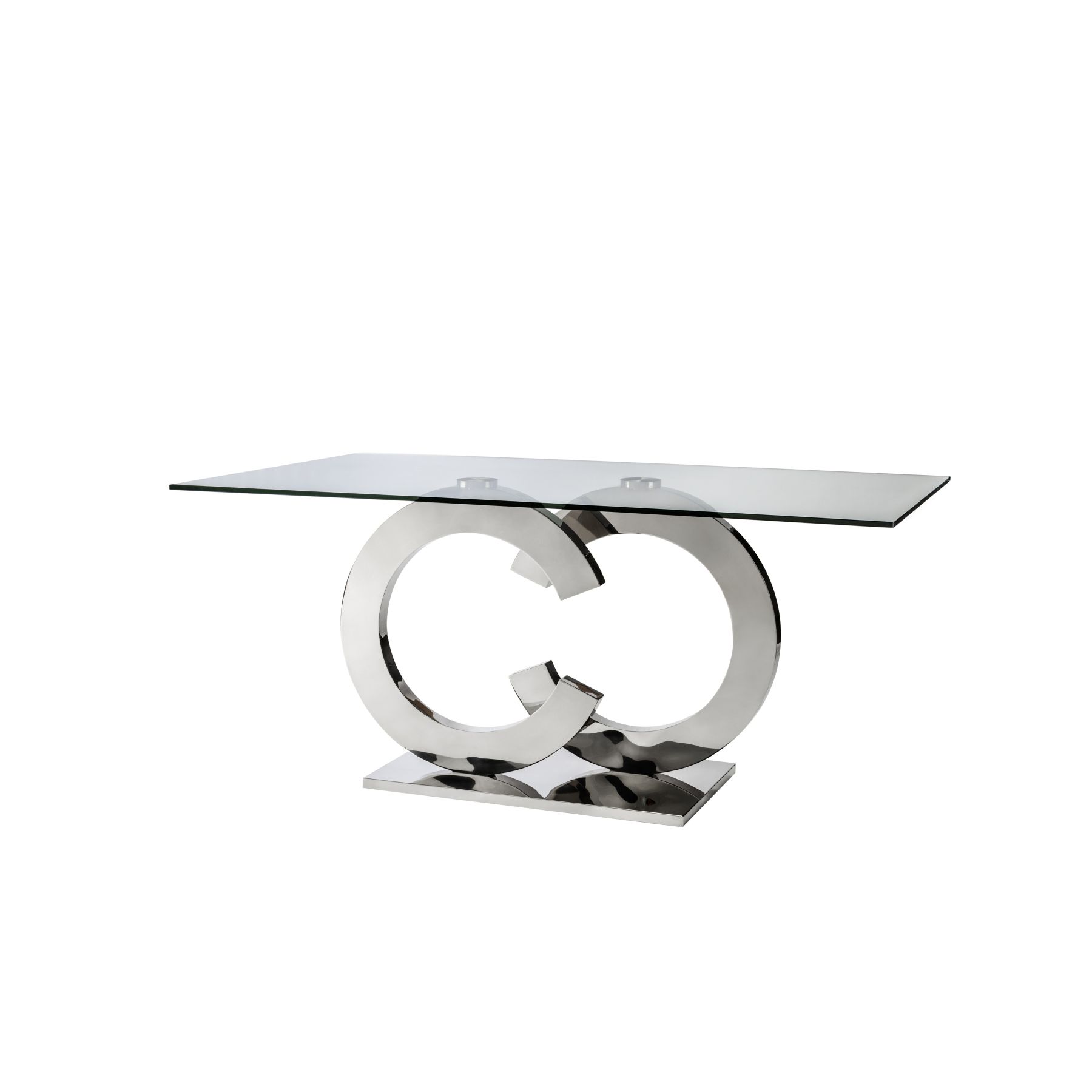 Прямоугольный обеденный стол из нержавеющей стали и безопасного стекла толщиной 12 мм с полированной кромкой.