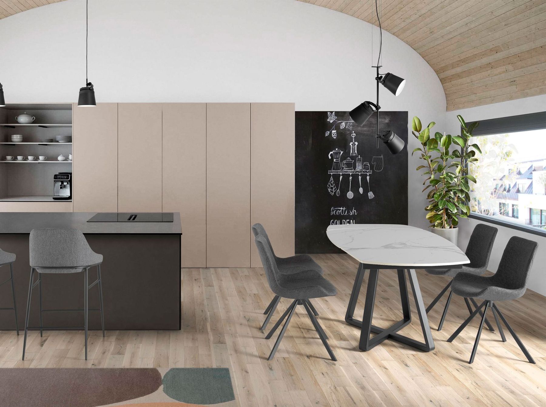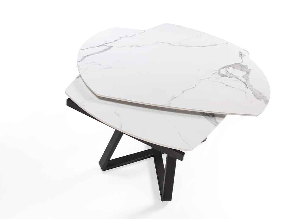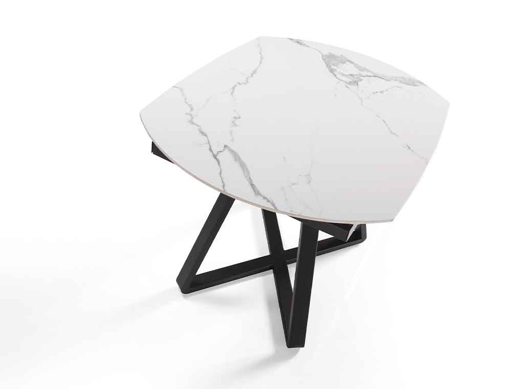 Стол состоит из черной стальной опоры и керамической столешницы.