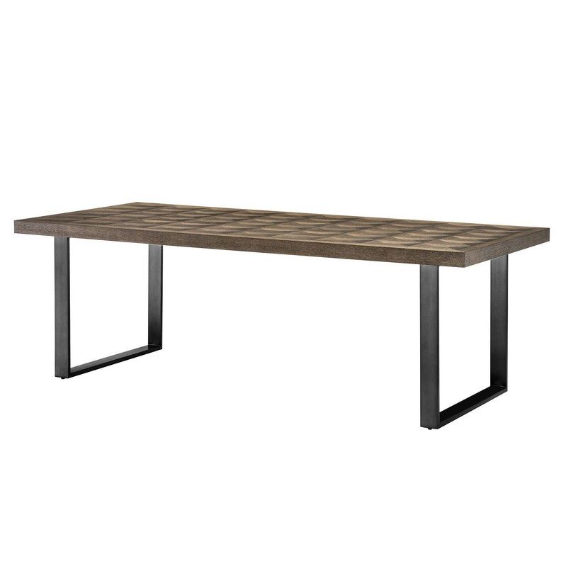 Обеденный стол на тонких ножках выполнен из нержавеющей стали и МДФ в шпоне дуба, создающем оптическую иллюзию рельефа.