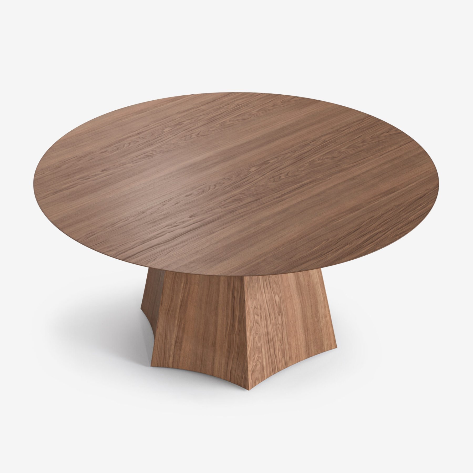 Круглая столешница из шпона дуба со сложным скосом торца кажется почти парящей над основанием — лёгкой и воздушной. Она формирует цельный объём и организует пространство вокруг себя без острых углов и избыточных деталей. LUMO одинаково уместен и в минималистичной гостиной, и в более насыщенной столовой, сохраняя визуальное спокойствие и структурную ясность.