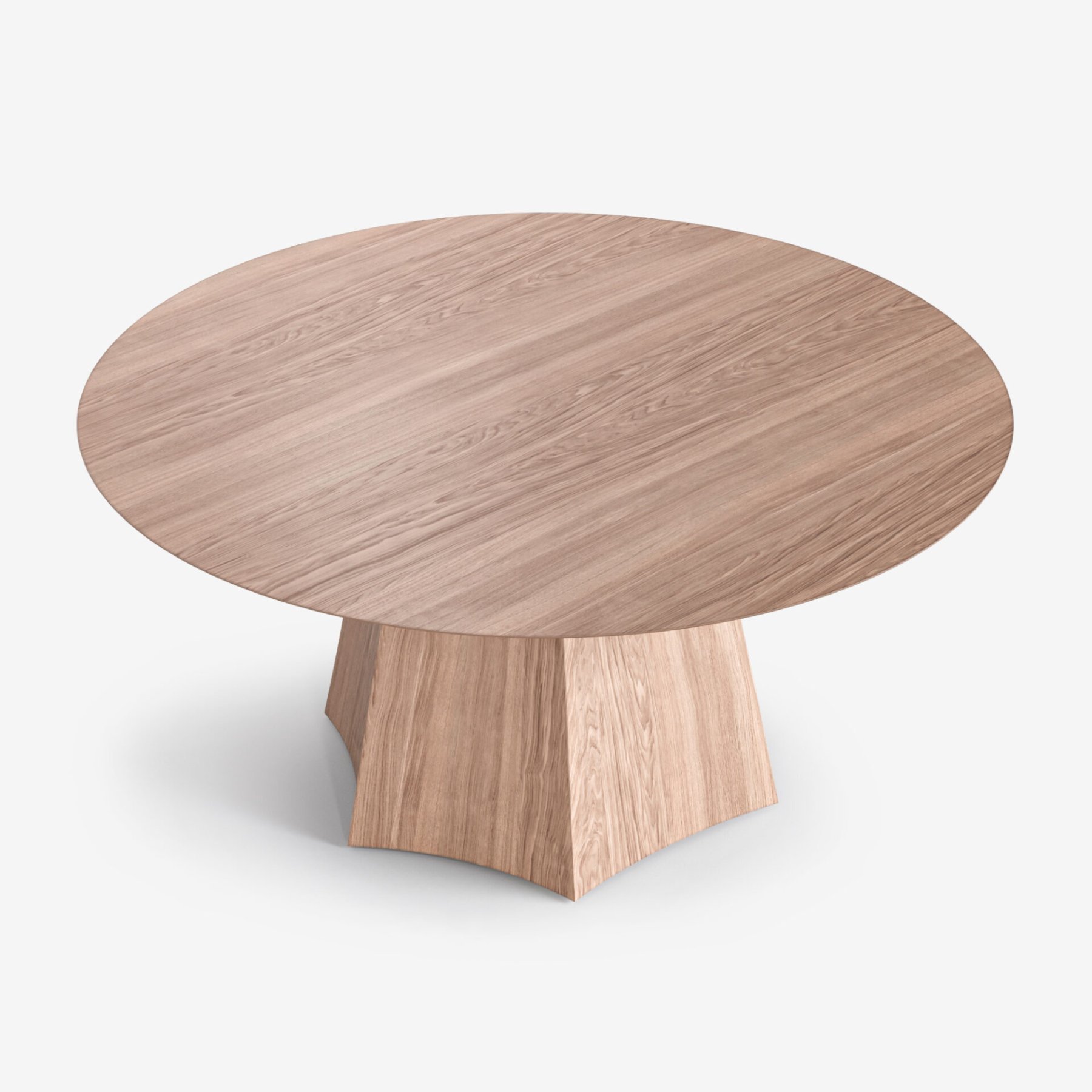 Круглая столешница из шпона дуба со сложным скосом торца кажется почти парящей над основанием — лёгкой и воздушной. Она формирует цельный объём и организует пространство вокруг себя без острых углов и избыточных деталей. LUMO одинаково уместен и в минималистичной гостиной, и в более насыщенной столовой, сохраняя визуальное спокойствие и структурную ясность.