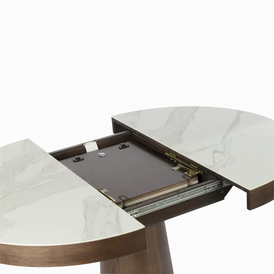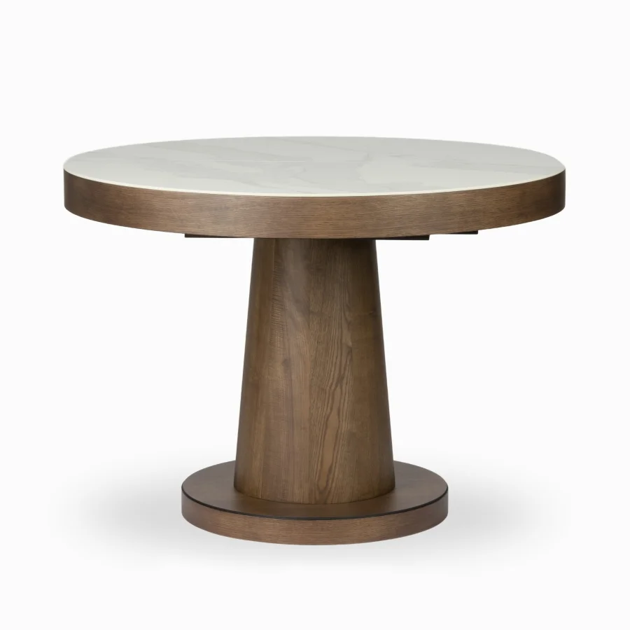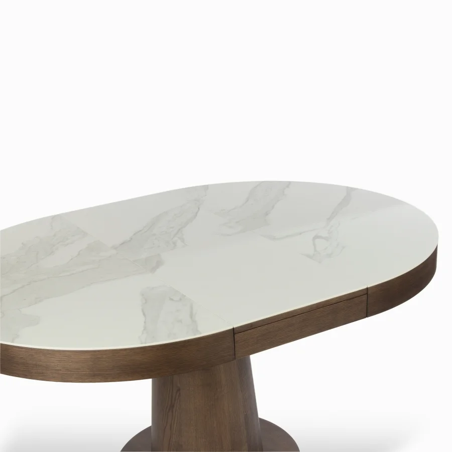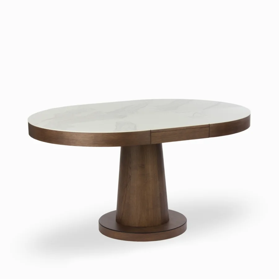 Его изысканные ножки цвета темного ореха, выполненные из МДФ с шпоном, придают конструкции стабильность и стиль, а белая матовая столешница из МДФ и керамики создает эффект легкости и свежести. Этот стол не только станет центром притяжения в вашем интерьере, но и обеспечит комфортные условия для семейных ужинов и встреч с друзьями.