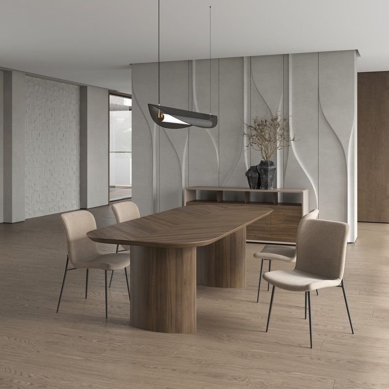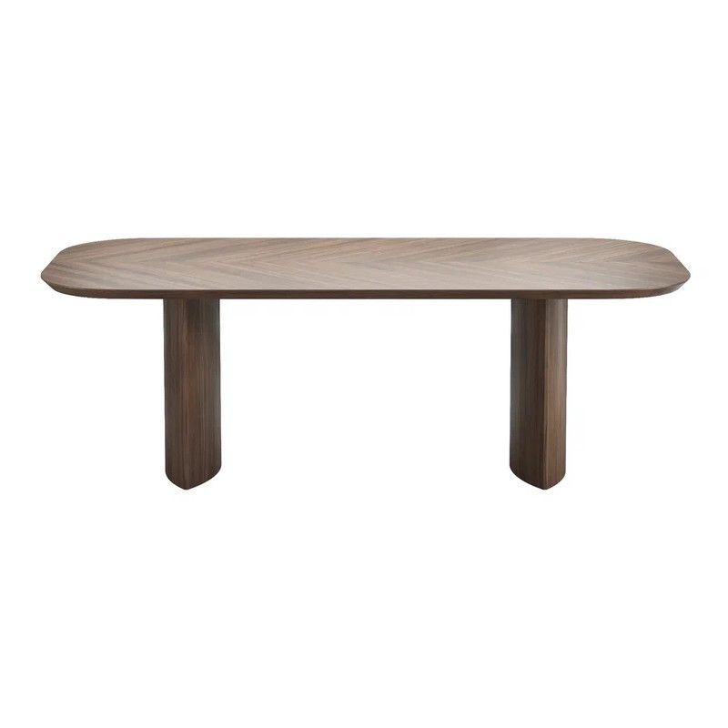 Актуальный обеденный стол Miramar в современном стиле является центром столовой. Акцентная выкладка шпона узором Chevron на столешнице делают эту модель уникальной. Рисунок натурального шпона всегда индивидуален.