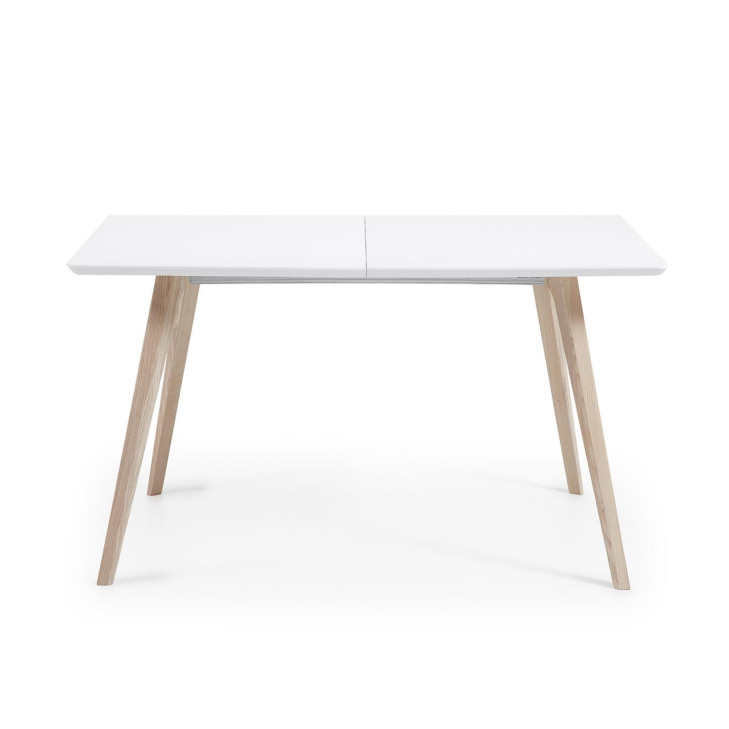 Стол прямоугольной формы. Столешница раздвижная, сделана из МДФ, покрытого белой лаковой эмалью (базовая модель). Ее толщина – 3 см, что гарантирует прочность и стойкость к высоким нагрузкам.