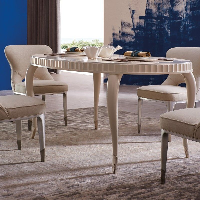 Овальный обеденный стол от итальянского бренда Fratelli Barri. Модель с изогнутыми ножками. Основание столешницы декорировано рельефным узором. Металлические наконечники на ножках.