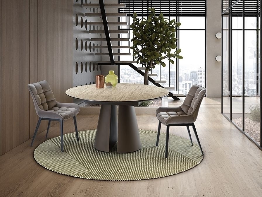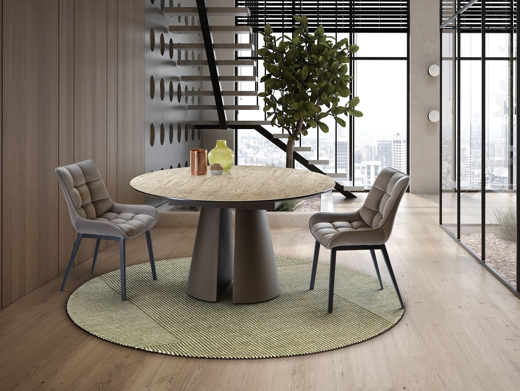 Круглый обеденный стол, каркас из металла и МДФ с оксидно-коричневой отделкой. Столешница из МДФ с высокопрочной меламиновой поверхностью, отделка травертин, с окисно-коричневыми краями.