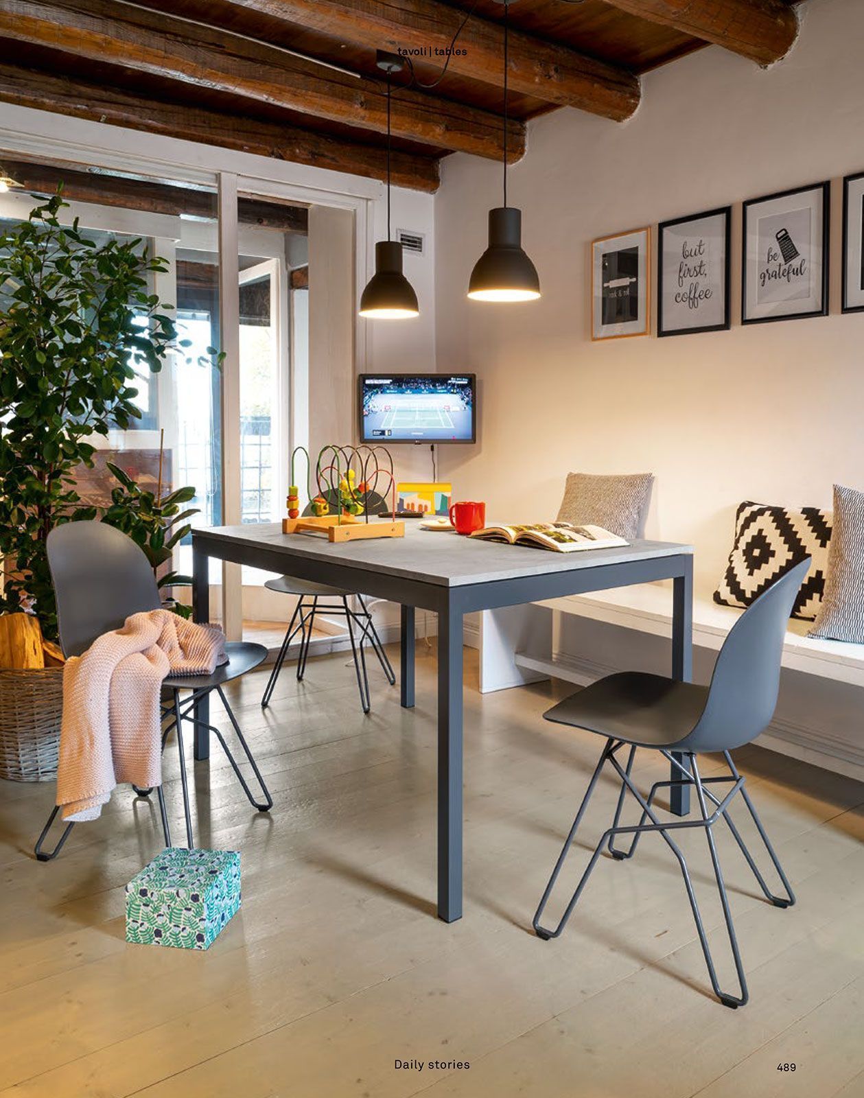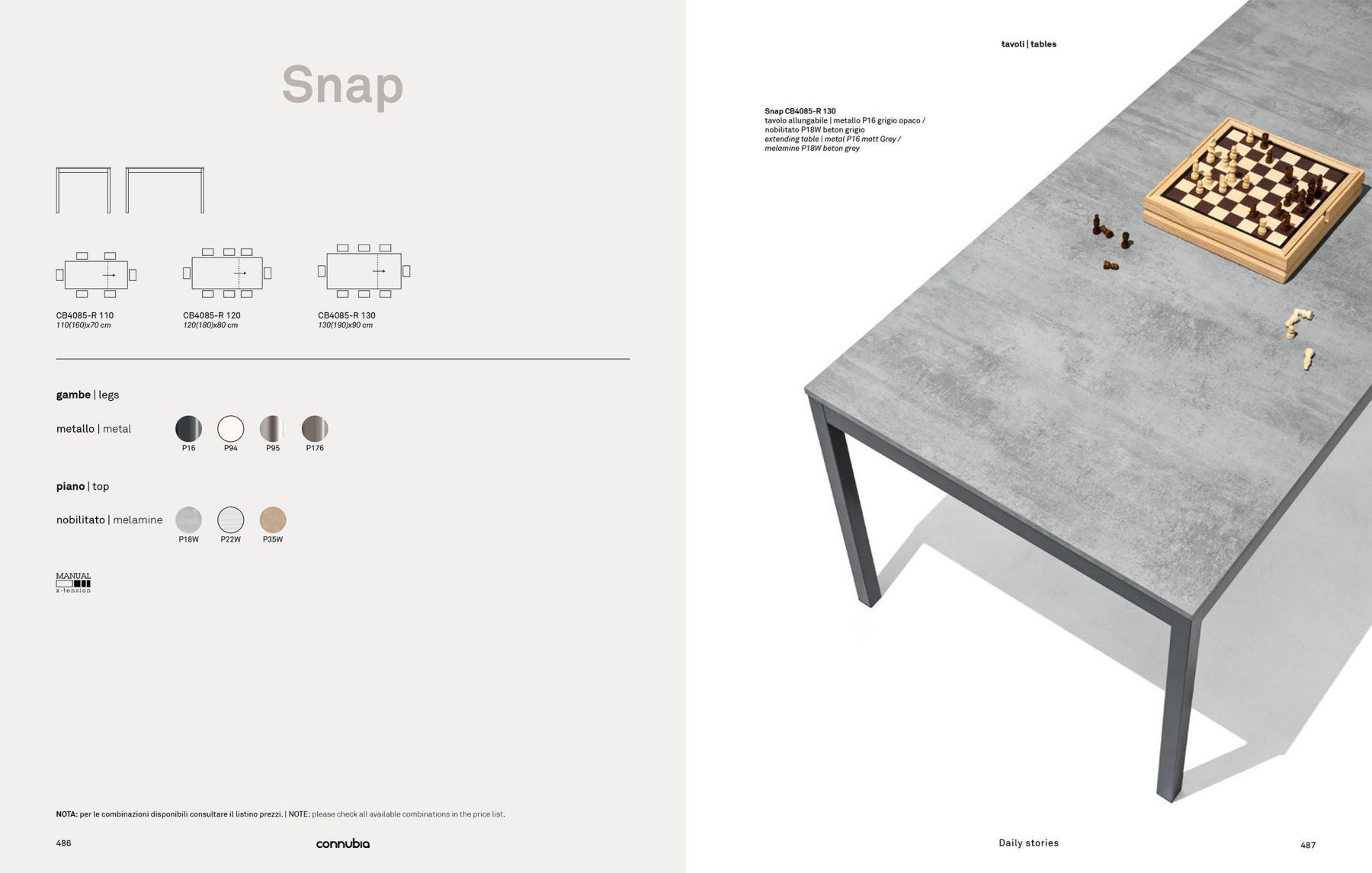 Стол итальянской фабрики Connubia. Доступен в большом количестве размеров, цветов и материалов. Ножки и подстолье выполнены из металла, столешница покрыта ламинатом. Стол раздвижной — оснащён полуавтоматическим механизмом раскладывания, по умолчанию с одной вставкой +50 см. В разложенном виде столешница 160 см. Раскладные элементы прячутся внутрь стола. В нашем шоу-руме можно ознакомиться с качеством мебели Connubia и выбрать материалы отделки.