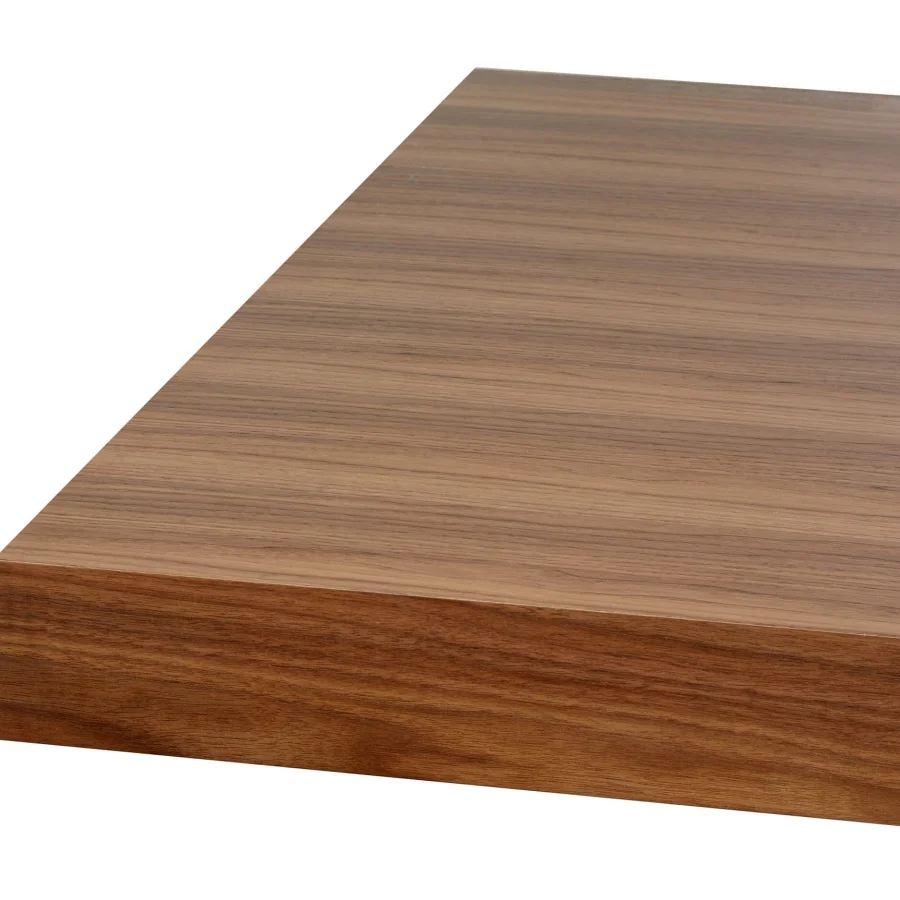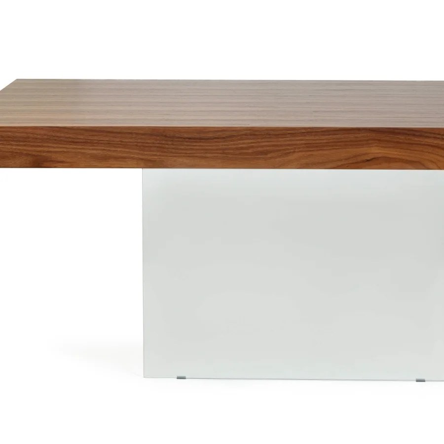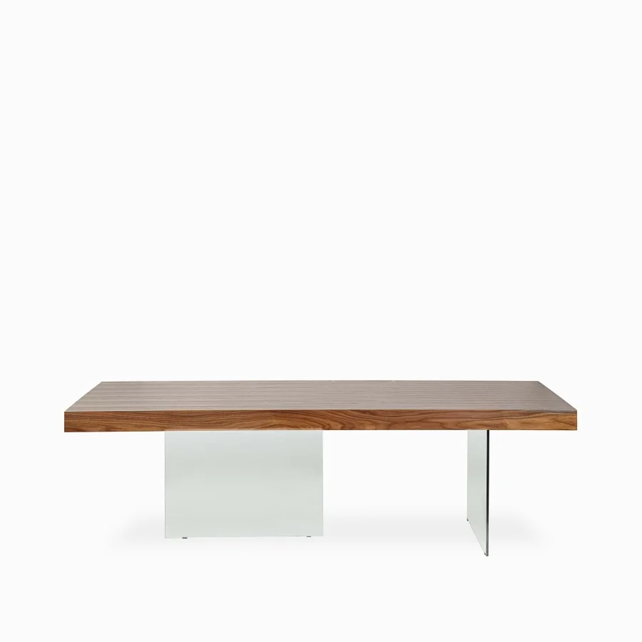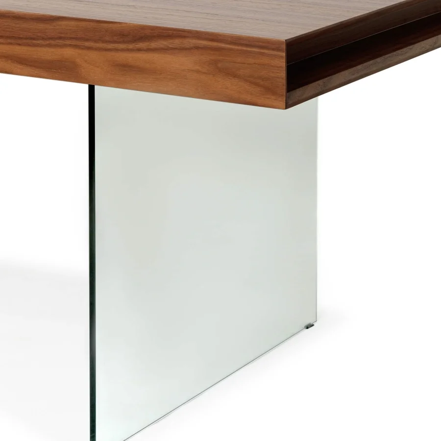 Прозрачные ножки создают впечатление невесомости, а богатая текстура орехового шпона добавляет глубину и характер.