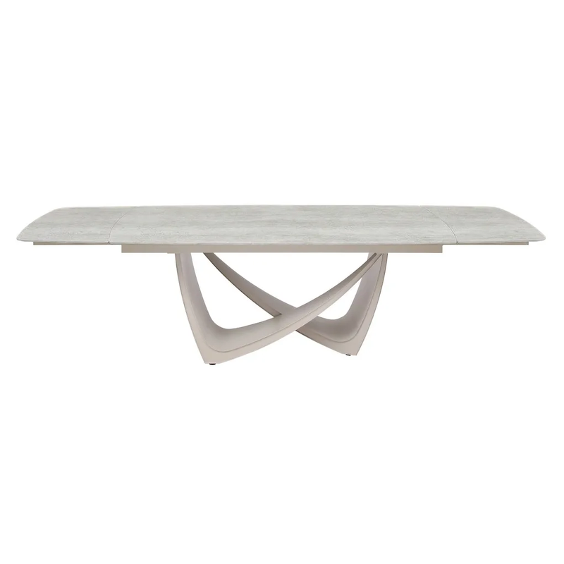 Стол является центром внимания в столовой. Его футуристичное основание из высококачественного металла с бежевым порошковым покрытием — это скульптура, на которой покоится идеально гладкая столешница из спеченного камня (12 мм). Этот материал невероятно прочен, стоек к царапинам и нагреву, а его матовая поверхность выглядит дорого и тактильно приятна.