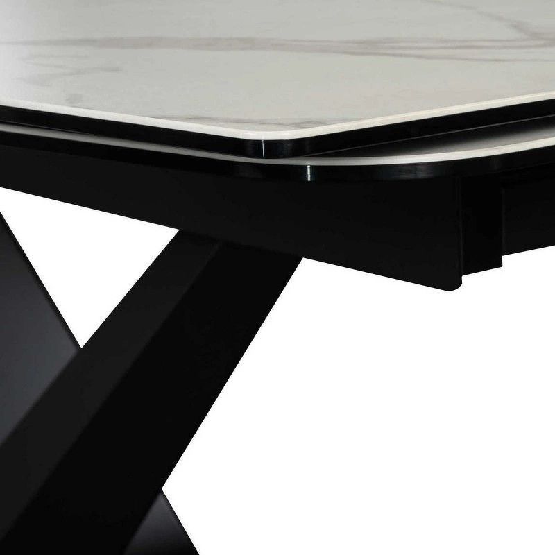 Столешница состоит из закаленного стекла (8 мм) нижним слоем и керамики (3 мм) светло-серого с прожилками цвета верхним слоем. Подстолье и ноги - прочный металл с максимально стойким к внешним воздействиям порошковым покрытием черного цвета.