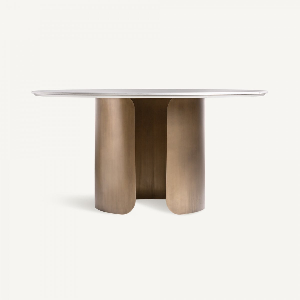 Обеденный стол vimperk, белый/золотой цвет, стиль арт-деко. Изготовлен из мрамора в сочетании со сталью. Съемный продукт.