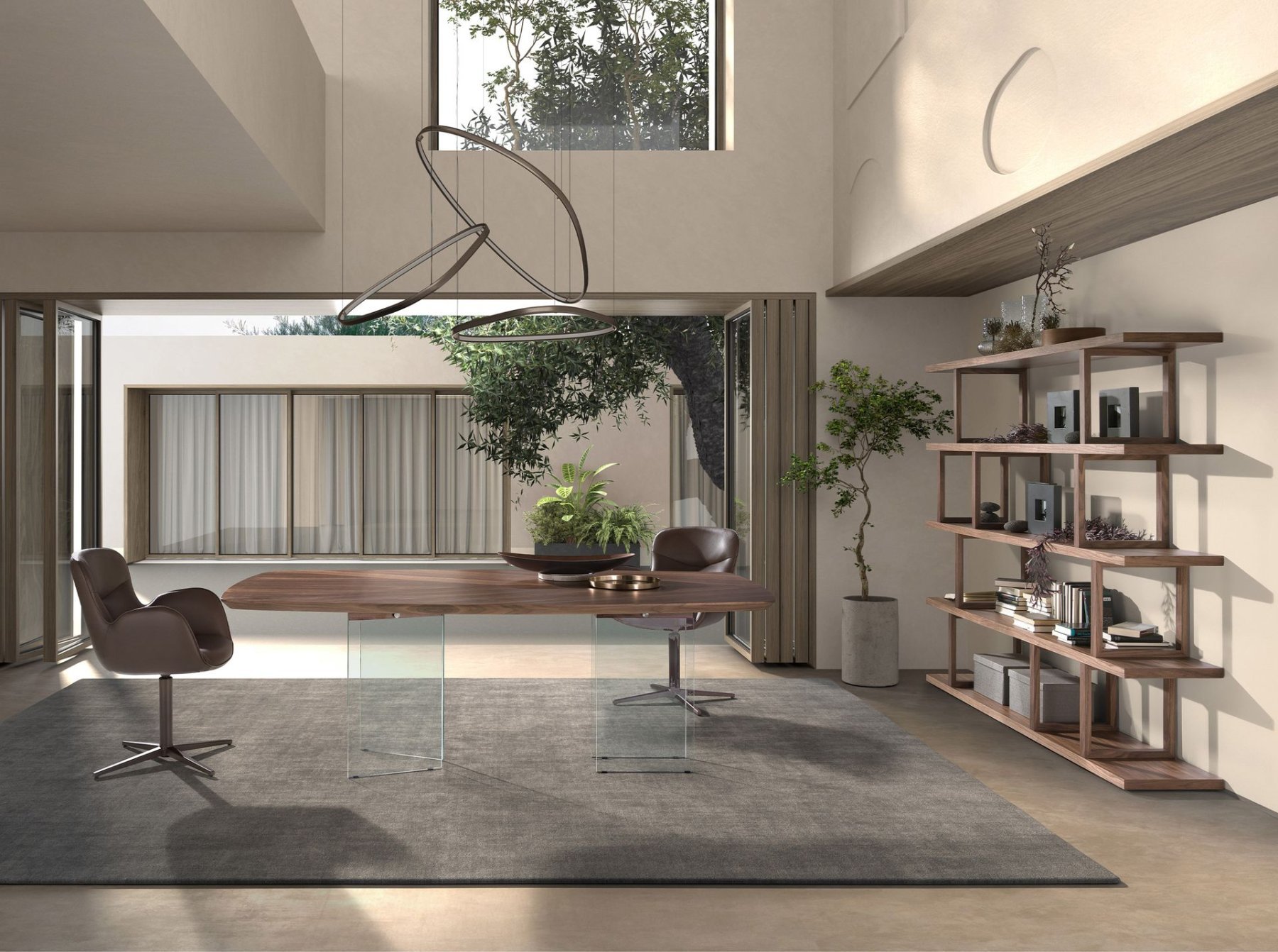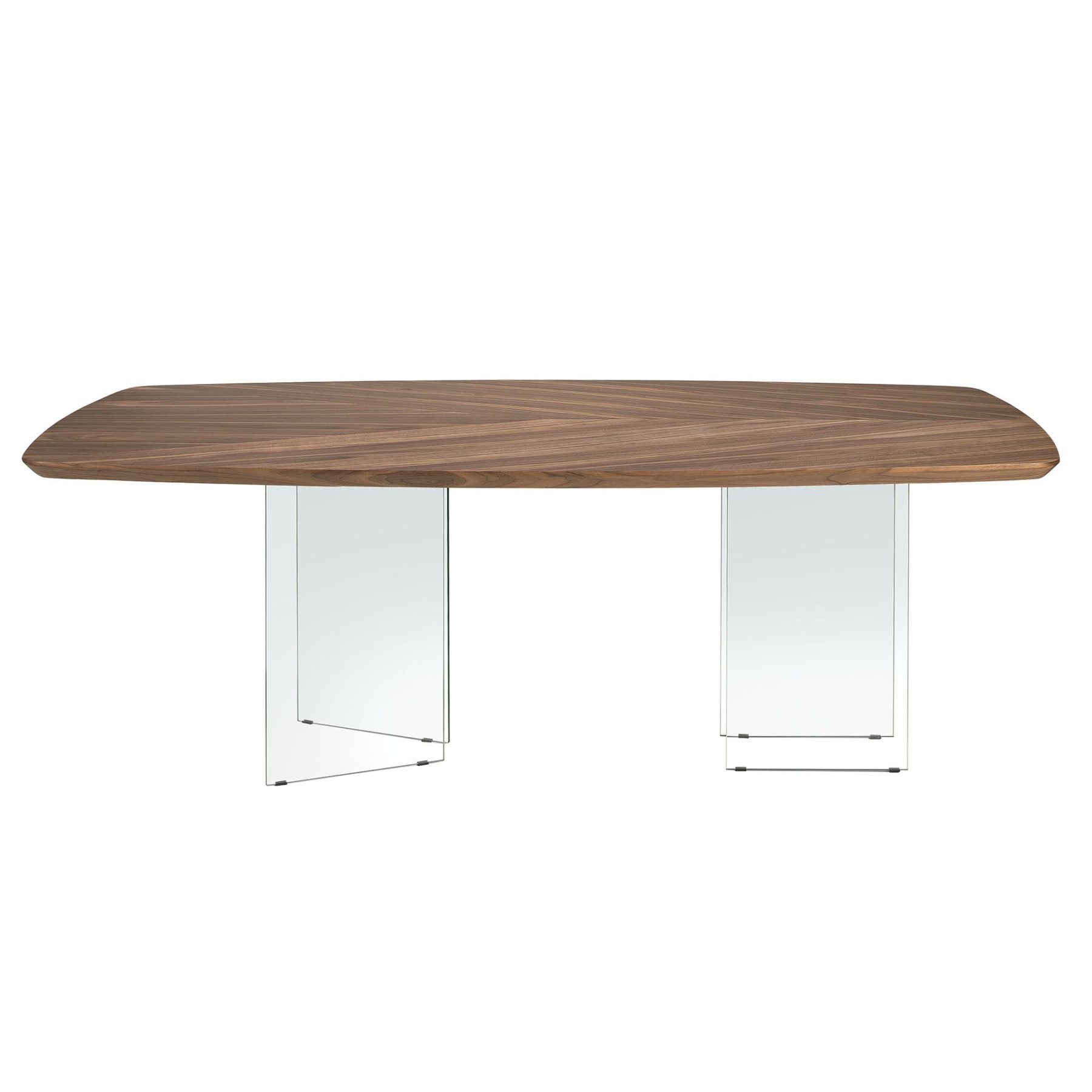 Современный овальный обеденный стол бочкообразной формы с фиксированной столешницей из натурального орехового шпона. Оригинальные ножки из закаленного стекла являются ключевыми элементами, выделяющими его дизайн.