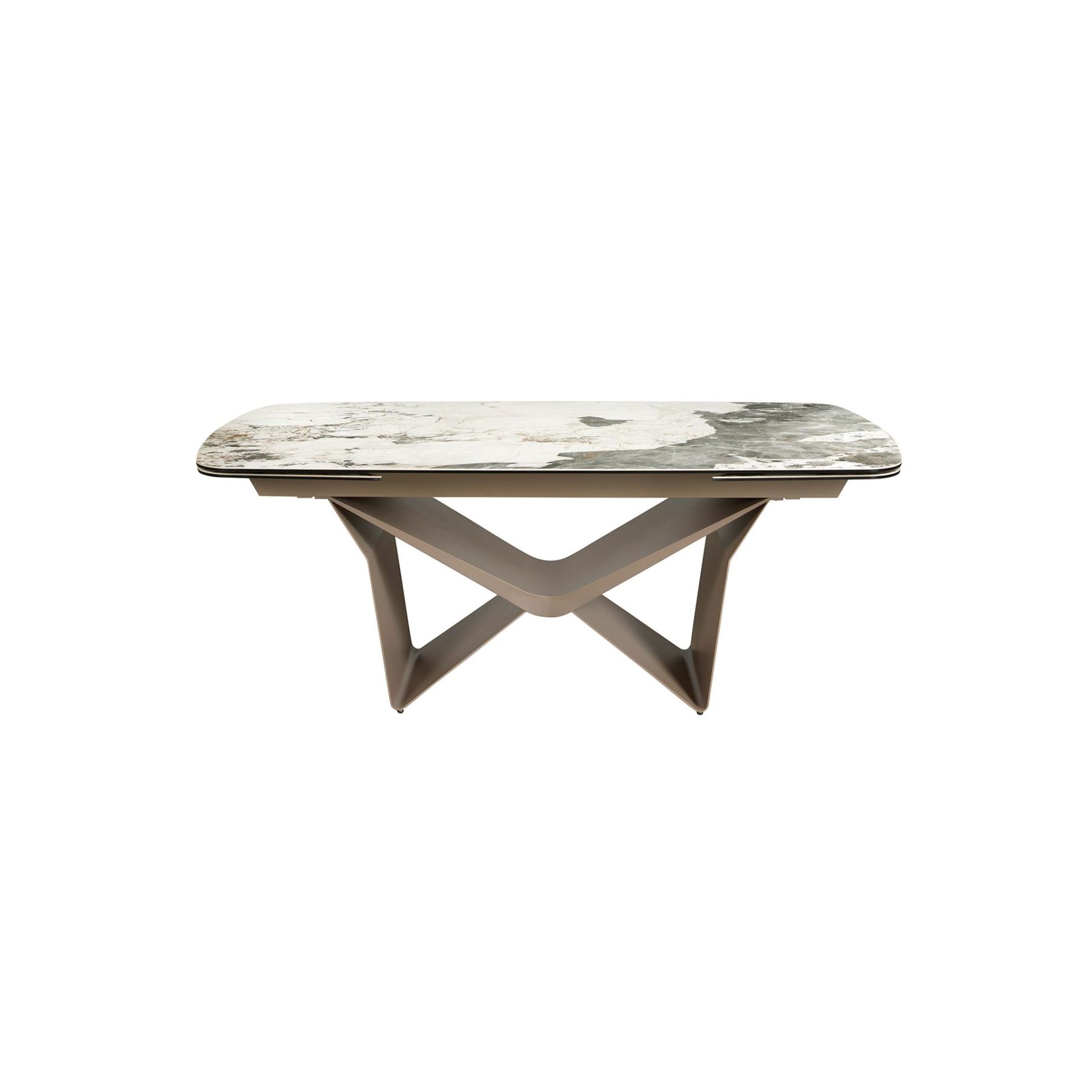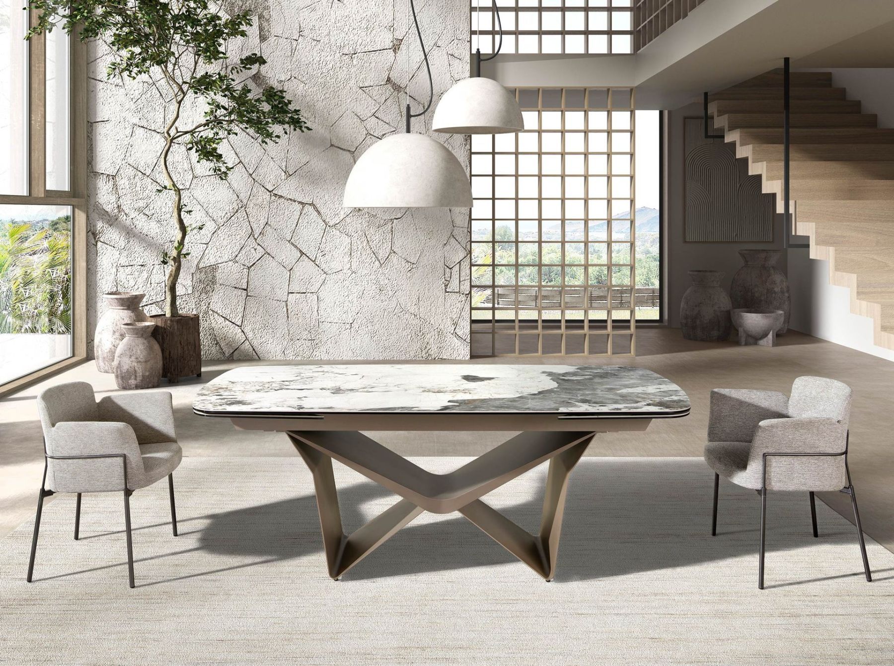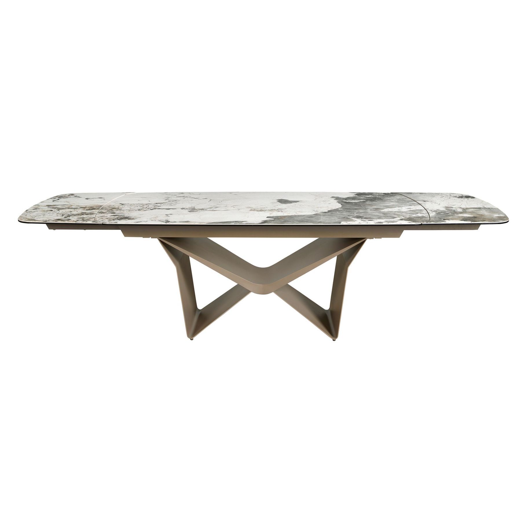 Овальный бочкообразный раздвижной обеденный стол с современным дизайном , с белой фарфоровой мраморной столешницей с серыми и коричневыми прожилками в матовой отделке . Его ножки из нержавеющей стали цвета шампанского и адаптивность делают его полностью функциональным и универсальным предметом мебели для повседневного использования.