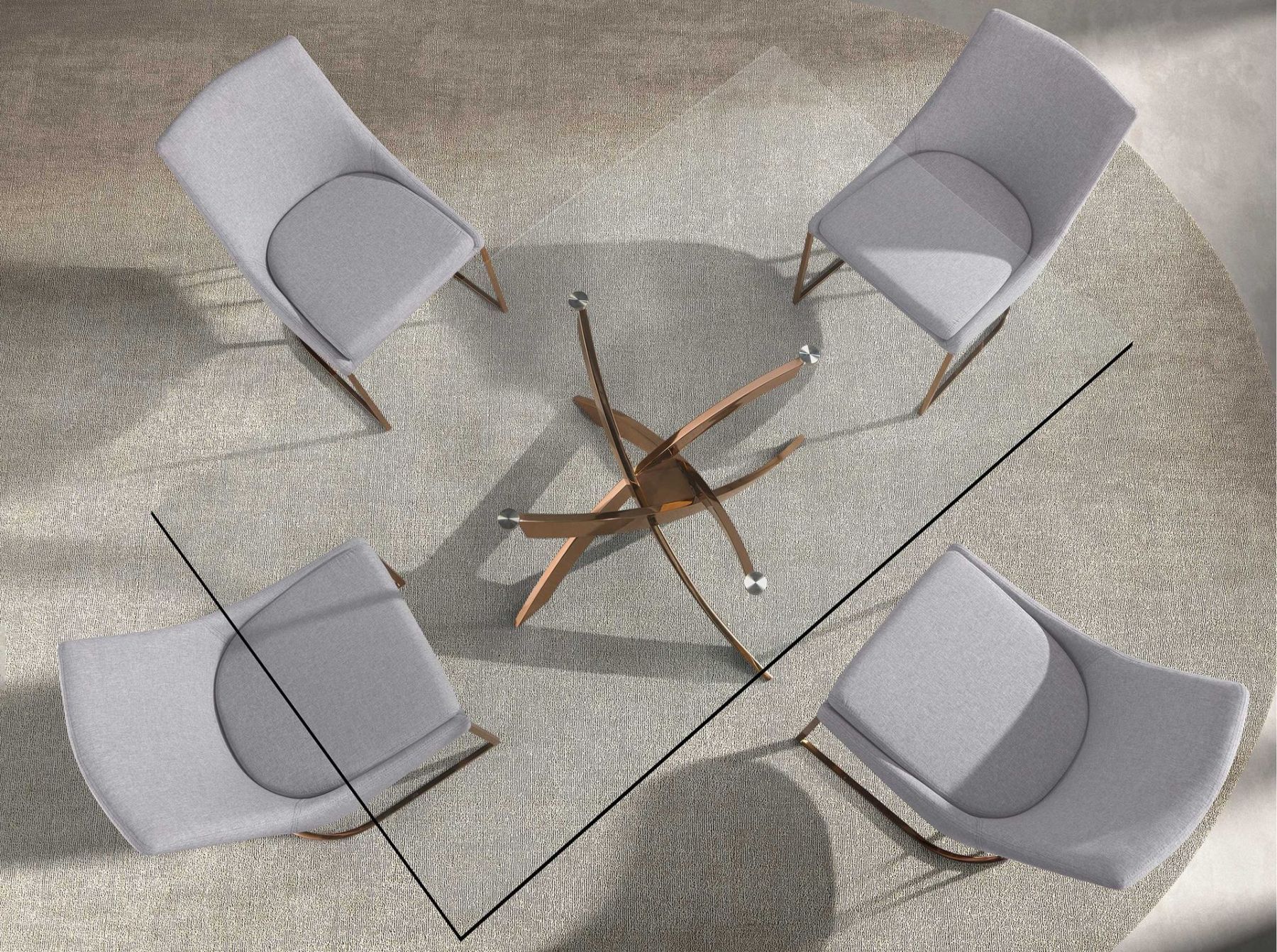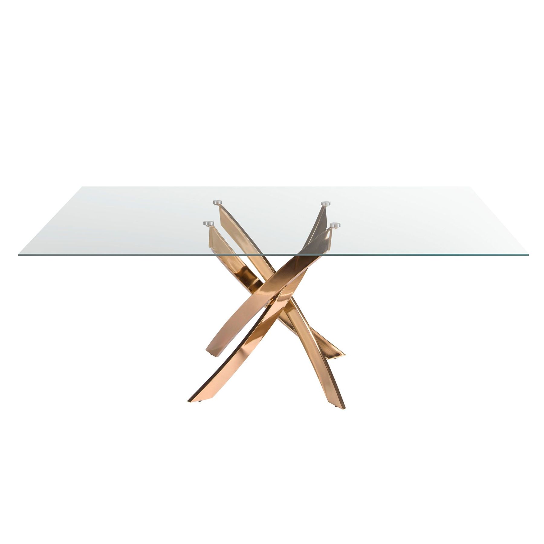 Современный прямоугольный обеденный стол с фиксированной столешницей из закаленного стекла. Его оригинальные хромированные ножки из нержавеющей стали цвета розового золота являются ключевыми элементами, подчеркивающими его дизайн.