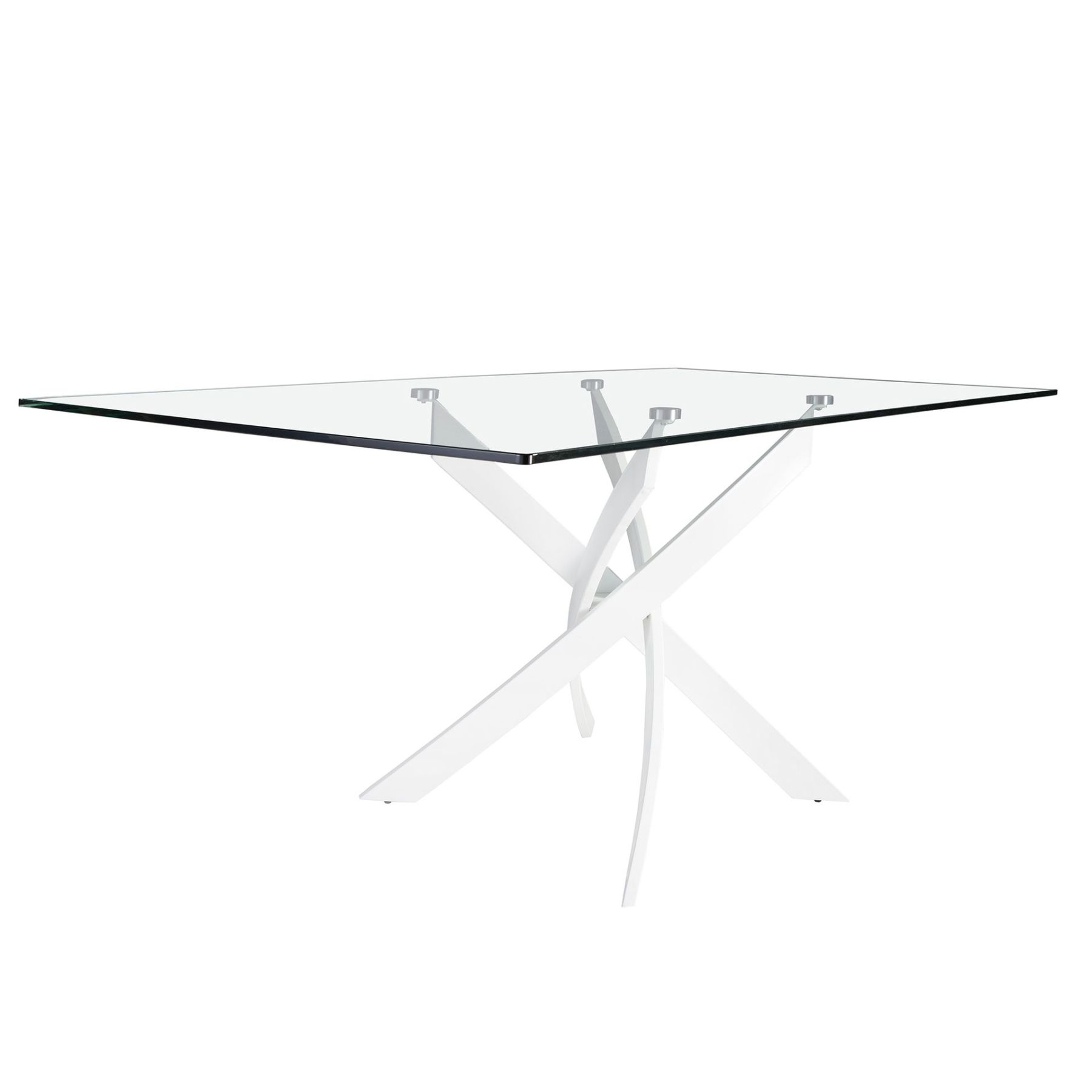 Прямоугольный обеденный стол современного дизайна со столешницей из закаленного стекла. Ключевыми элементами дизайна являются оригинальные стальные ножки, окрашенные в белый цвет.