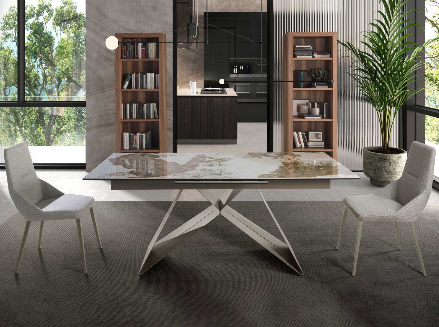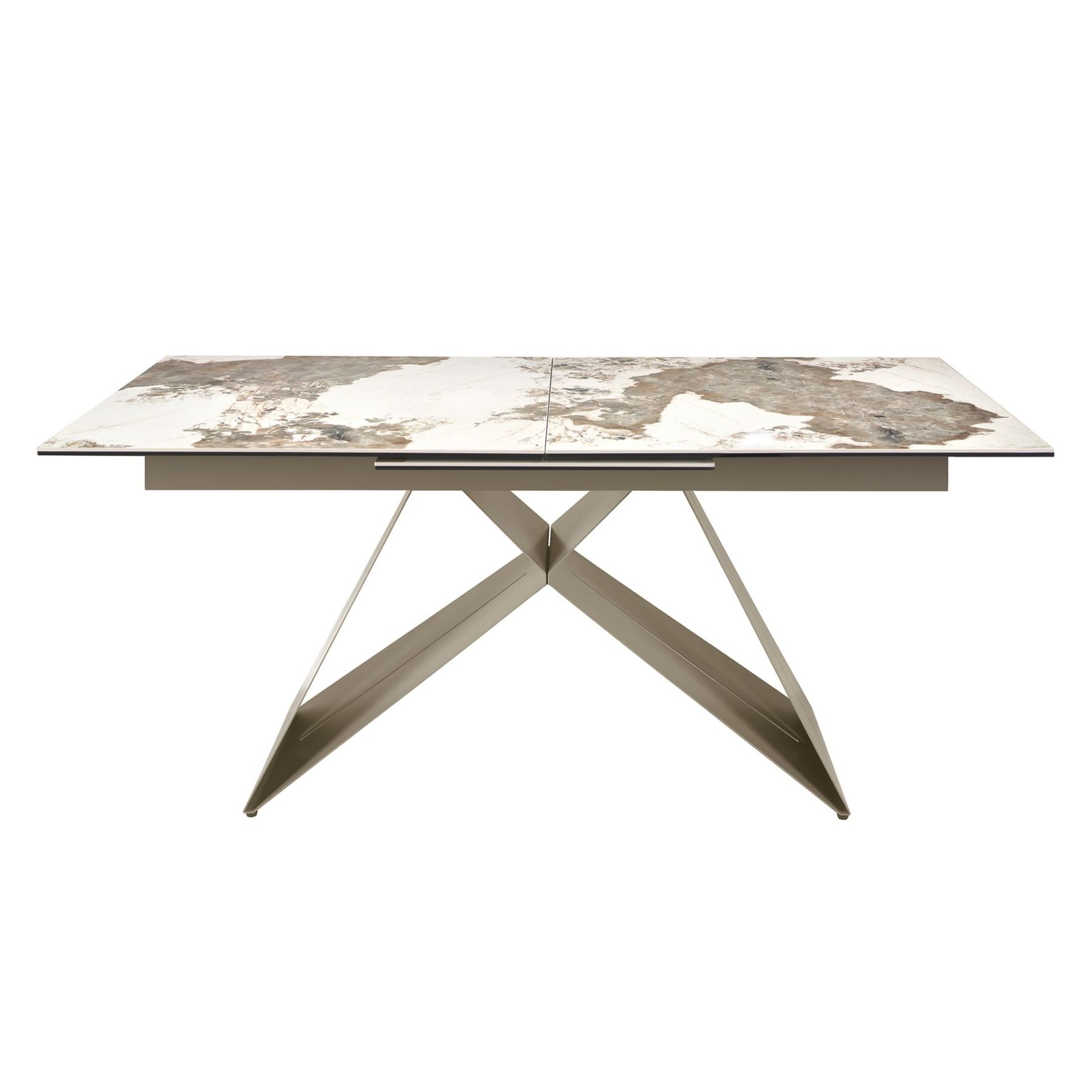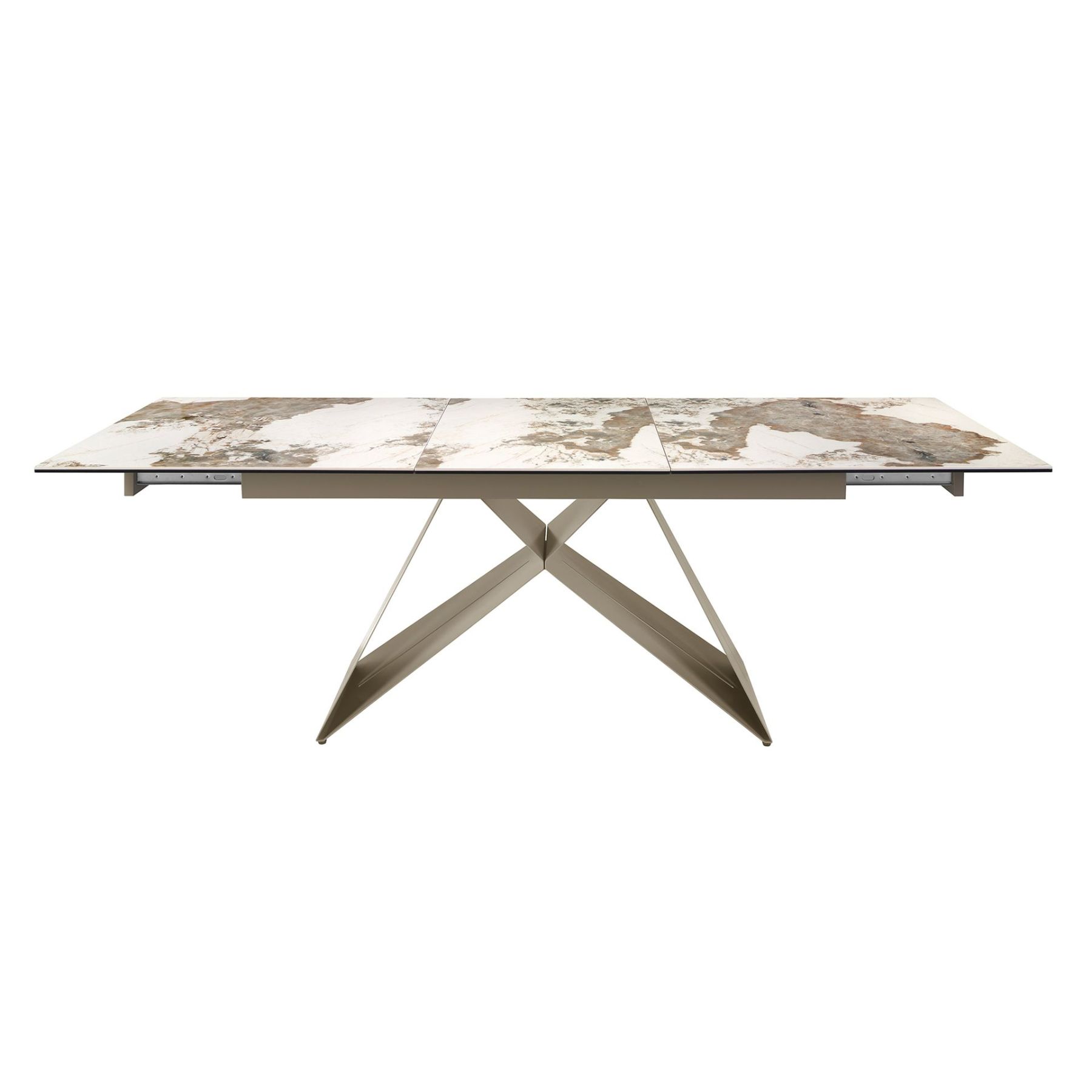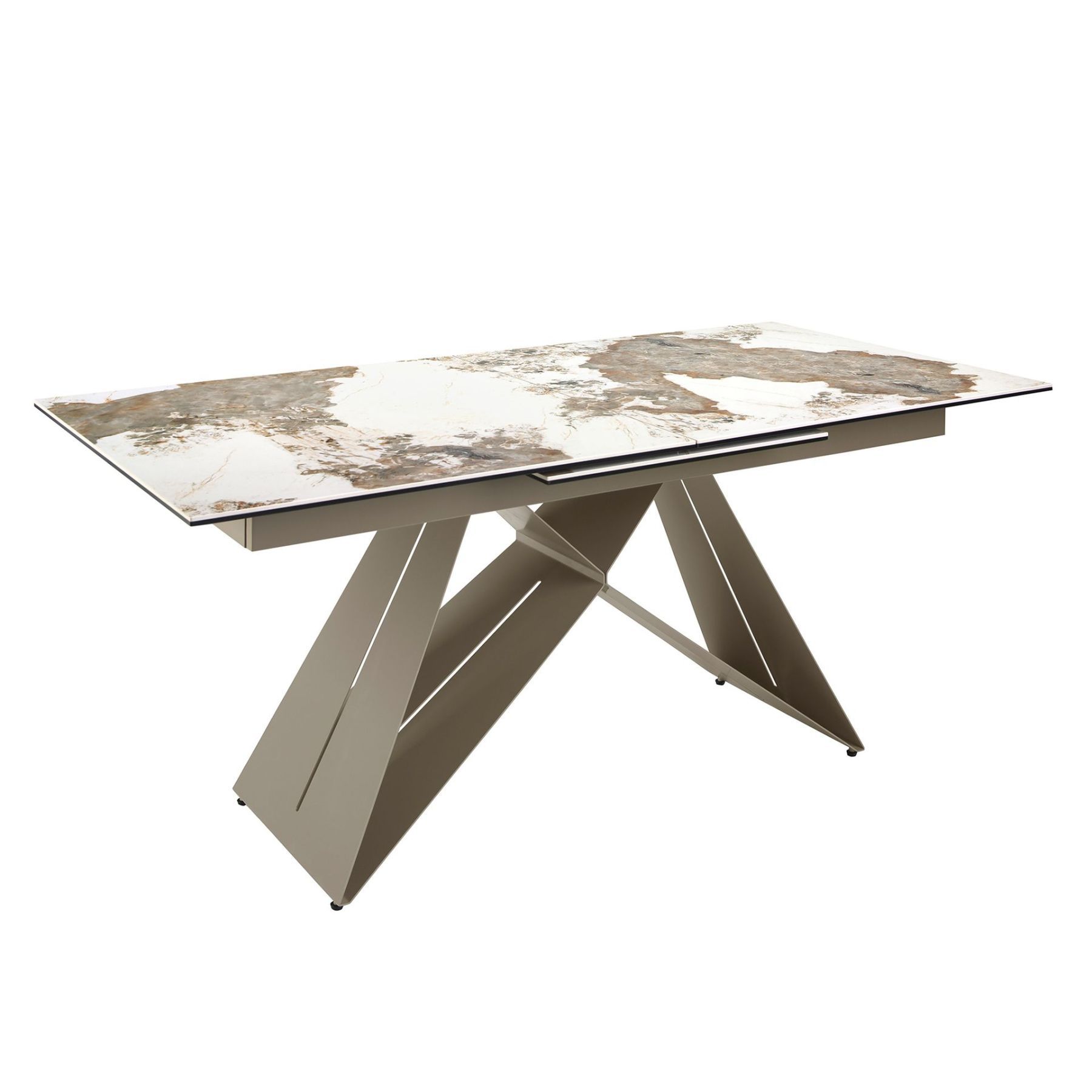 Раздвижной прямоугольный обеденный стол современного дизайна со столешницей из белого керамогранита с прожилками земляных тонов и глянцевой отделкой. Ножки из нержавеющей стали, окрашенные в цвет шампанского, а также адаптируемость делают его полностью функциональным и универсальным предметом мебели для повседневного использования.