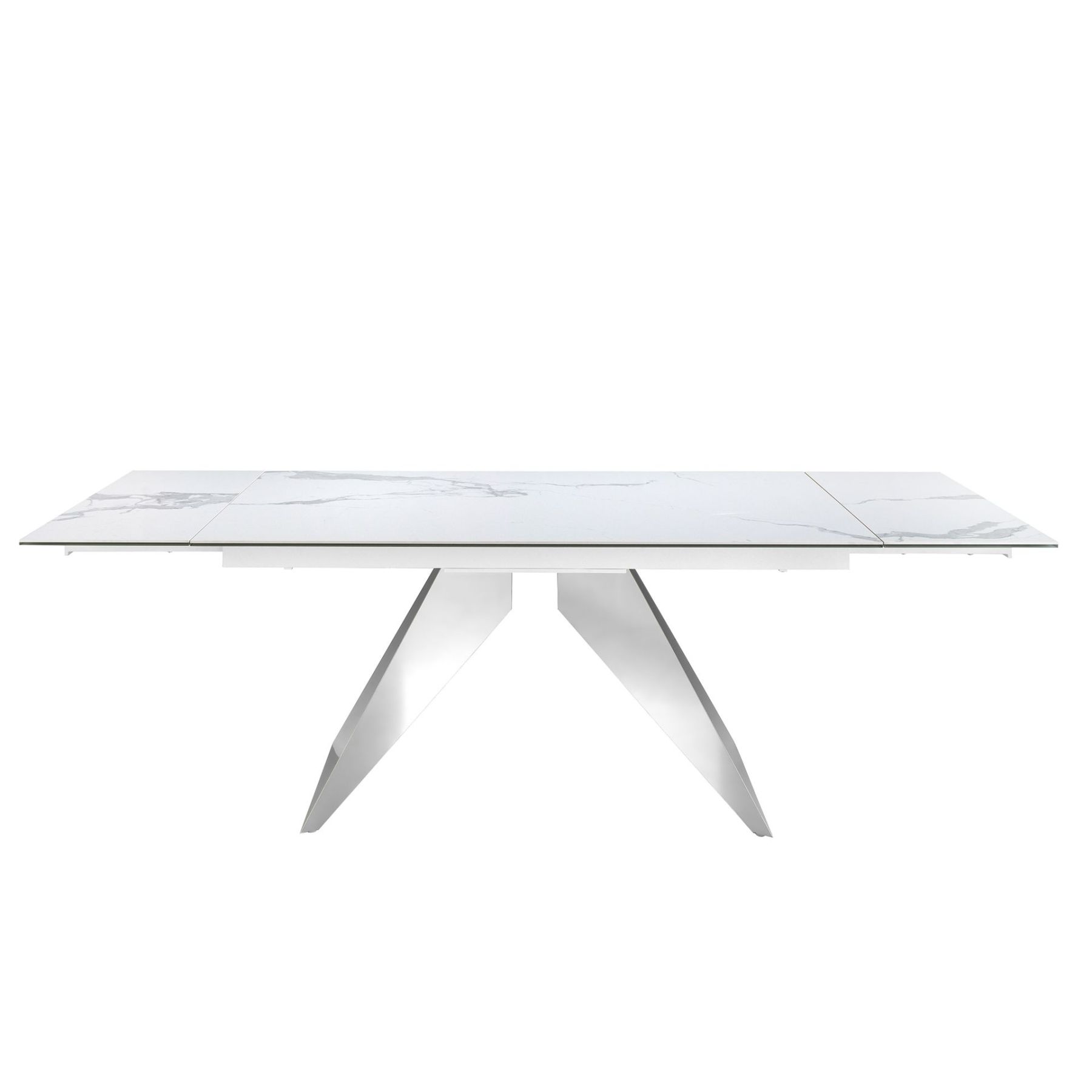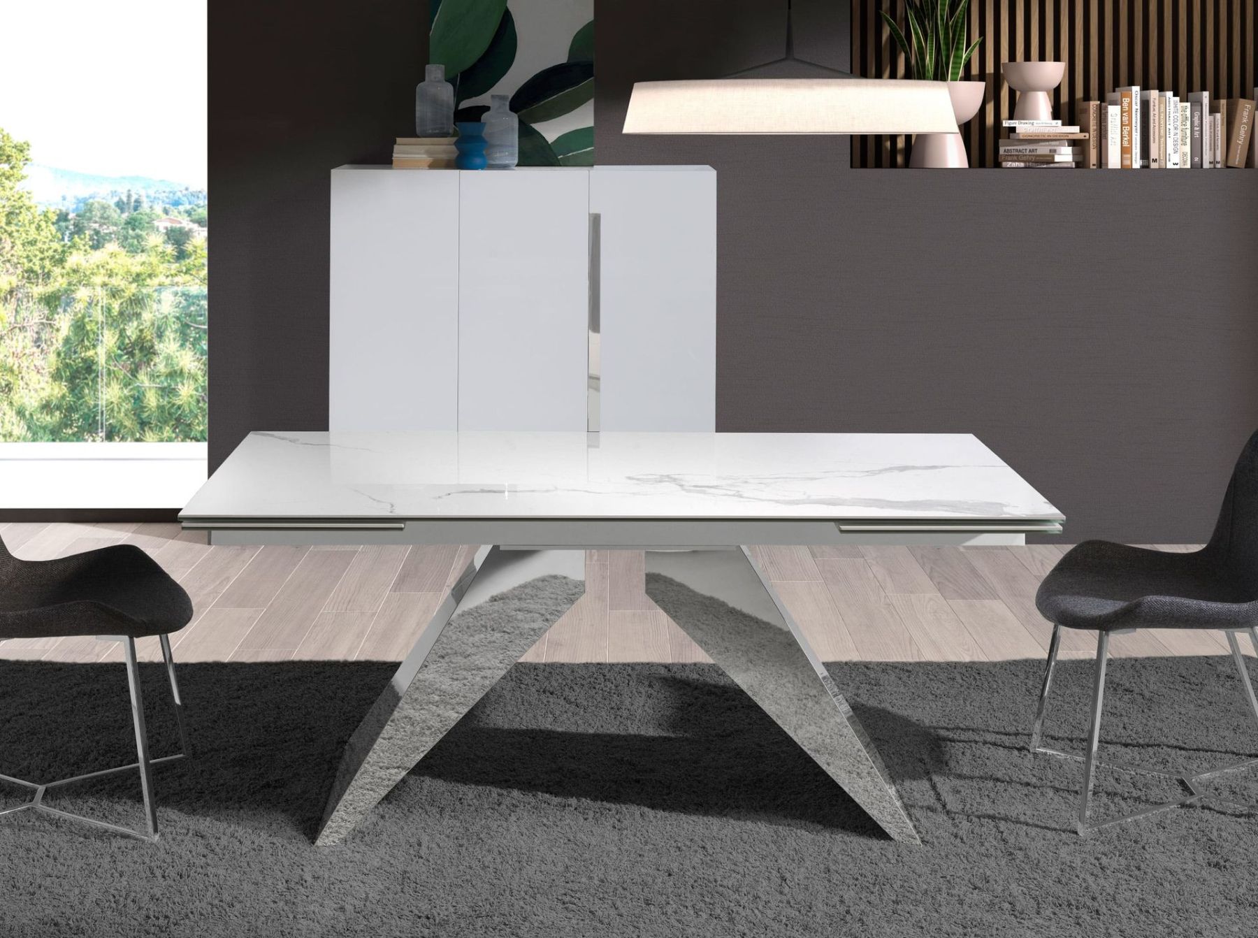 Раздвижной прямоугольный обеденный стол современного дизайна со столешницей из белого керамогранита с серыми прожилками и глянцевой отделкой. Его хромированные ножки из нержавеющей стали, а также адаптируемость делают его полностью функциональным и универсальным предметом мебели для повседневного использования.
