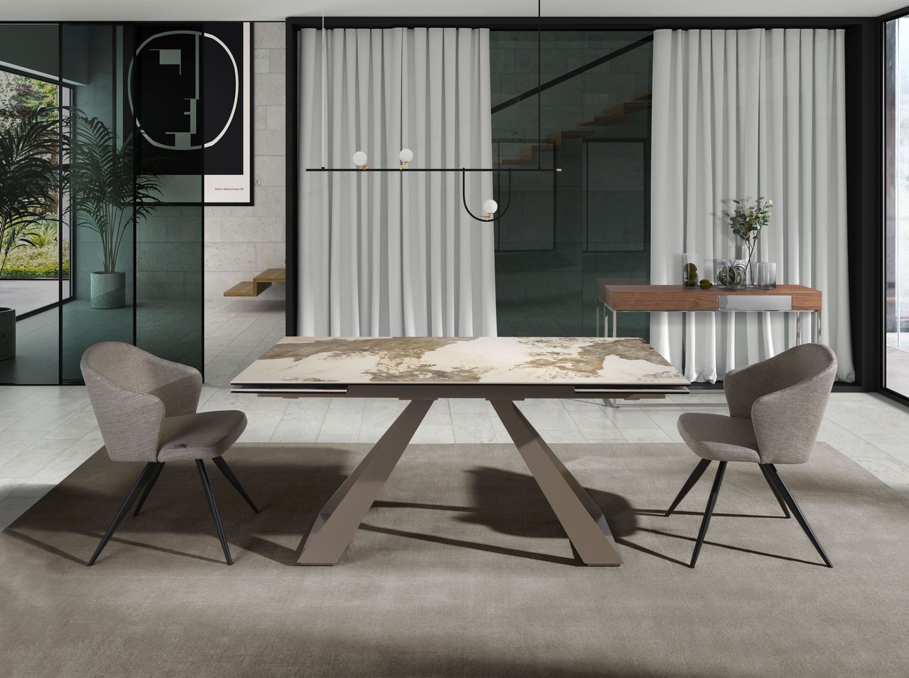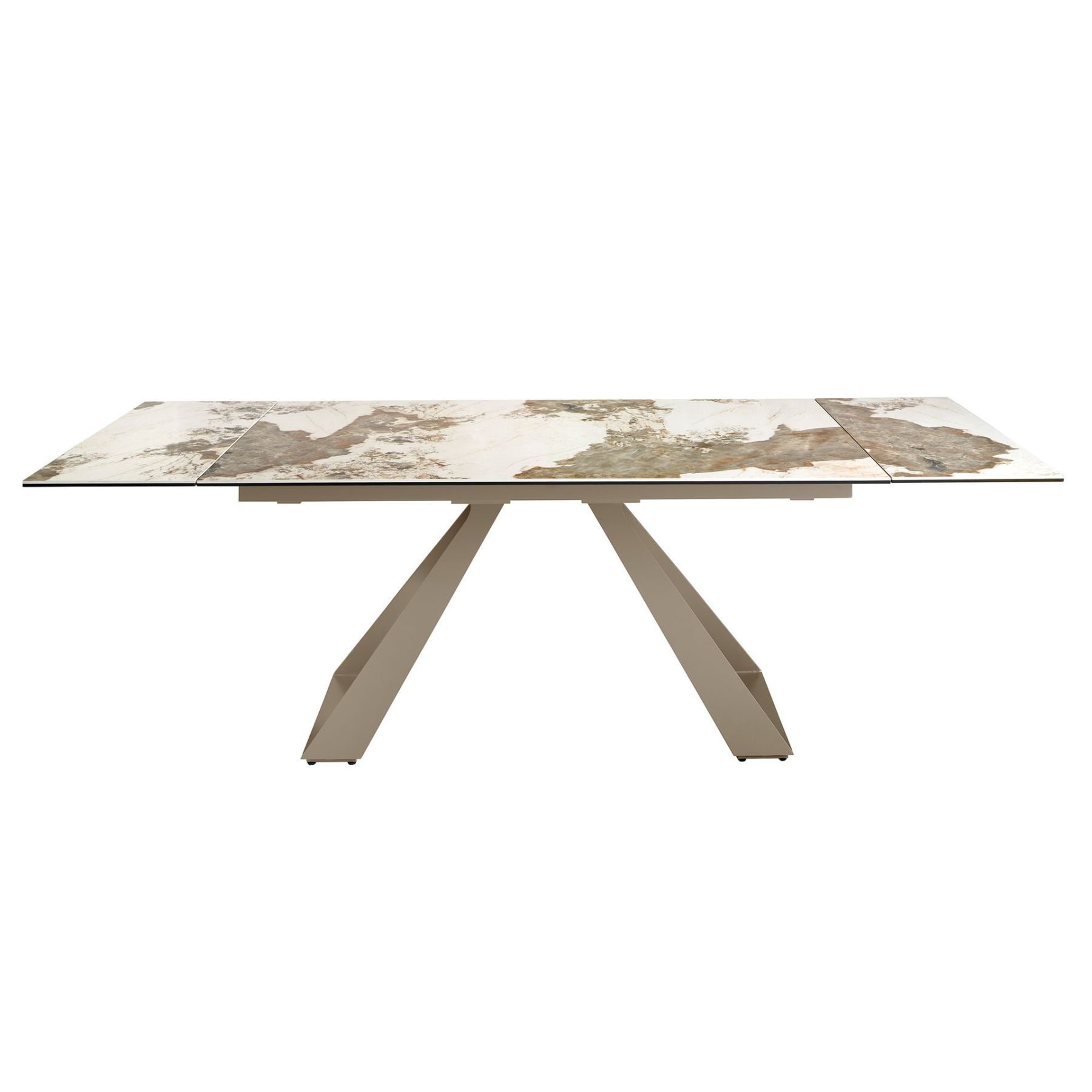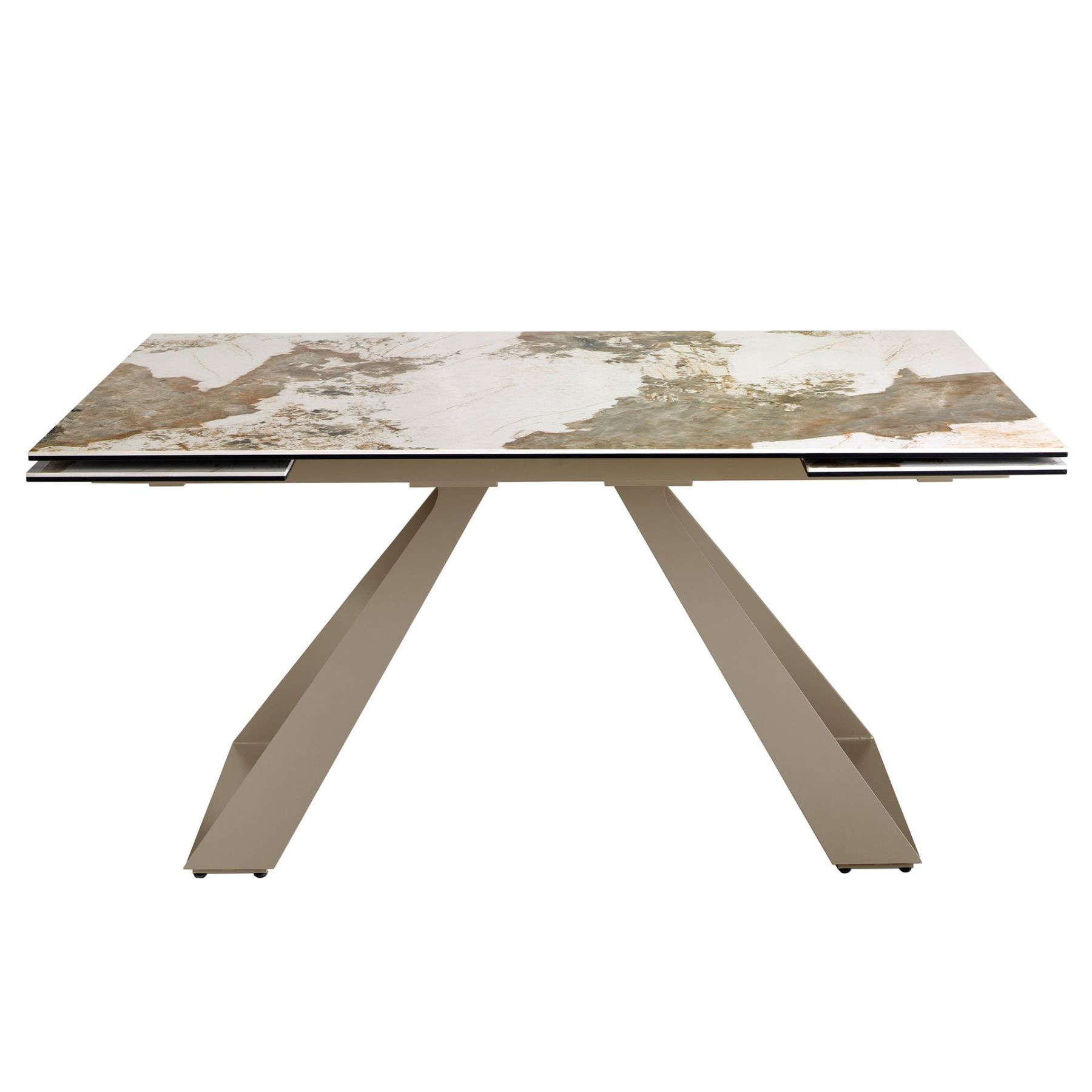 Прямоугольный раздвижной обеденный стол современного дизайна со столешницей из белого фарфора и мрамора с прожилками землистого тона с глянцевой отделкой. Ножки из нержавеющей стали, окрашенные в цвет шампанского, и адаптируемость делают его полностью функциональным и универсальным предметом мебели для повседневного использования.