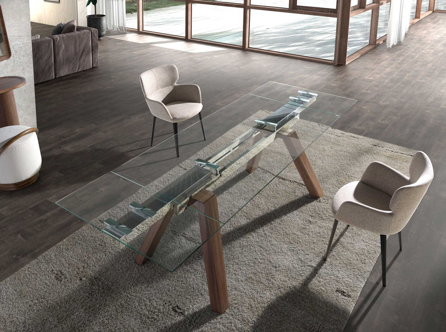 Прямоугольный раздвижной обеденный стол современного дизайна со столешницей из закаленного стекла. Деревянные ножки, покрытые шпоном натурального ореха, а также адаптируемость делают его полностью функциональным и универсальным предметом мебели для повседневного использования.