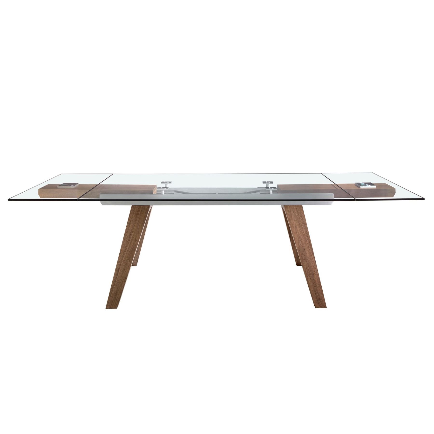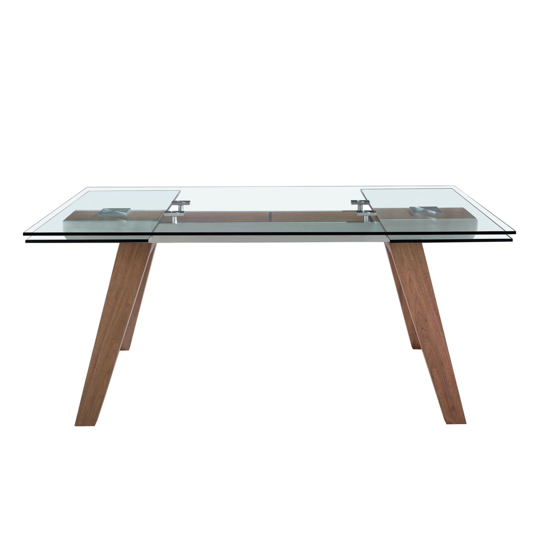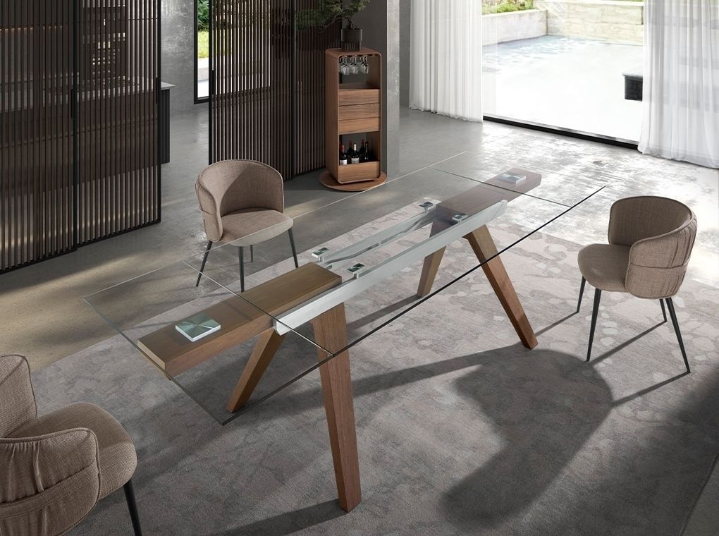 Прямоугольный раздвижной обеденный стол современного дизайна со столешницей из закаленного стекла. Его деревянные ножки, покрытые шпоном натурального ореха, а также адаптируемость делают его полностью функциональным и универсальным предметом мебели для повседневного использования.