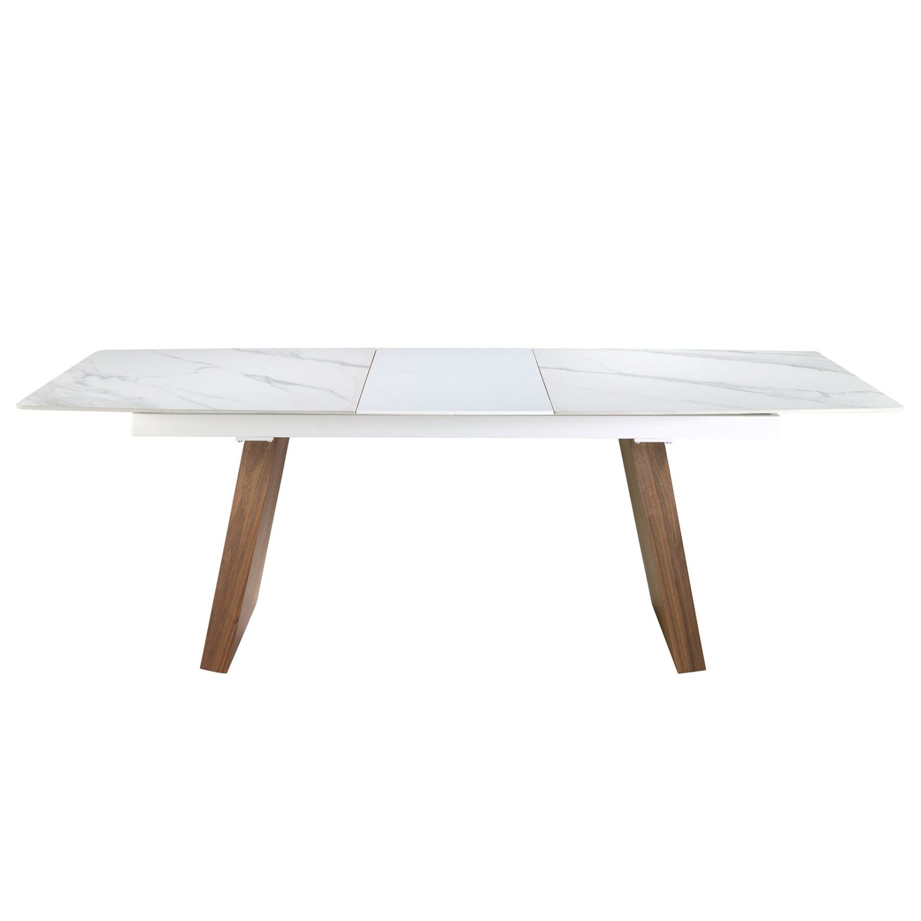 Раздвижной овальный обеденный стол современного дизайна со столешницей из белого фарфорового мрамора с серыми прожилками и матовой отделкой. Его деревянные ножки, покрытые шпоном натурального ореха, а также адаптируемость делают его полностью функциональным и универсальным предметом мебели для повседневного использования.