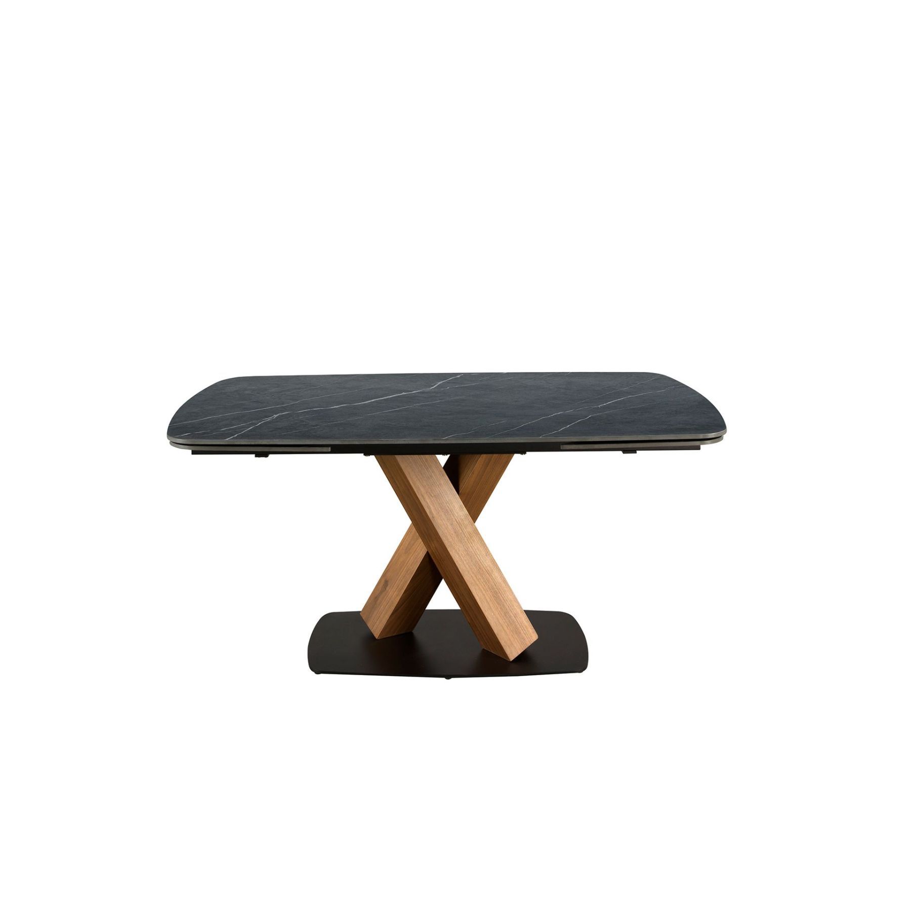 Современный дизайн овального раздвижного обеденного стола с черной фарфоровой мраморной столешницей с белыми прожилками с эффектом камня в сатиновой отделке. Его деревянные ножки, покрытые натуральным ореховым шпоном, вместе с основанием из нержавеющей стали с черной эпоксидной краской, а также его адаптивность делают его полностью функциональным и универсальным предметом мебели для повседневного использования.