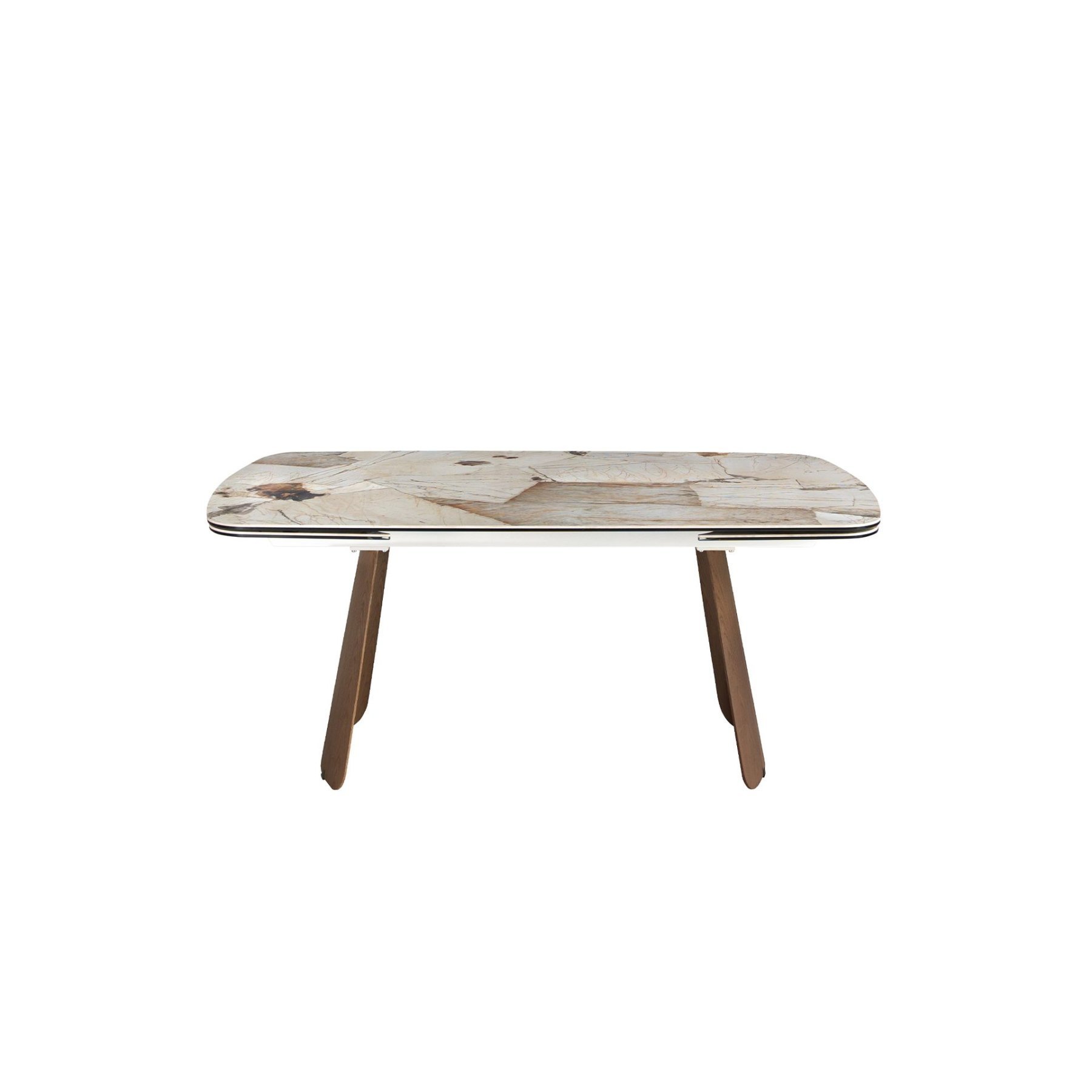 Современный овальный раздвижной обеденный стол бочкообразной формы с белой столешницей из фарфорового мрамора с узорами цвета ржавчины и темно-серыми оттенками в глянцевой отделке. Ножки из натурального орехового шпона и универсальность делают его полностью функциональным и подходящим для повседневного использования предметом мебели.