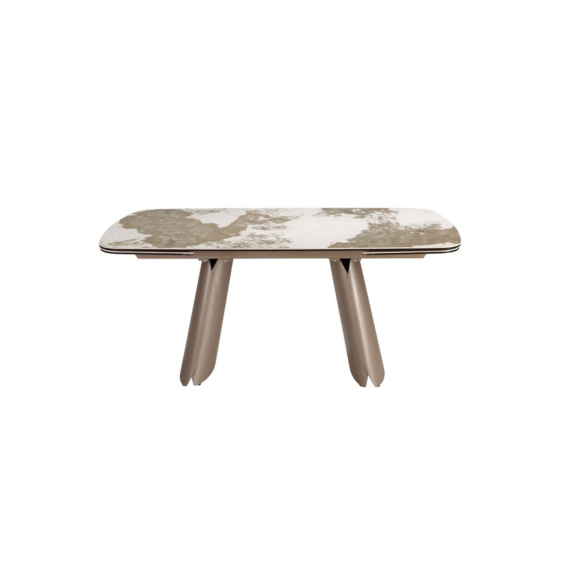 Современный раздвижной овальный обеденный стол бочкообразной формы с белой столешницей из фарфорового мрамора с прожилками земляных оттенков и глянцевой отделкой. Ножки из нержавеющей стали, окрашенные в металлический серо-коричневый цвет, а также универсальность делают его полностью функциональным и подходящим для повседневного использования.