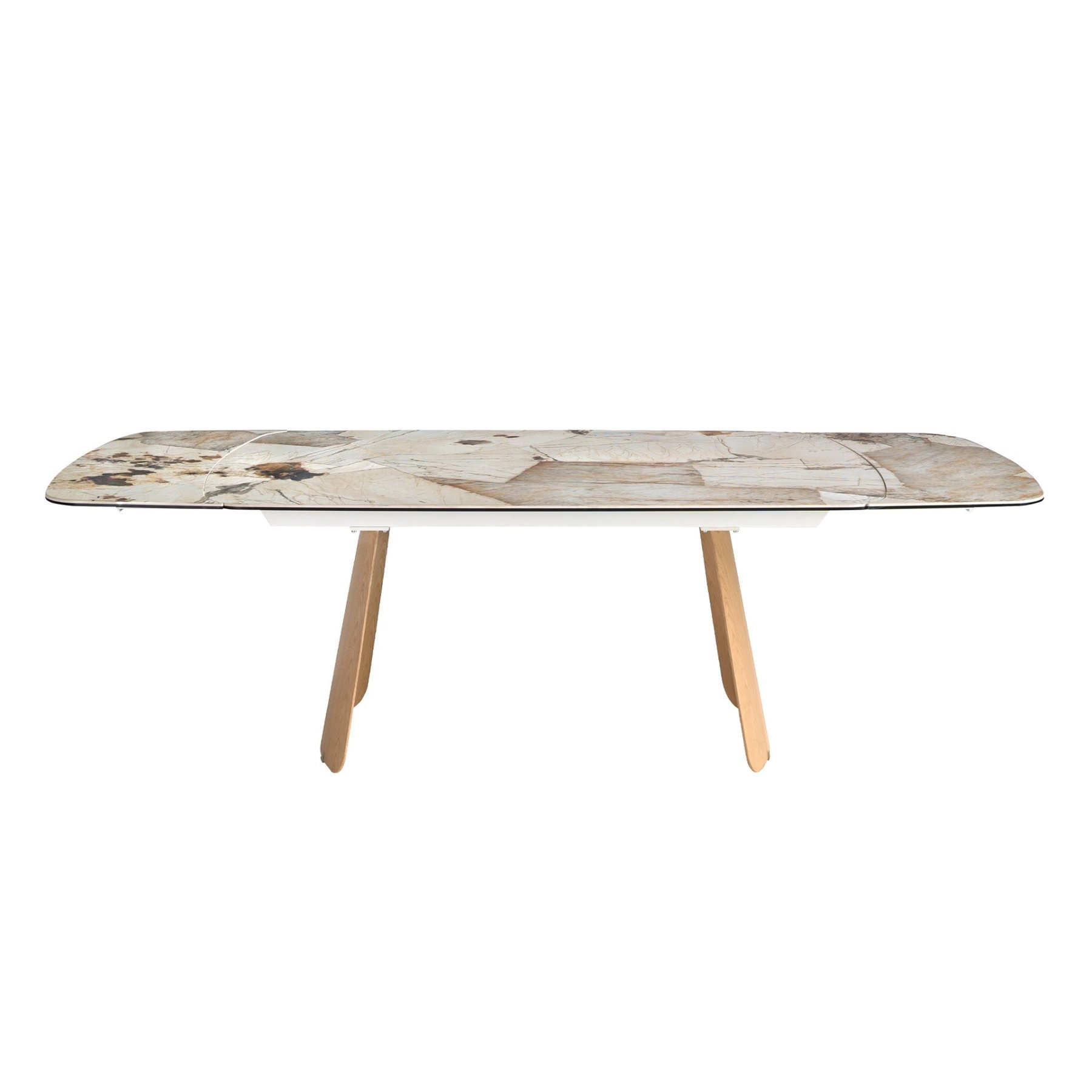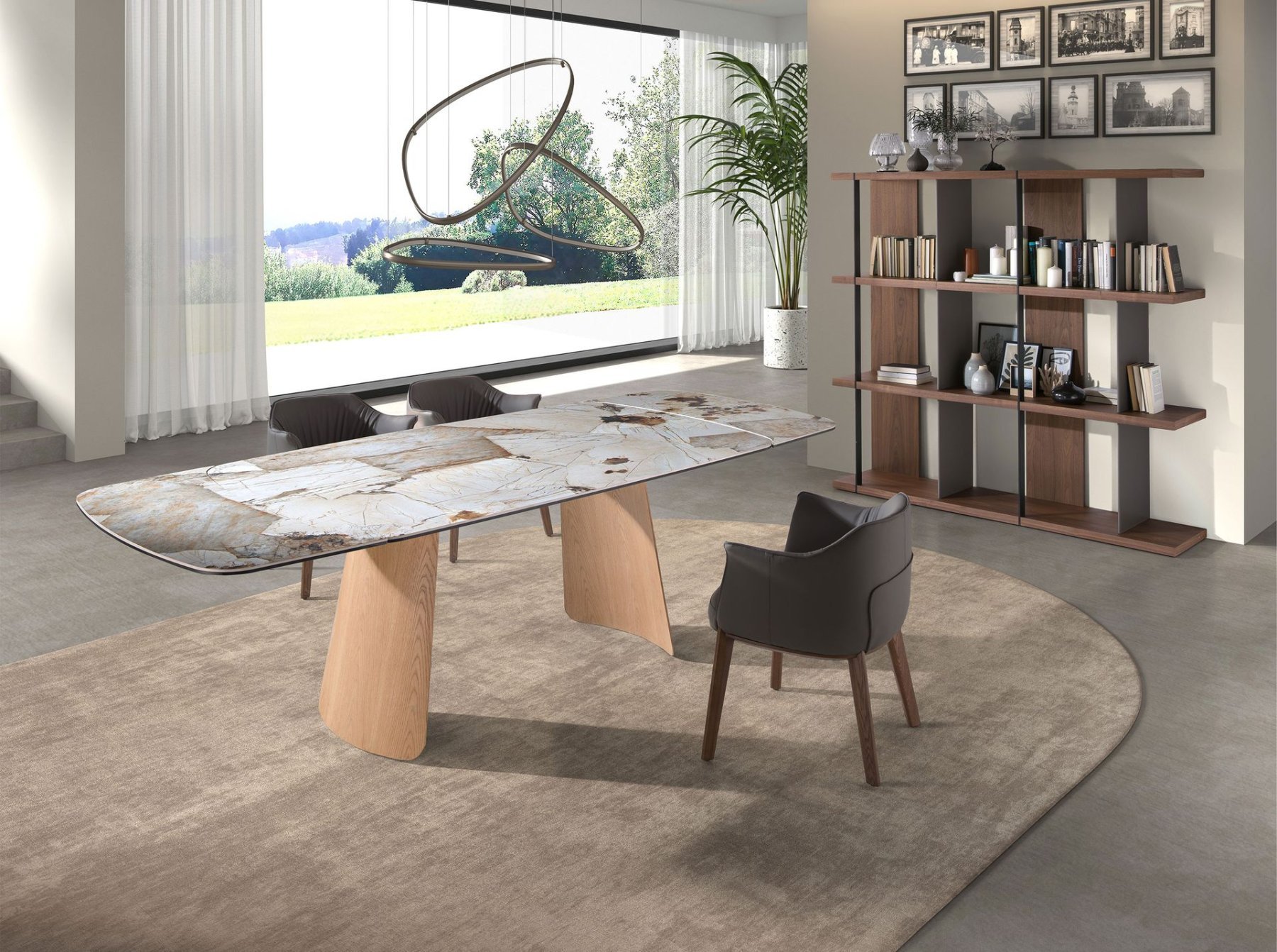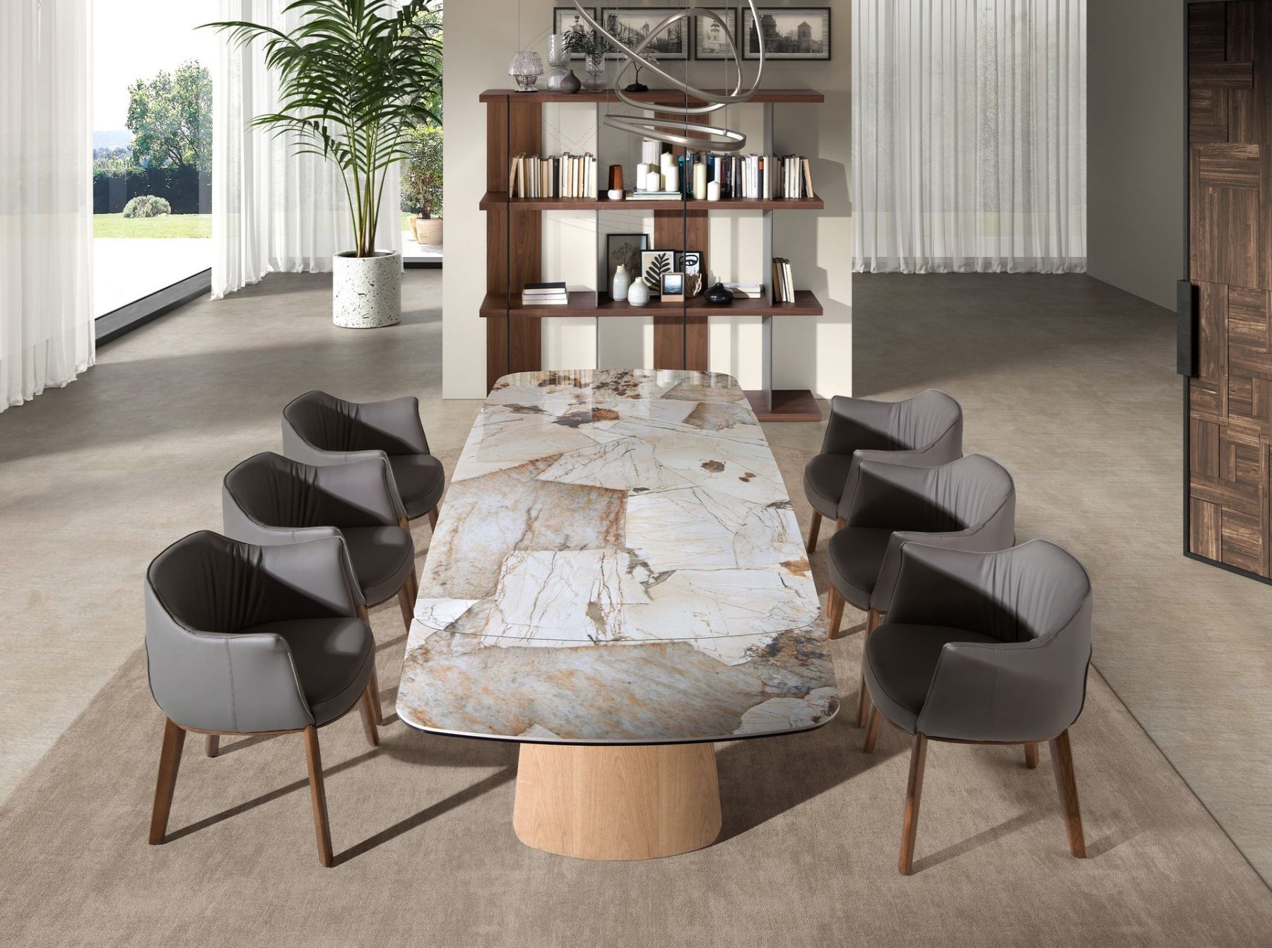 Современный овальный раздвижной обеденный стол бочкообразной формы с белой столешницей из фарфорового мрамора с узорами ржавого цвета и темно-серыми оттенками в глянцевой отделке. Ножки из дубового шпона и универсальность делают его полностью функциональным предметом мебели для повседневного использования.