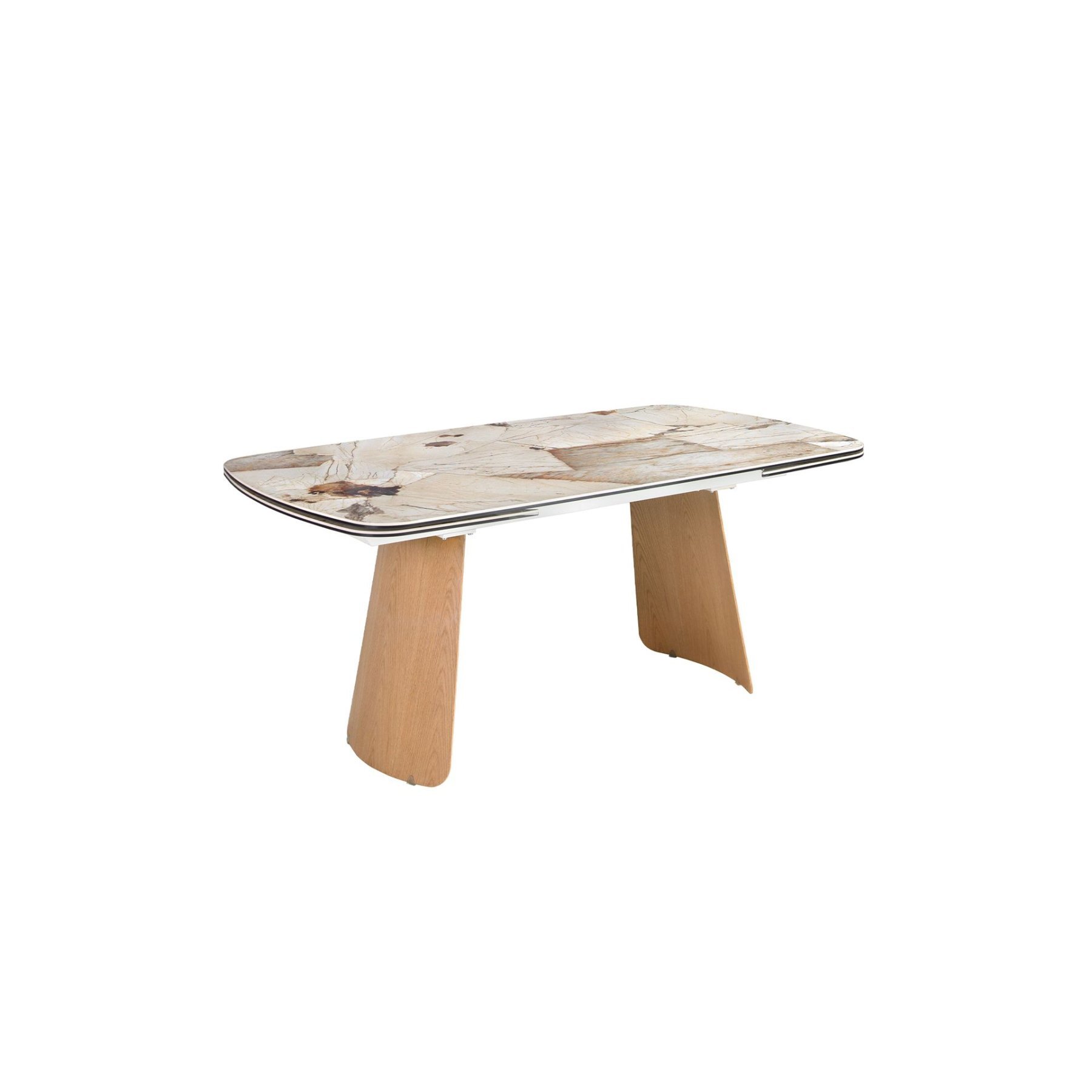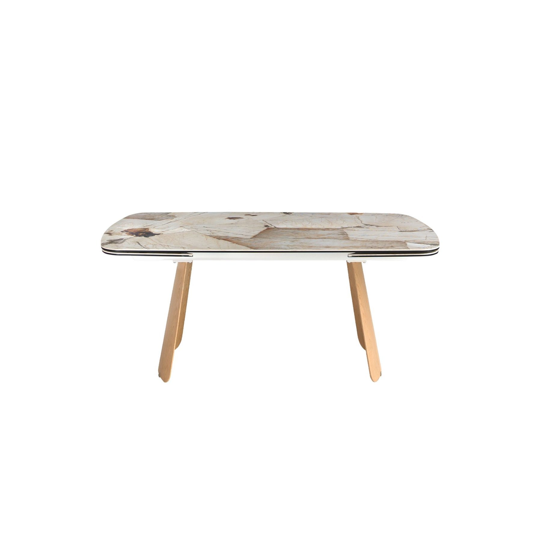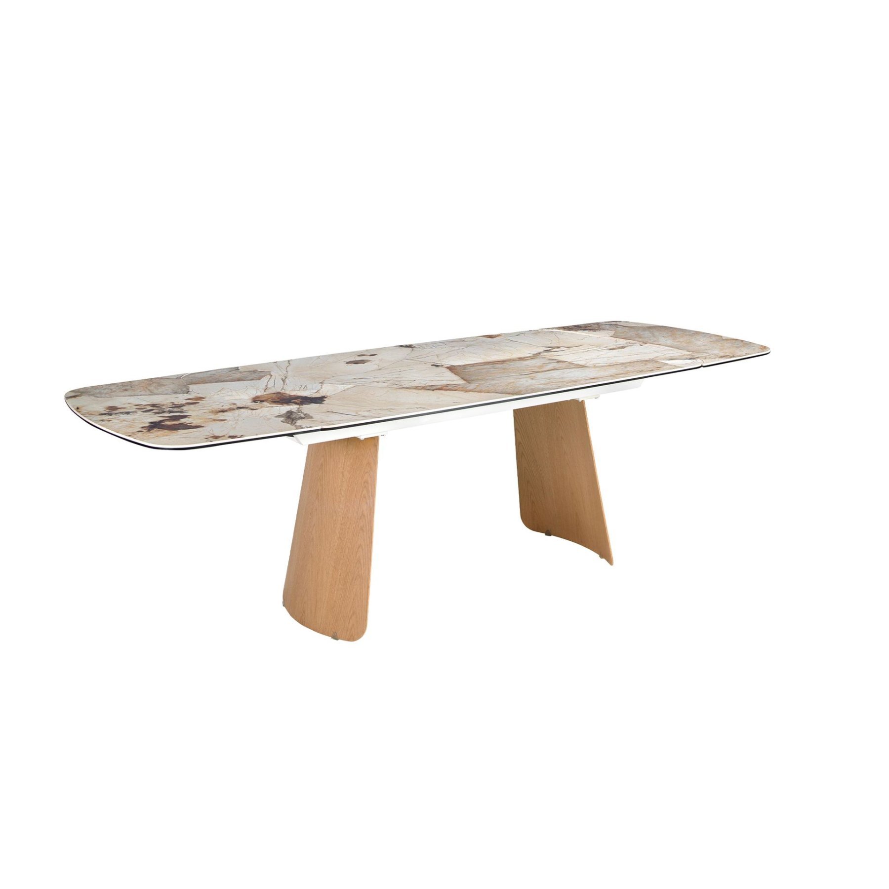 Современный овальный раздвижной обеденный стол бочкообразной формы с белой столешницей из фарфорового мрамора с узорами ржавого цвета и темно-серыми оттенками в глянцевой отделке. Ножки из дубового шпона и универсальность делают его полностью функциональным предметом мебели для повседневного использования.
