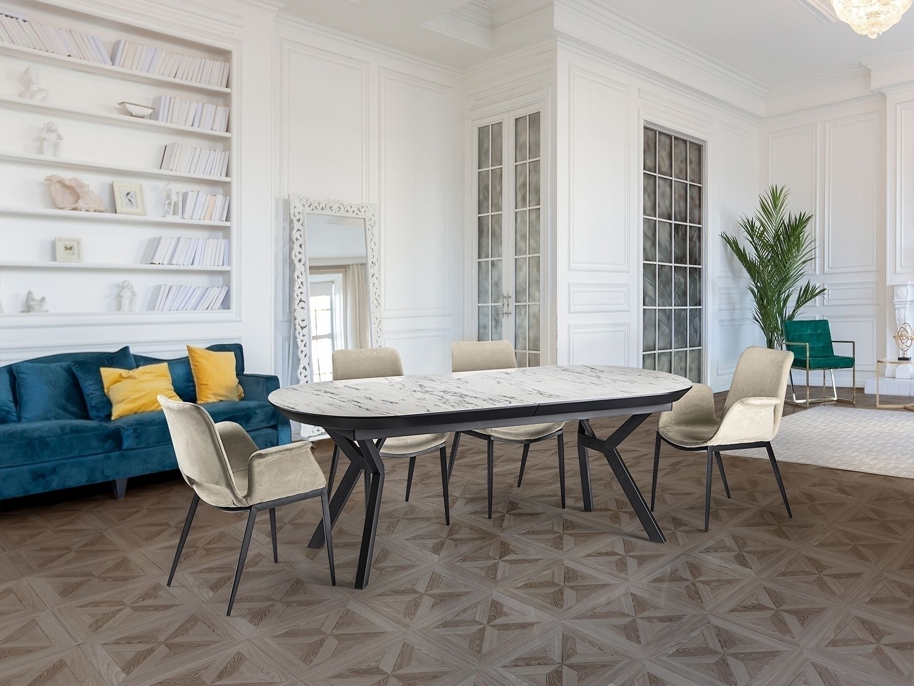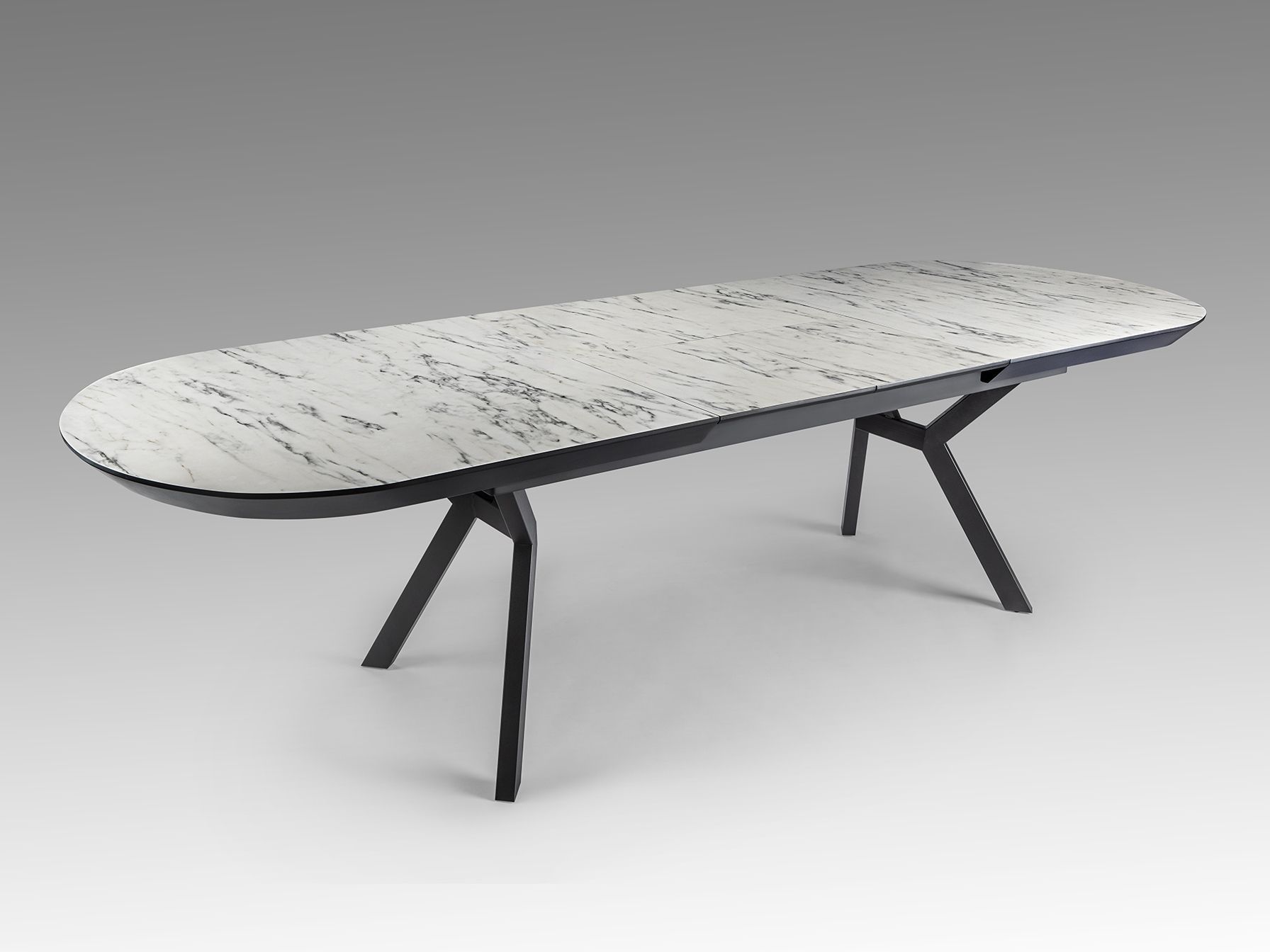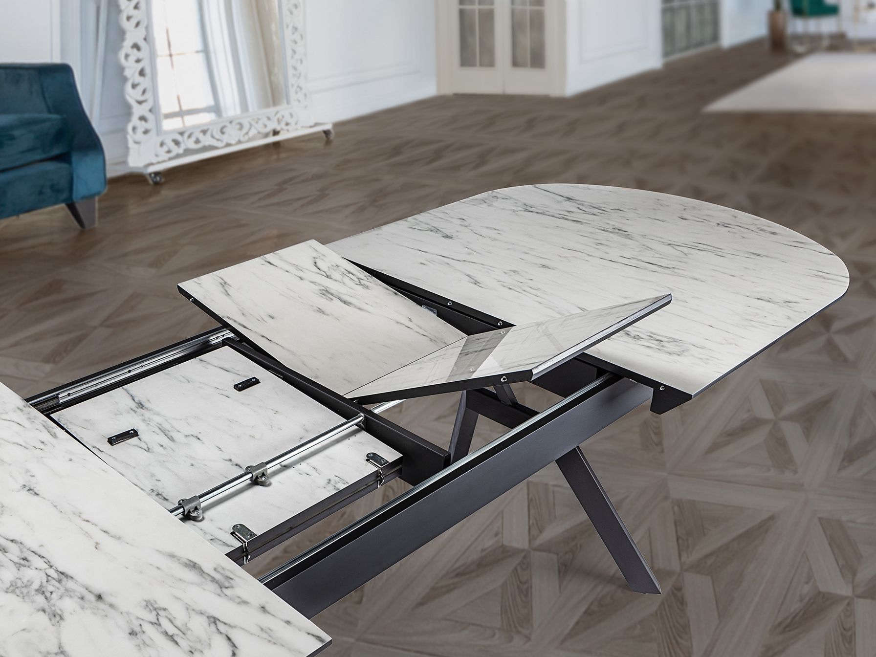 Раздвижной обеденный стол из металла с черной матовой отделкой и столешницей из МДФ с высокостойкой меламиновой поверхностью, глянцевой отделкой из белого мрамора, с черными матовыми краями. Расширяется до 2,85 метра.