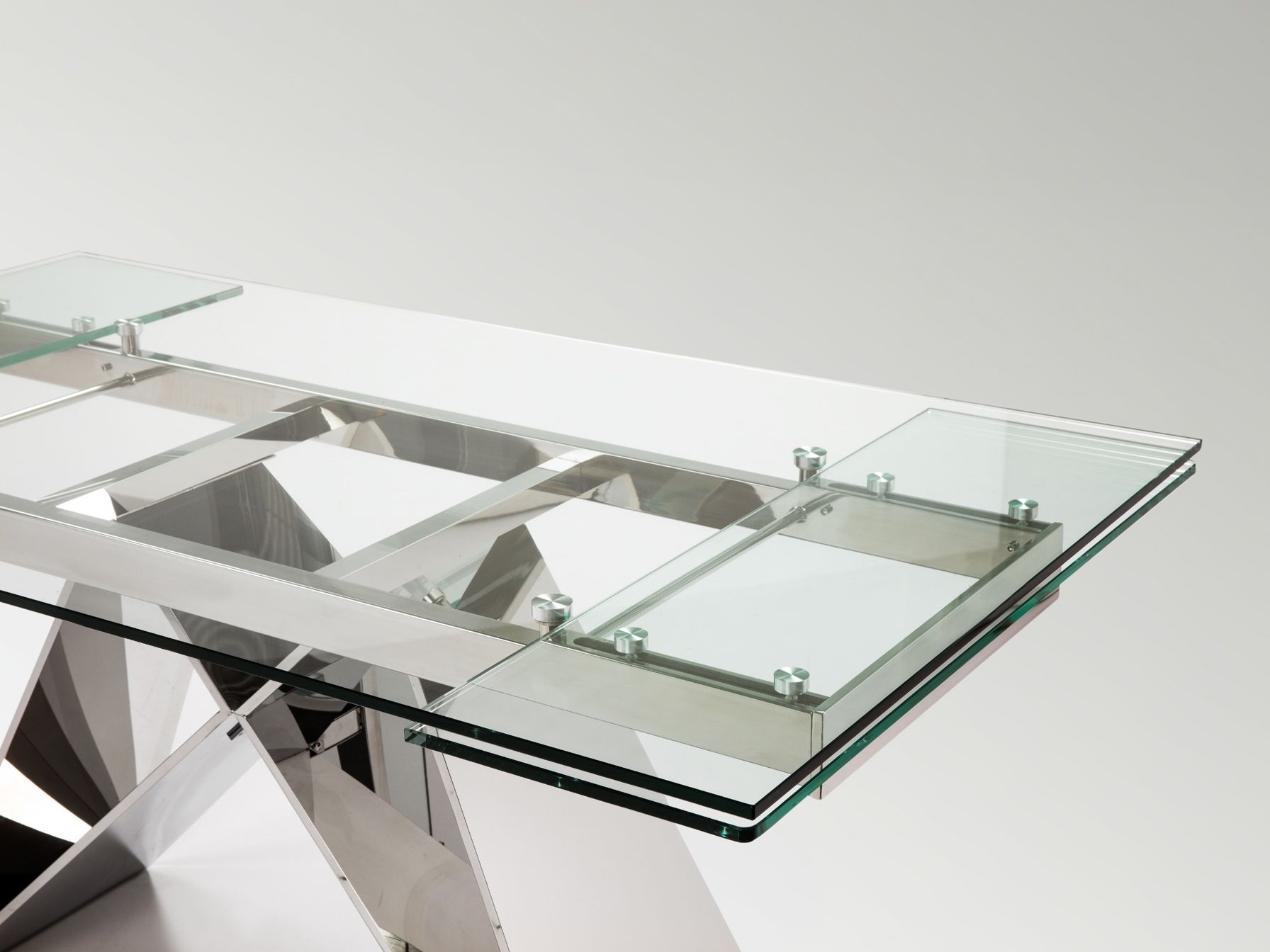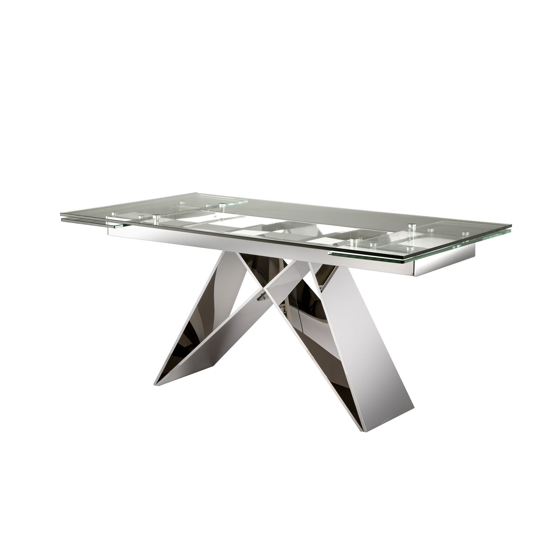 Обеденный стол, раздвижной 160/220 см, из нержавеющей стали, глянцевый. Столешница из безопасного стекла толщиной 12 мм с полированной кромкой.