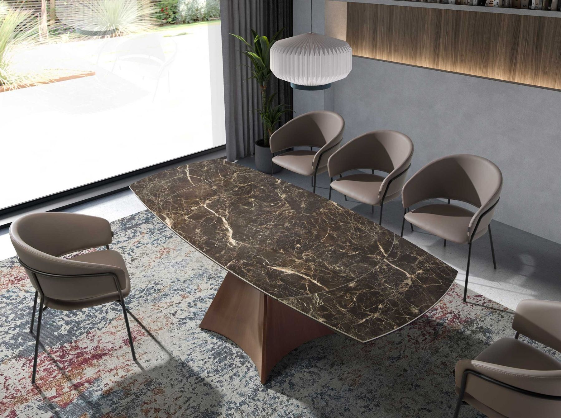 Раздвижной овальный обеденный стол современного дизайна со столешницей из коричневого фарфорового мрамора с кремовыми прожилками и глянцевой отделкой. Ножки из лакированной нержавеющей стали, имитирующие ореховое дерево, а также адаптируемость делают его полностью функциональным и универсальным предметом мебели для повседневного использования.