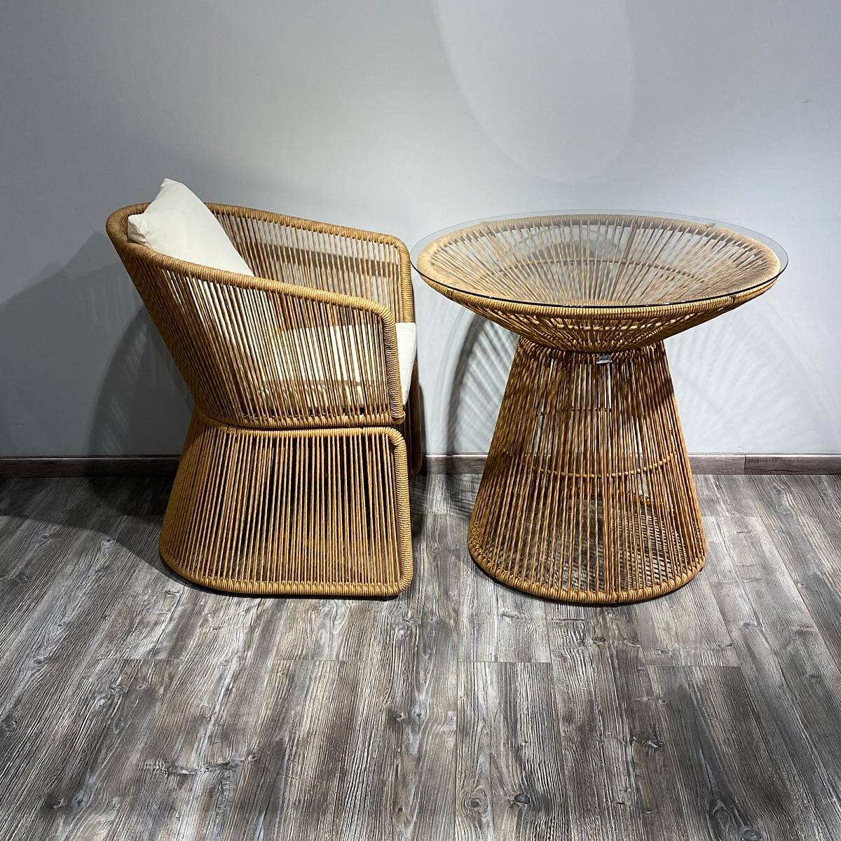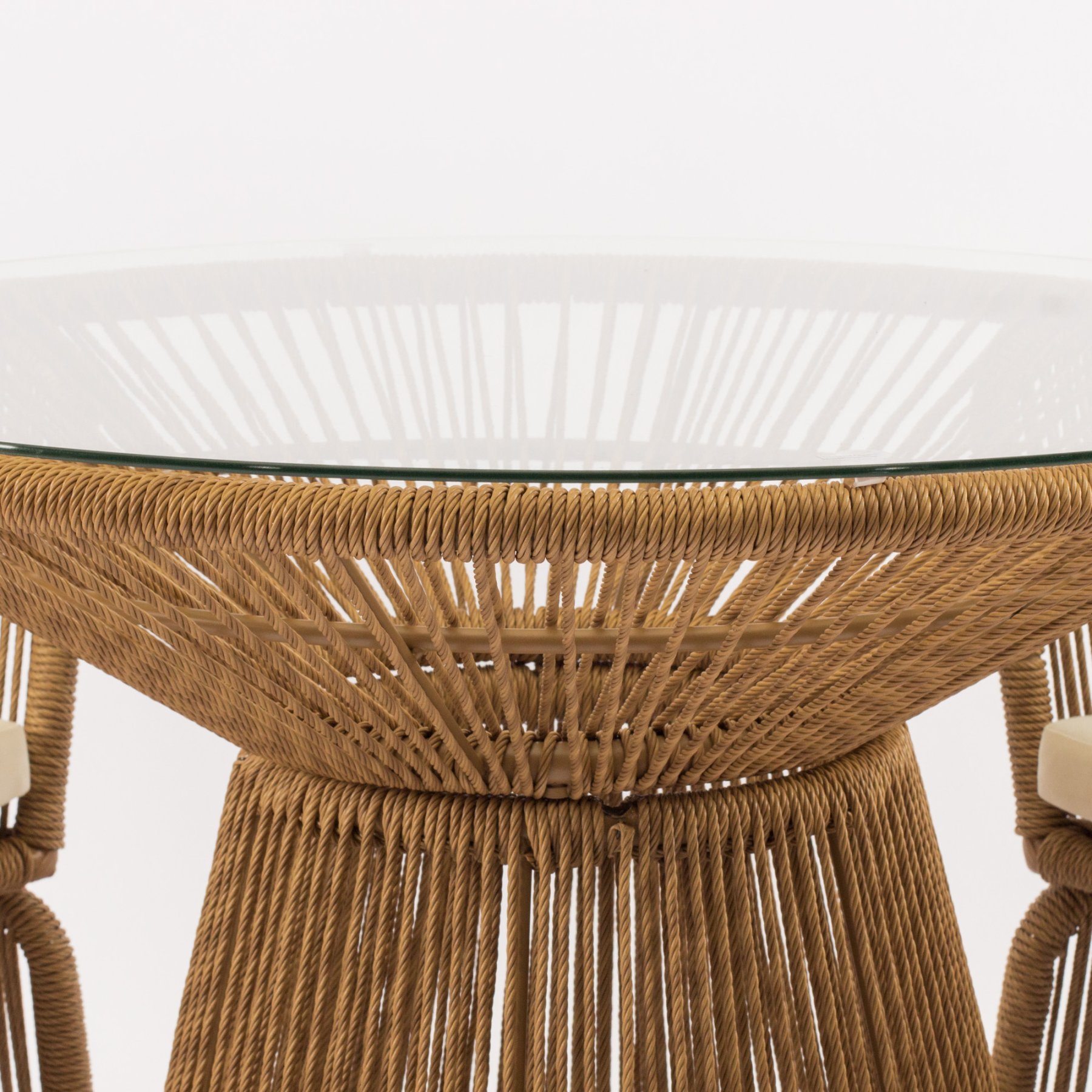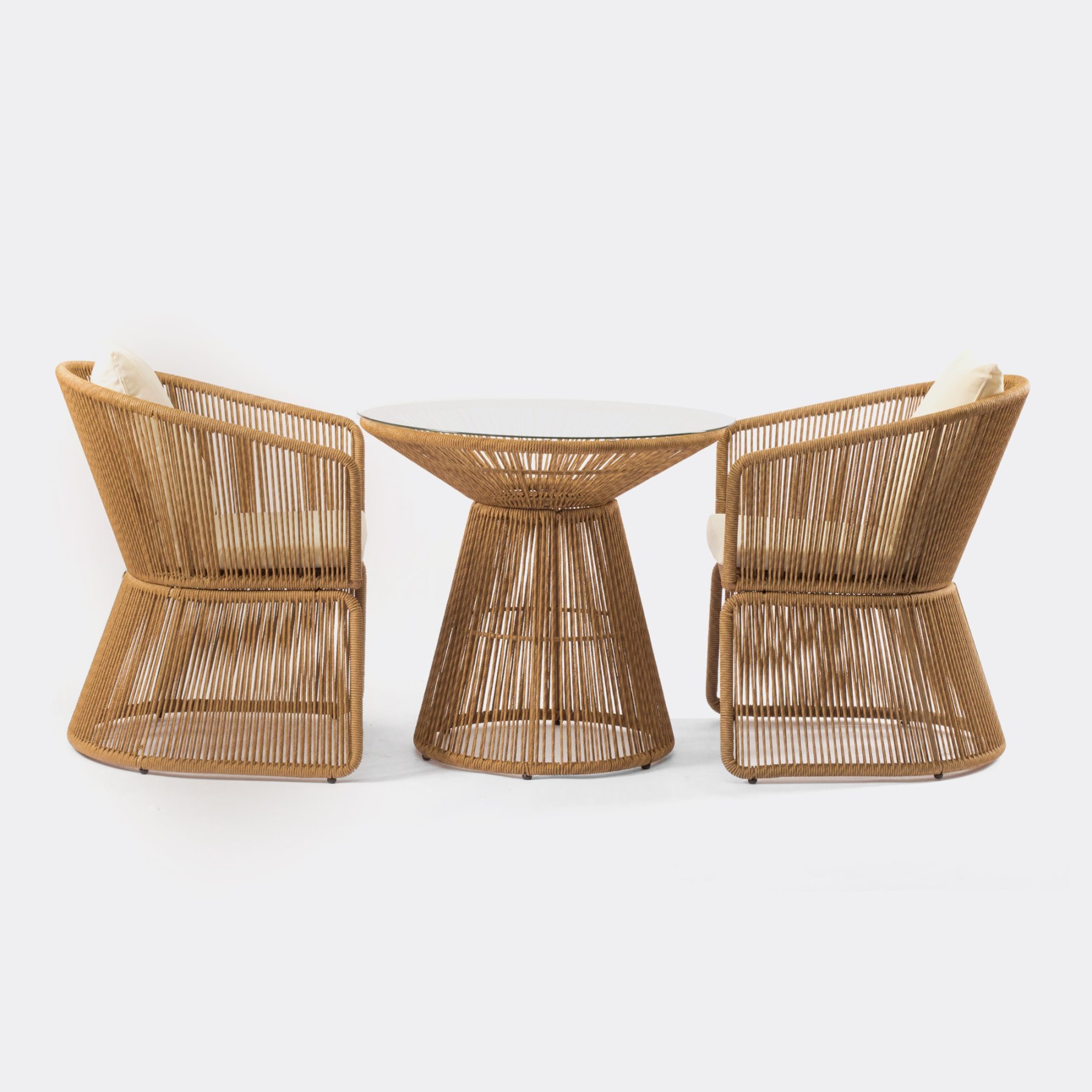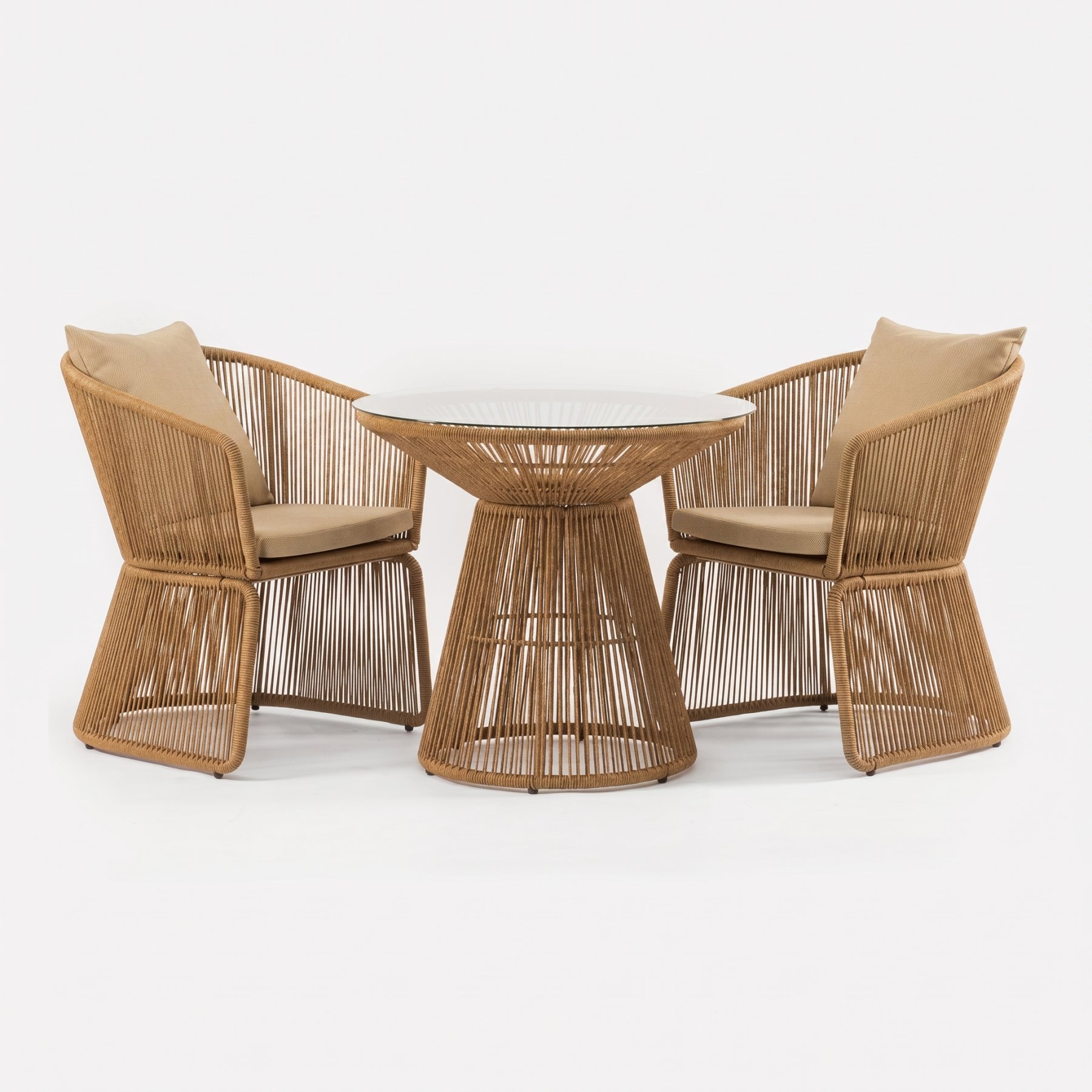 Центральной частью этого комплекта является плетеный стол "Сен-Тропе" диаметром 80 см. Его столешница из стекла придает элегантный и современный вид, при этом оставаясь прочной и практичной. Основание стола также выполнено из плетеной веревки, повторяя изящный узор кресел и создавая единый гармоничный ансамбль.