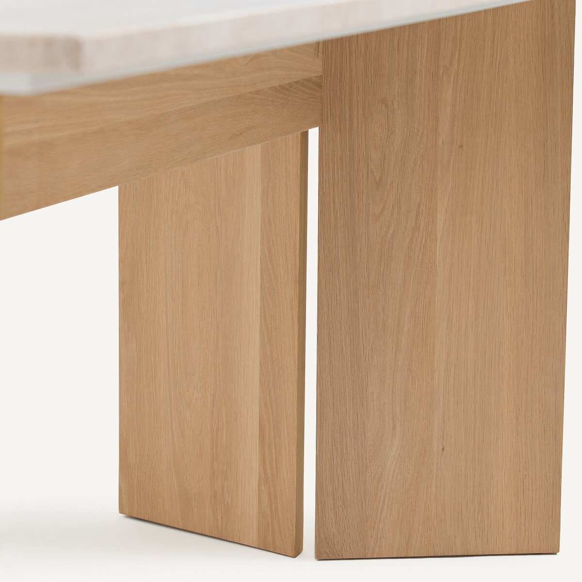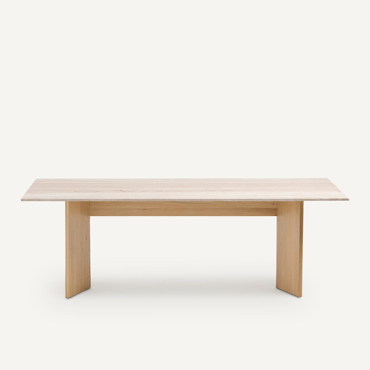 Красивую столешницу из современного минерала на каркасе из дуба делает из модели Mindo обеденный стол, вдохновленный природой и архитектурным стилем, идеален для 8 персон. Гладкая столешница из итальянского травертина, края без отделки и отполированные кромки. Чуть разведенные ножки, позволяющие свету свободно обтекать предмет, в виде створок, соединенных распоркой, выполнены из обесцвеченного пескоструйного дуба. Каждое изделие уникально, дизайн от AMPM.