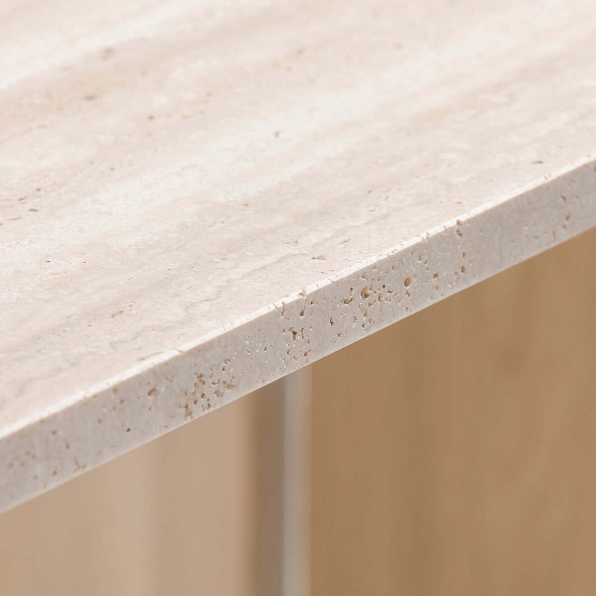 — Травертин, или известковый туф, — натуральный пористый и чувствительный к жаре материал. Рекомендации по использованию: незамедлительно протирайте пролитую жидкость с помощью влажной белой ткани. Не ставьте горячие предметы на поверхность. Рекомендуем использовать подстаканники, подложки под столовые приборы и под блюда.
