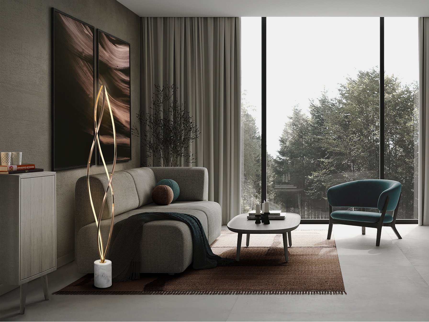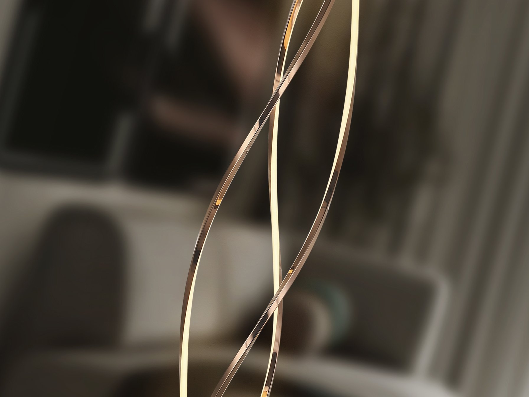 Торшер из стали с отделкой из блестящего розового золота и основанием из белого мрамора. Опаловый акриловый рассеиватель. Светодиодное освещение мощностью 60 Вт, 2700 К. С возможностью регулировки яркости.