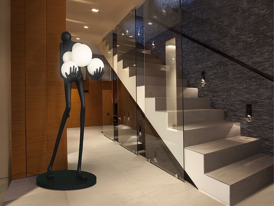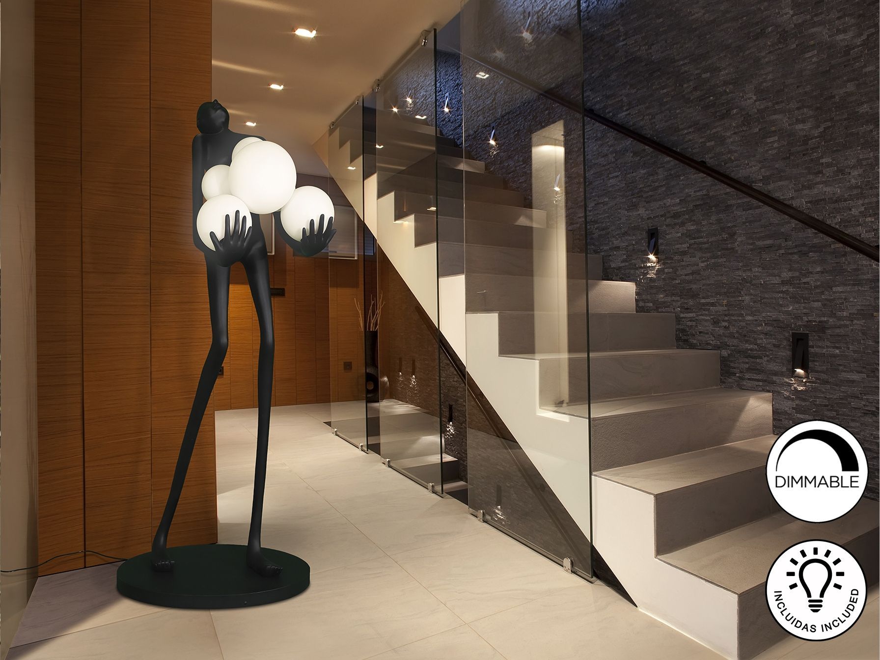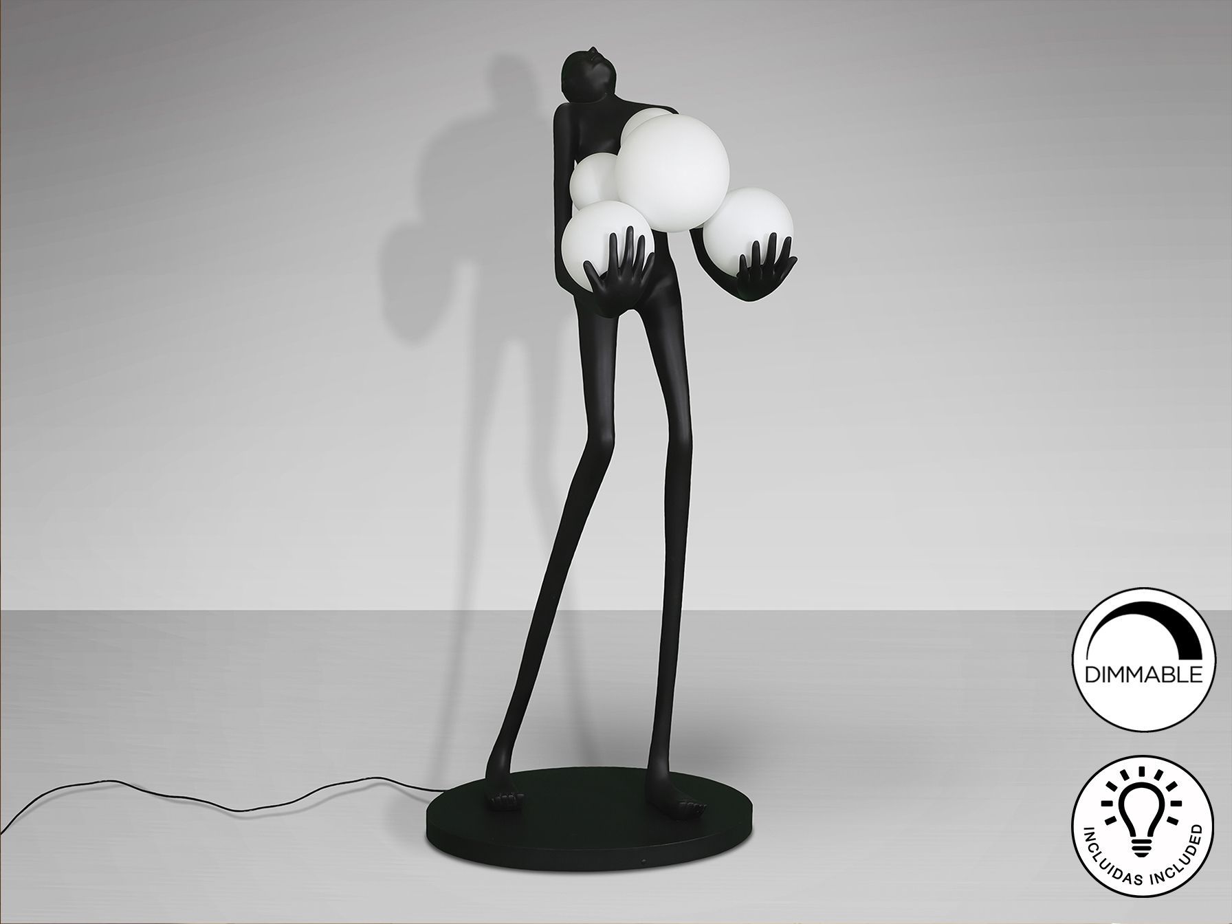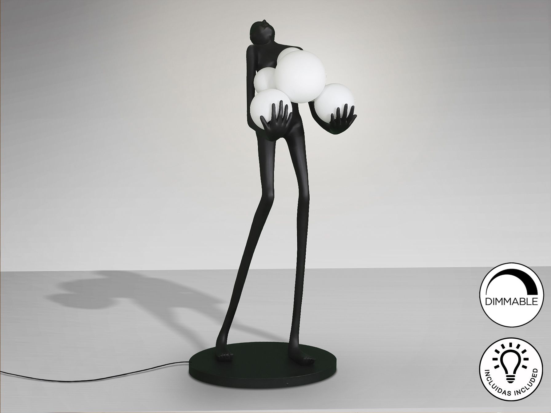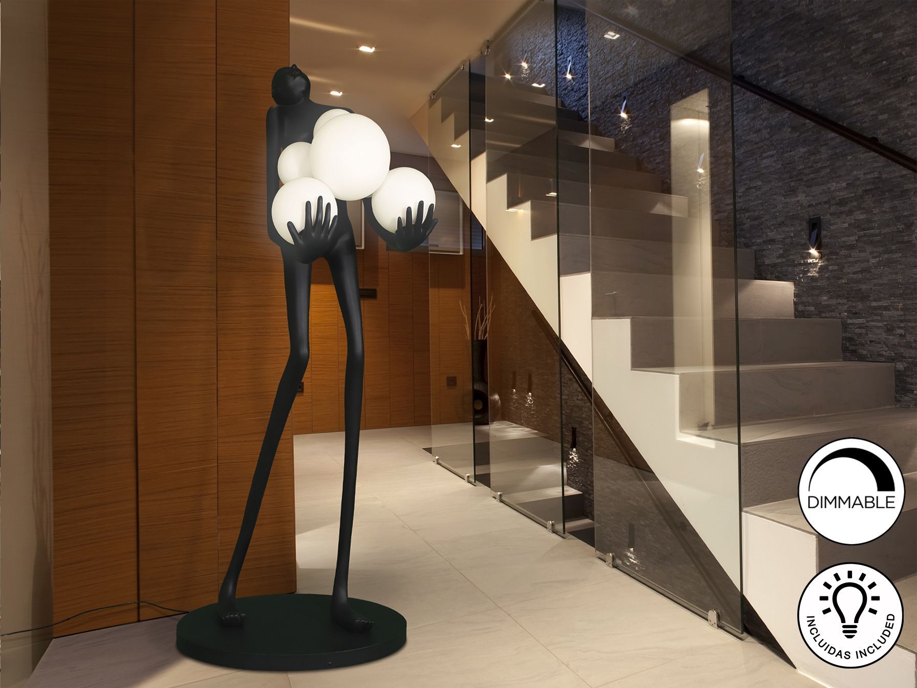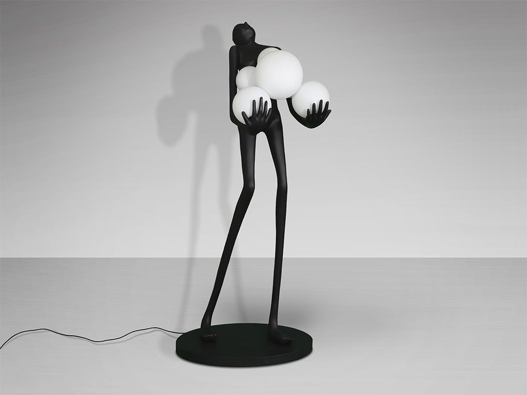 Фигура изготовлена из стекловолокна и полиэфирной смолы, матово-черная отделка, сферические плафоны из акрилового стекла с матово-опаловой отделкой.