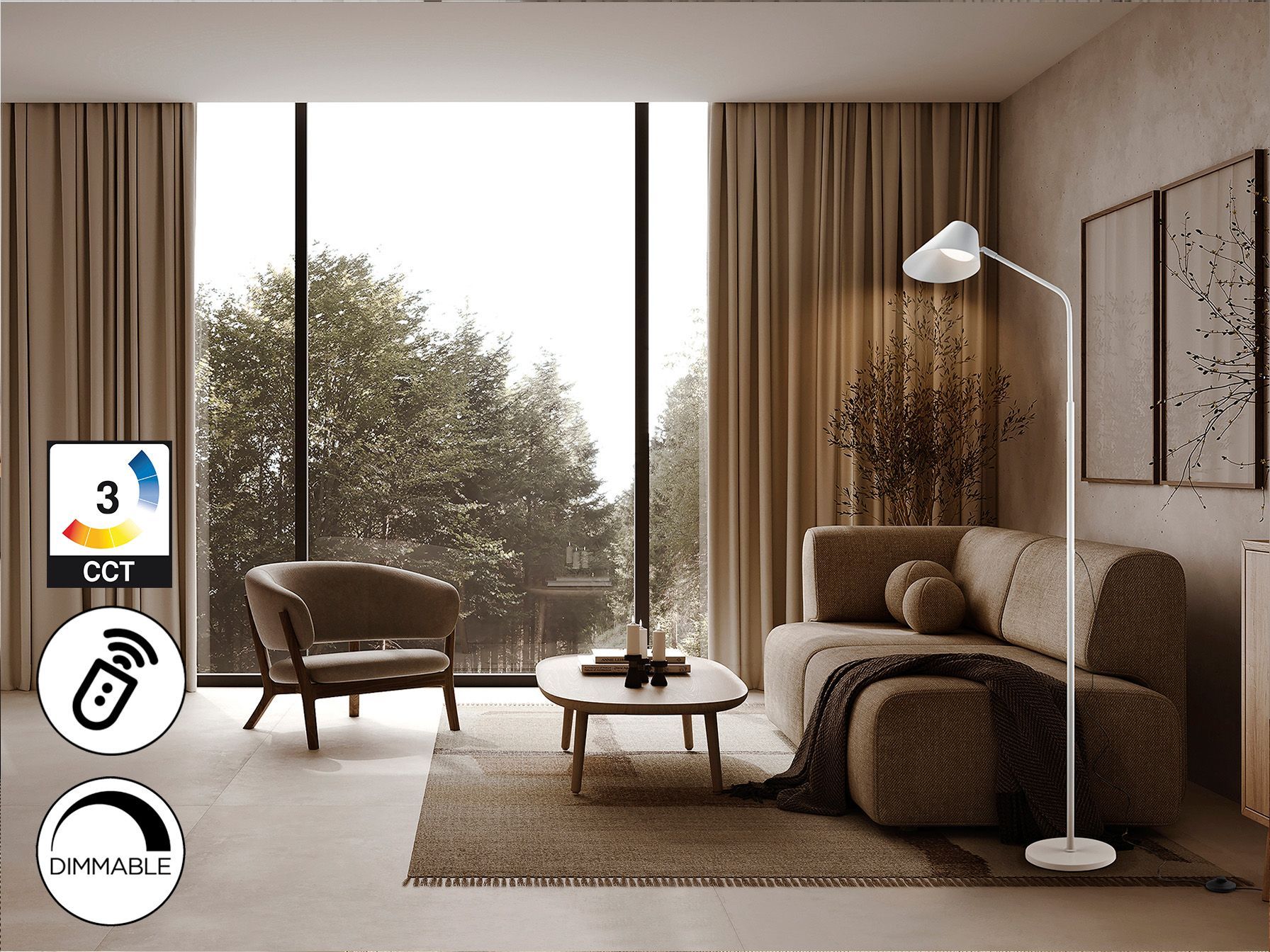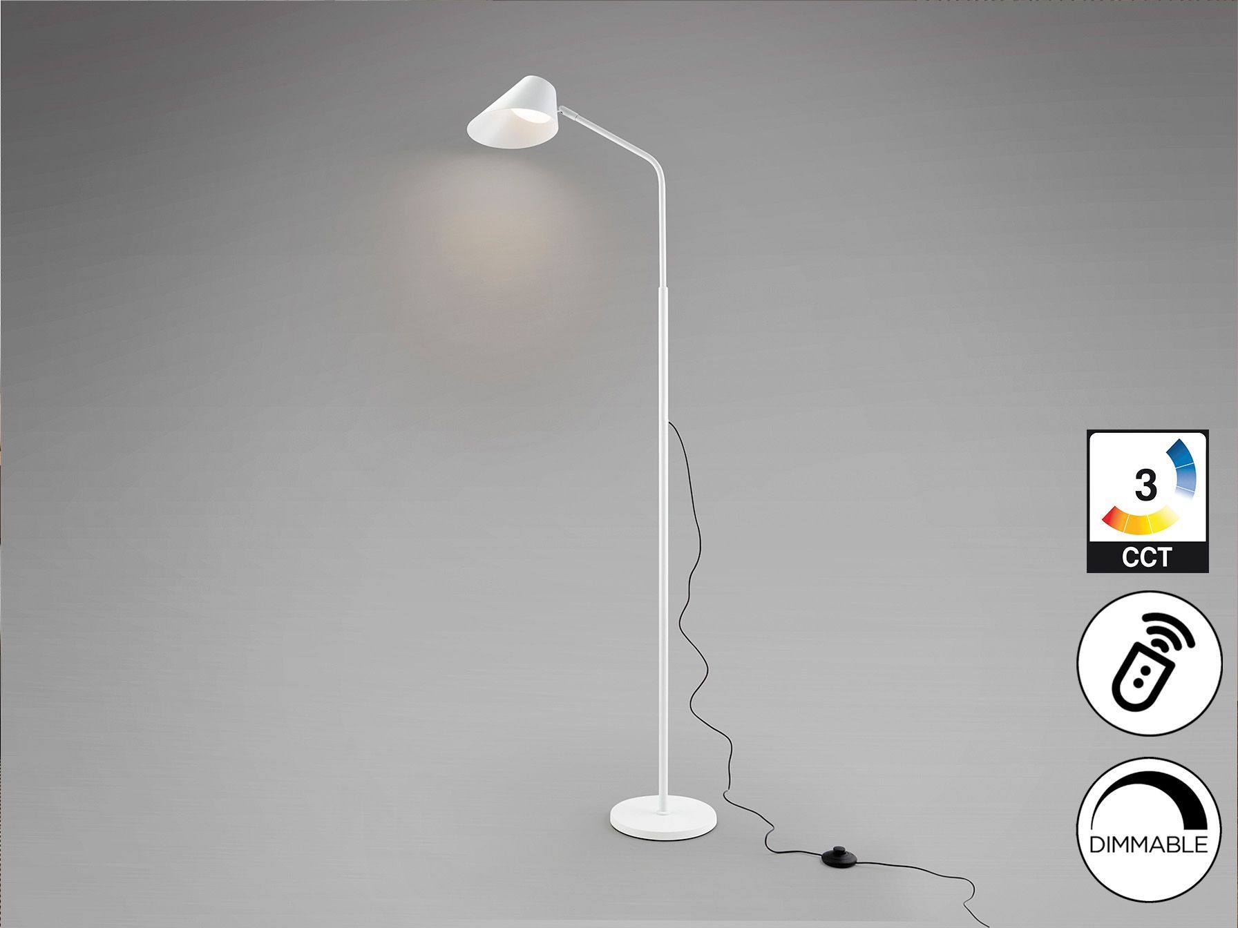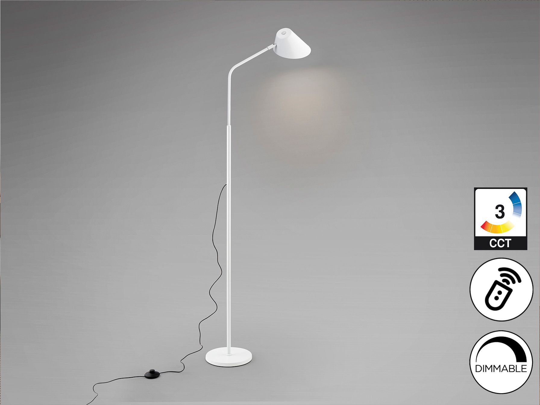 Напольный светильник из металла и алюминия, матово-белый цвет, опаловый рассеиватель. Тактильная кнопка и ПУЛЬТ ДИСТАНЦИОННОГО УПРАВЛЕНИЯ. Регулируемый прожектор, регулировка яркости света, регулируемая цветовая температура. Светодиод 10 Вт, 900 лм, CCT 3000K-6500K.