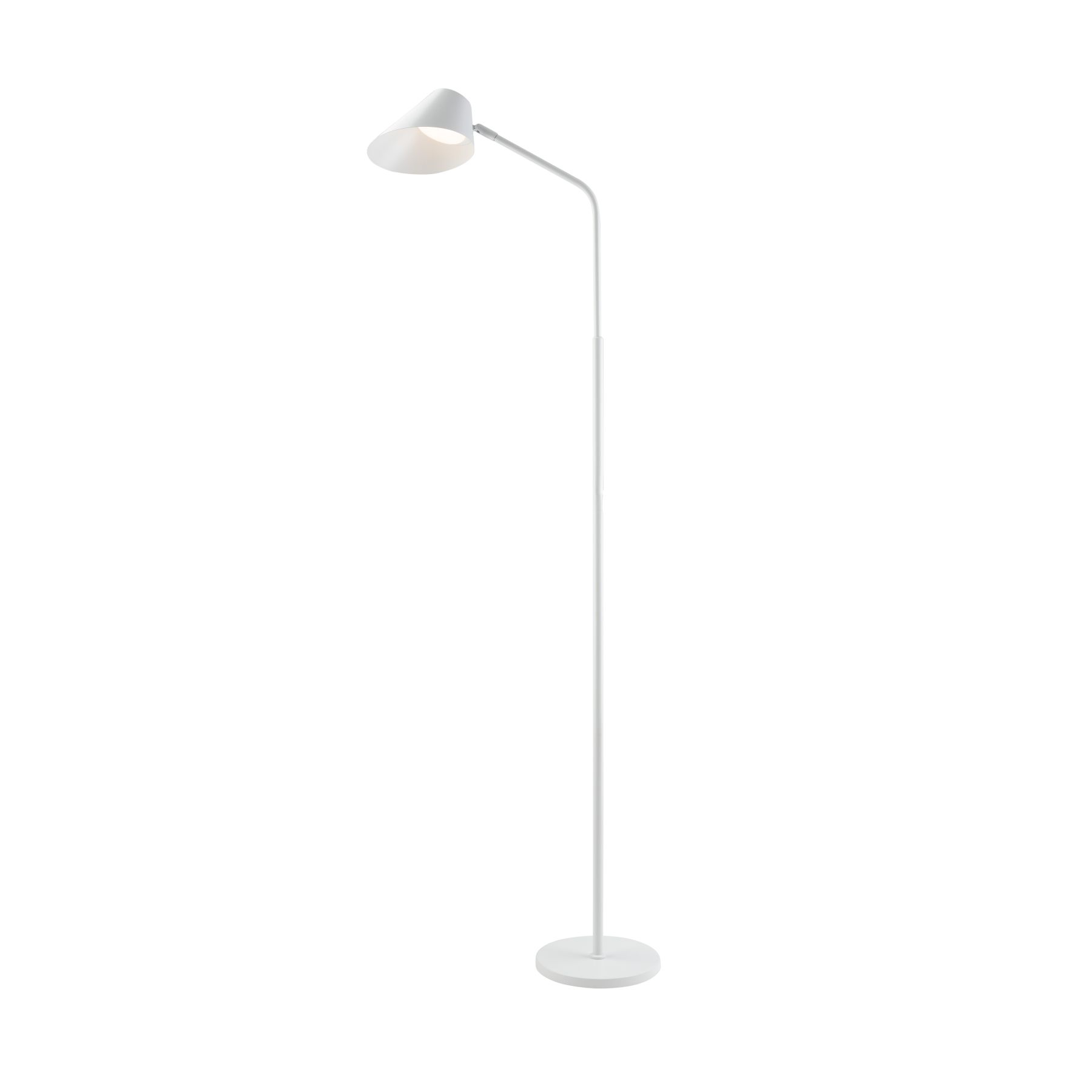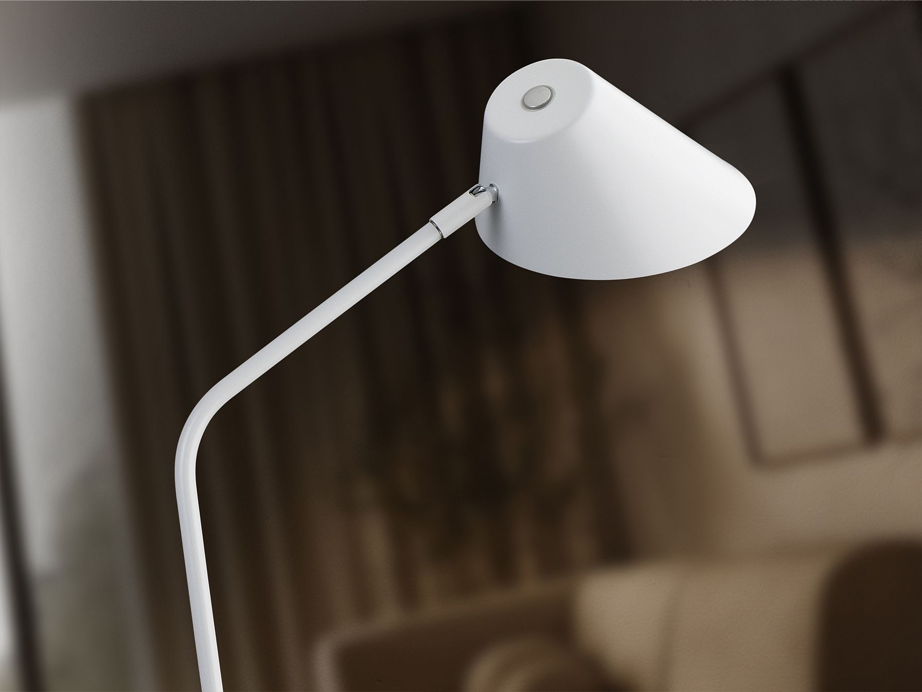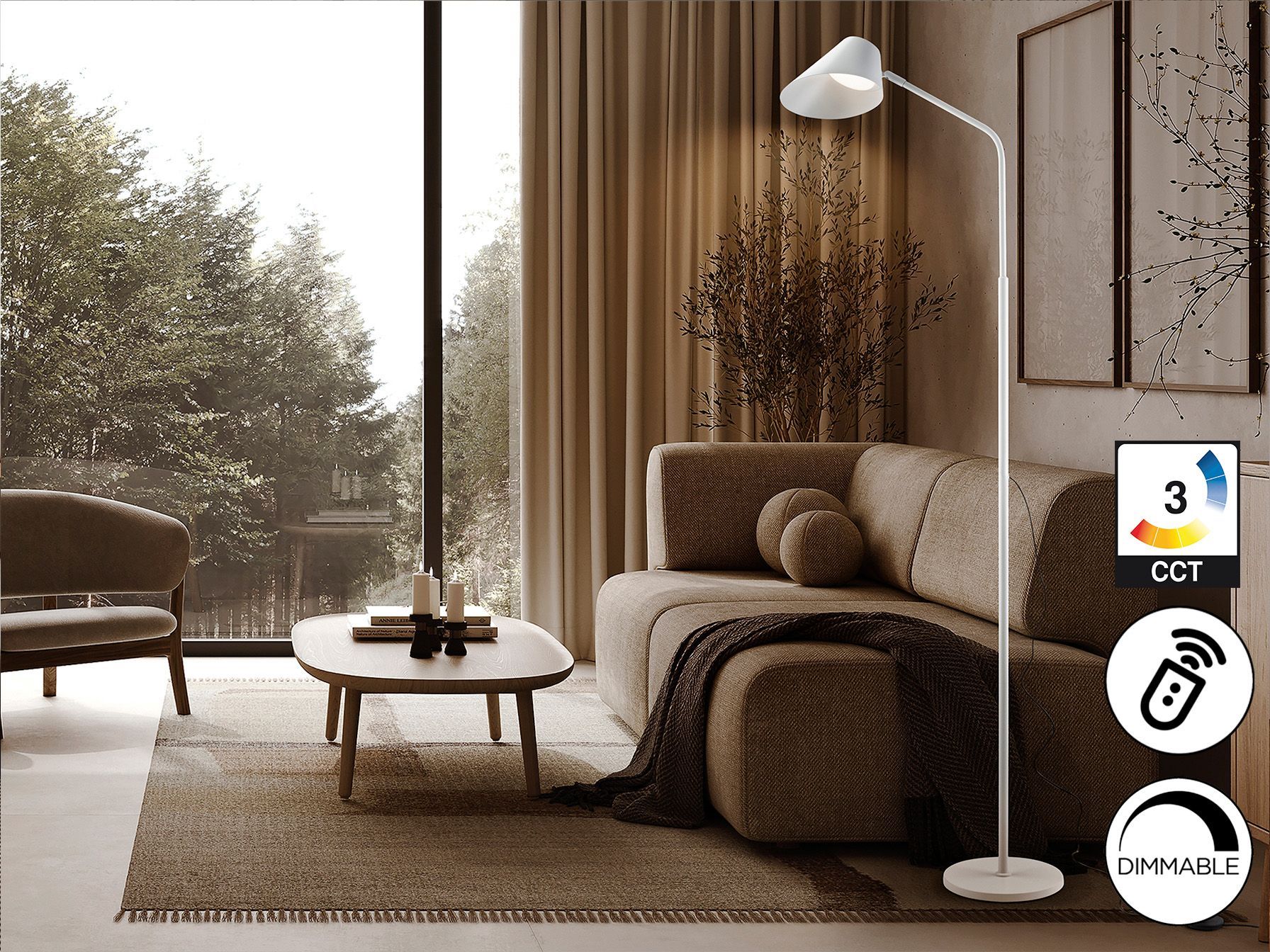 Напольный светильник из металла и алюминия, матово-белый цвет, опаловый рассеиватель. Тактильная кнопка и ПУЛЬТ ДИСТАНЦИОННОГО УПРАВЛЕНИЯ. Регулируемый прожектор, регулировка яркости света, регулируемая цветовая температура. Светодиод 10 Вт, 900 лм, CCT 3000K-6500K.