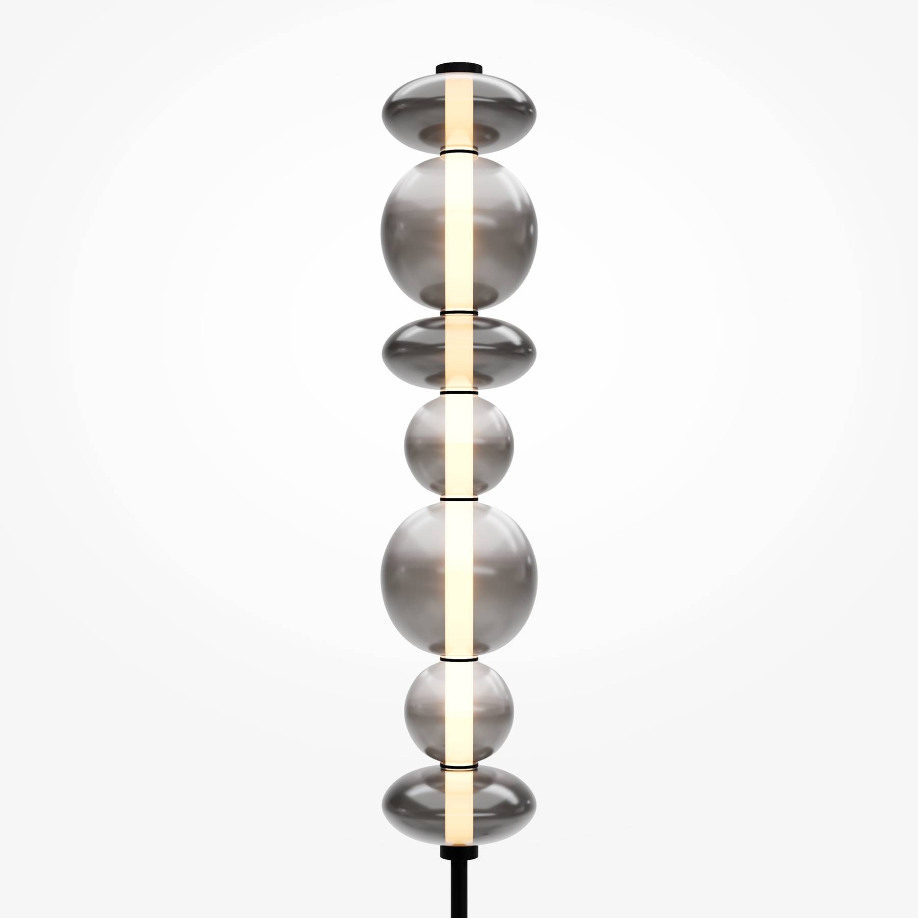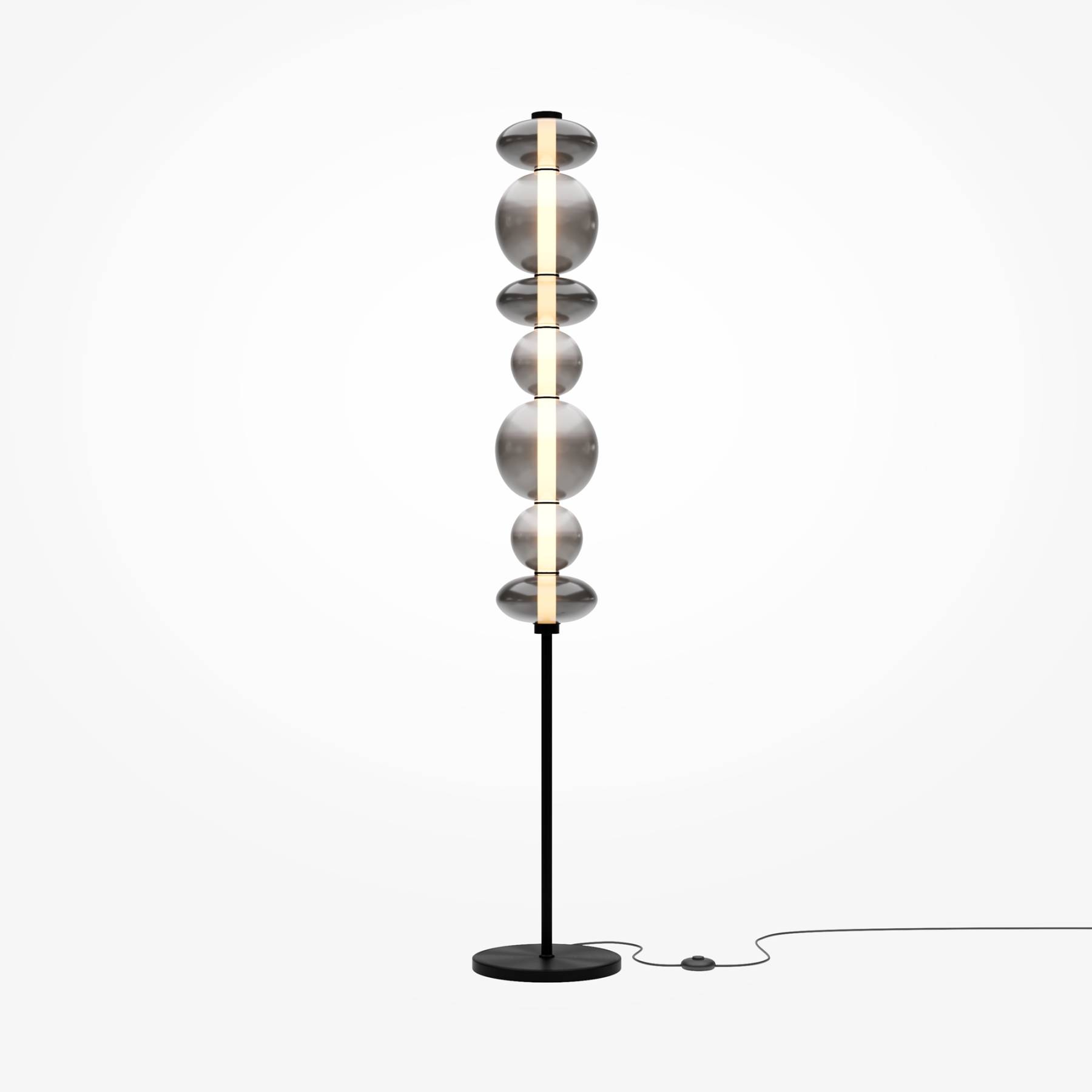 Светильники с тонированными выдувными стеклянными плафонами (дымчатыми или янтарными) и металлической арматурой (черной или цвета латуни). Окрашивание плафонов градиентное. Источник света: LED. Световой элемент установлен внутри акрилового рассеивателя. Цветовая температура источника света – 3000К, угол рассеивания — 120°. Торшеры снабжены Push-кнопкой на проводе.