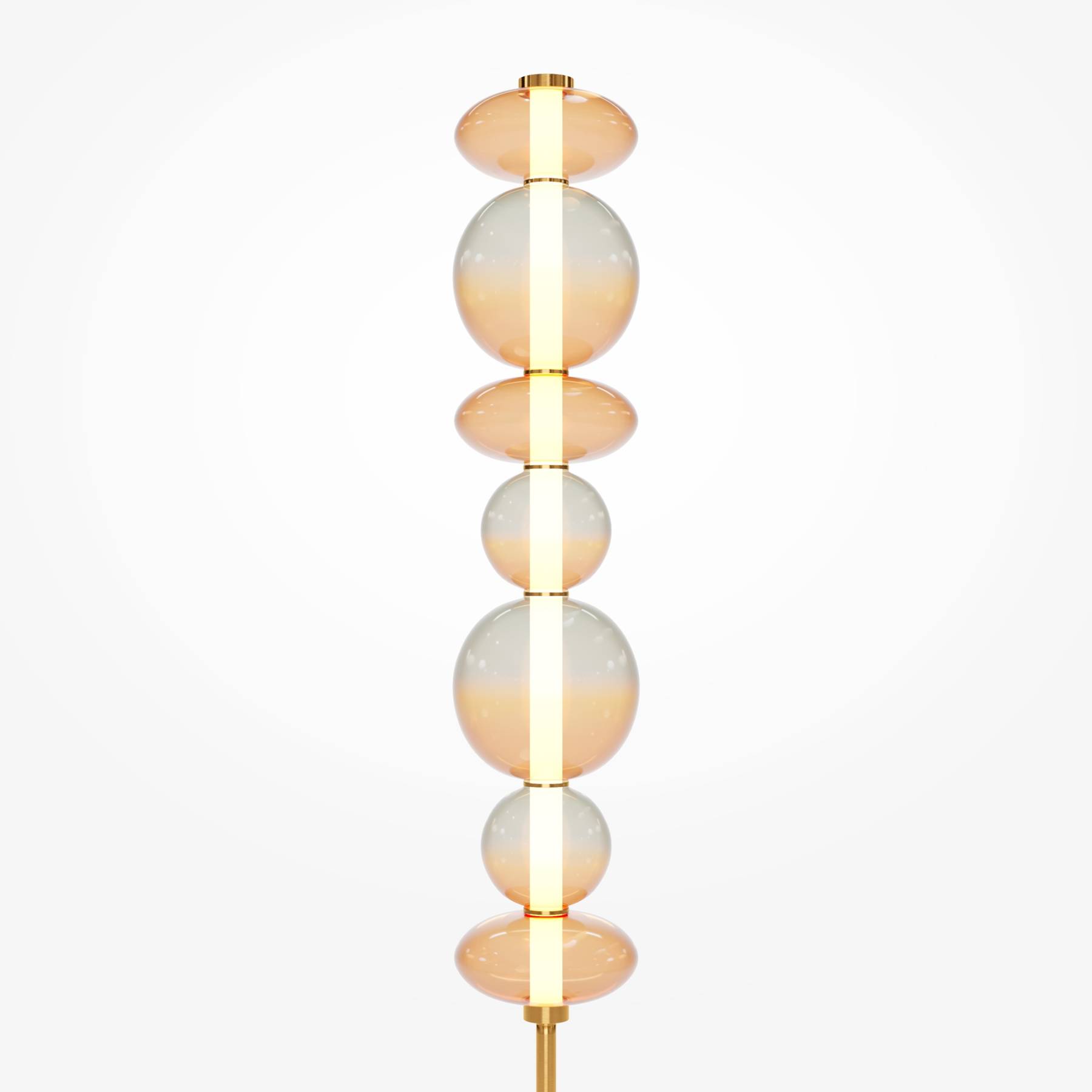 Светильники с тонированными выдувными стеклянными плафонами (дымчатыми или янтарными) и металлической арматурой (черной или цвета латуни). Окрашивание плафонов градиентное. Источник света: LED. Световой элемент установлен внутри акрилового рассеивателя. Цветовая температура источника света – 3000К, угол рассеивания — 120°. Торшеры снабжены Push-кнопкой на проводе.