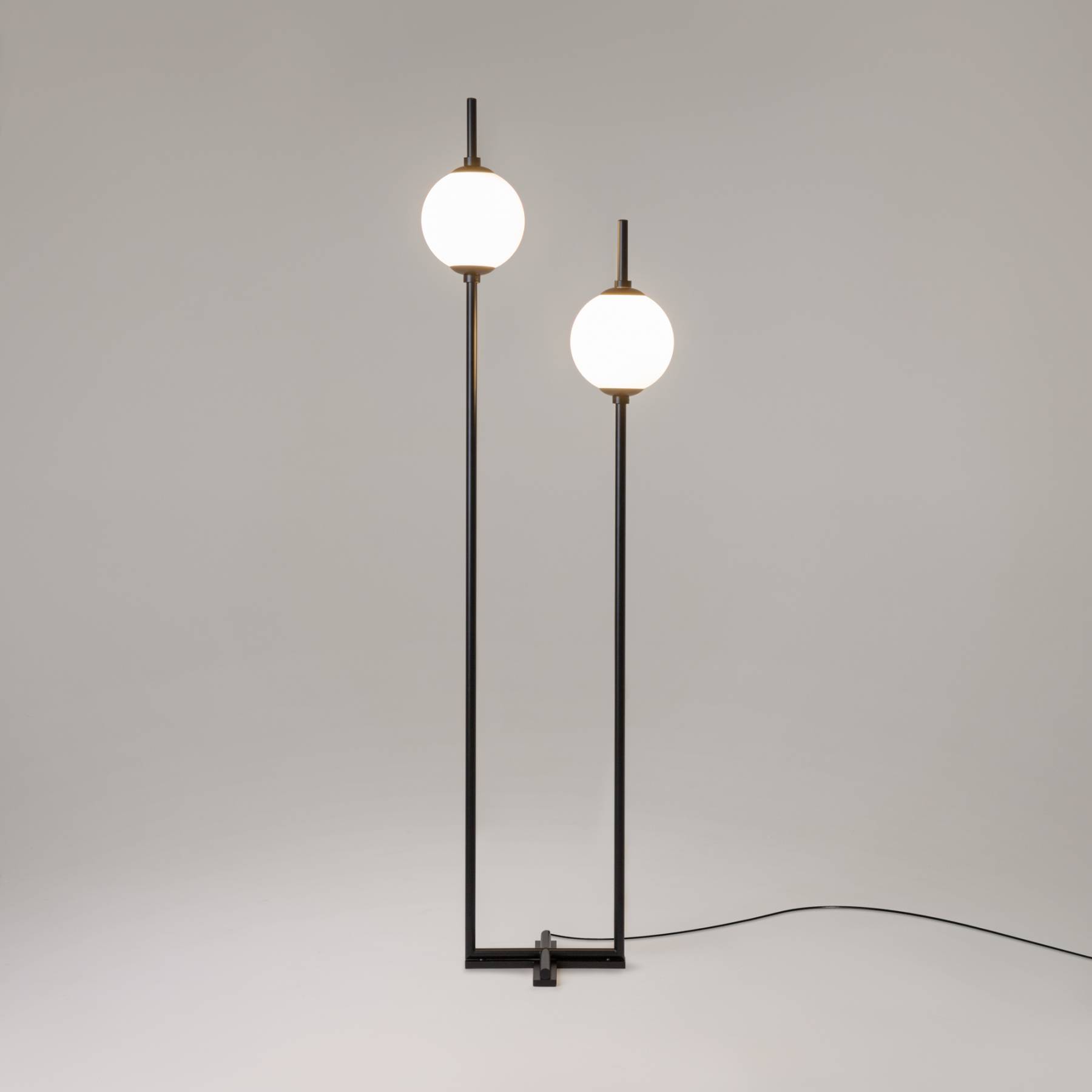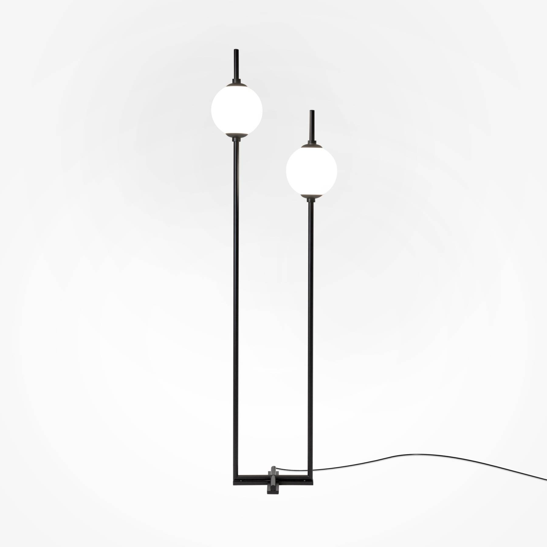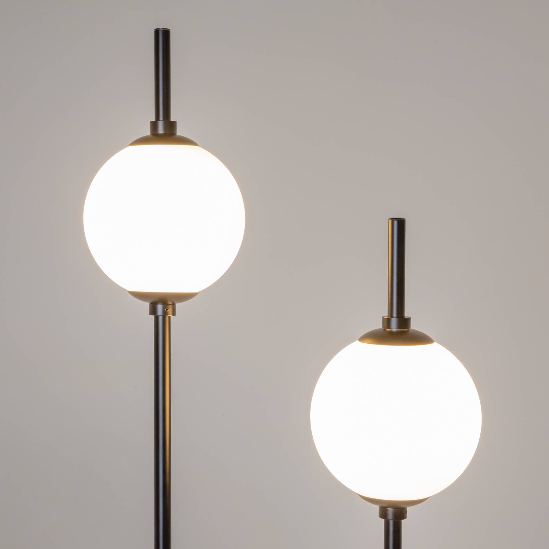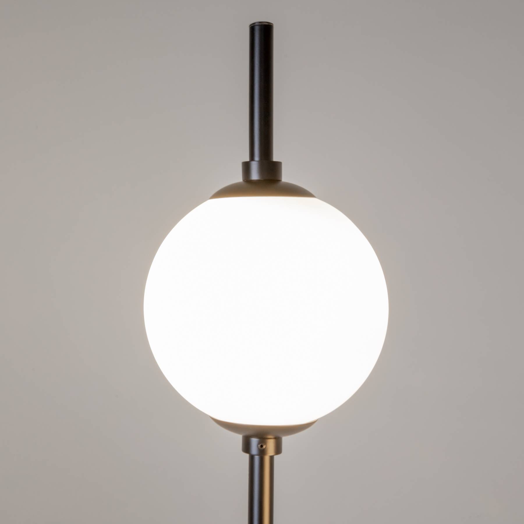 Металлическая арматура в черном цвете. Плафоны-сферы из белого стекла. LED-источник света с цветовой температурой 3000К. Удобные выключатели вверхней части арматуры. Функция раздельного включения световых элементов