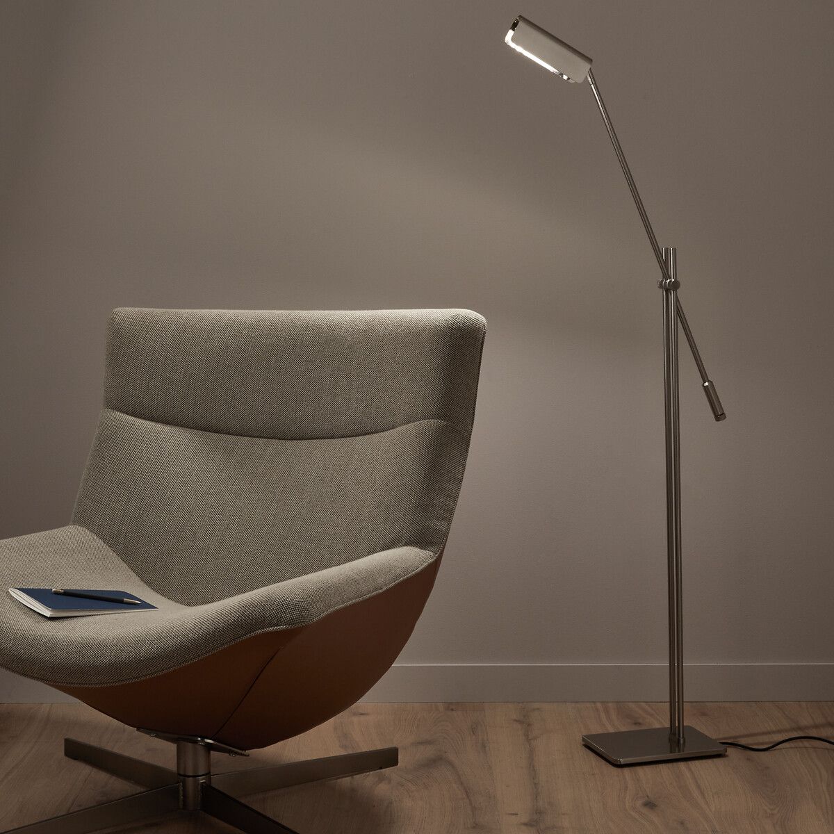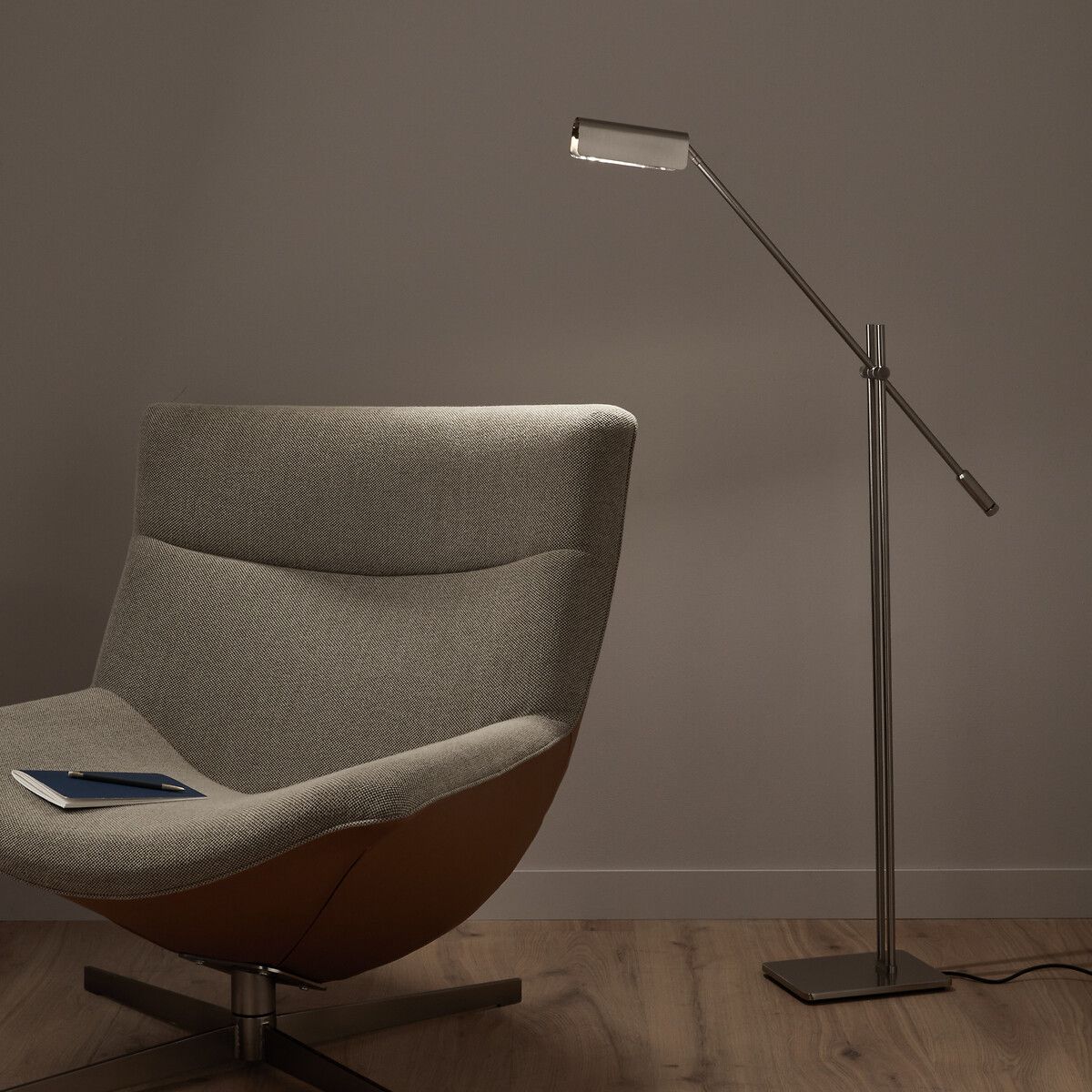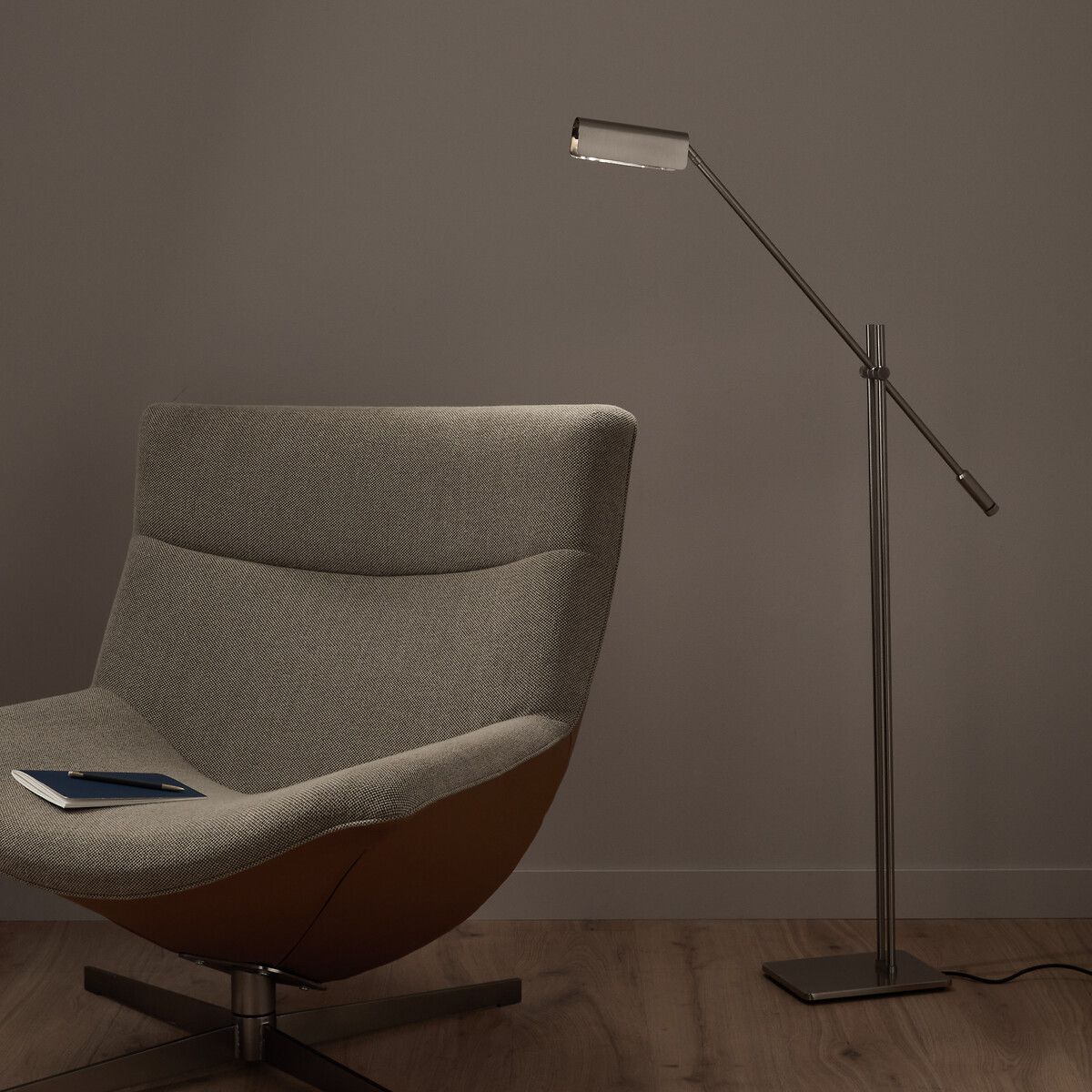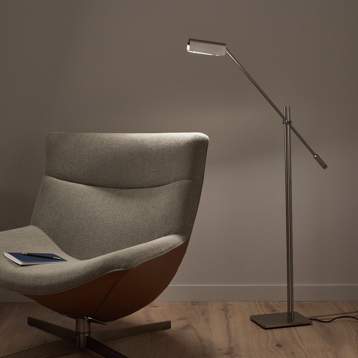 Очень легкий торшер, состоящий из прямоугольного основания и шарнирного кронштейна, напоминающего маятник, позволяет вам направлять световой поток в нужном направлении. Сатинированное никелированное покрытие в индустриальном стиле придает изделию сдержанный и графичный вид. Творение AM.PM.