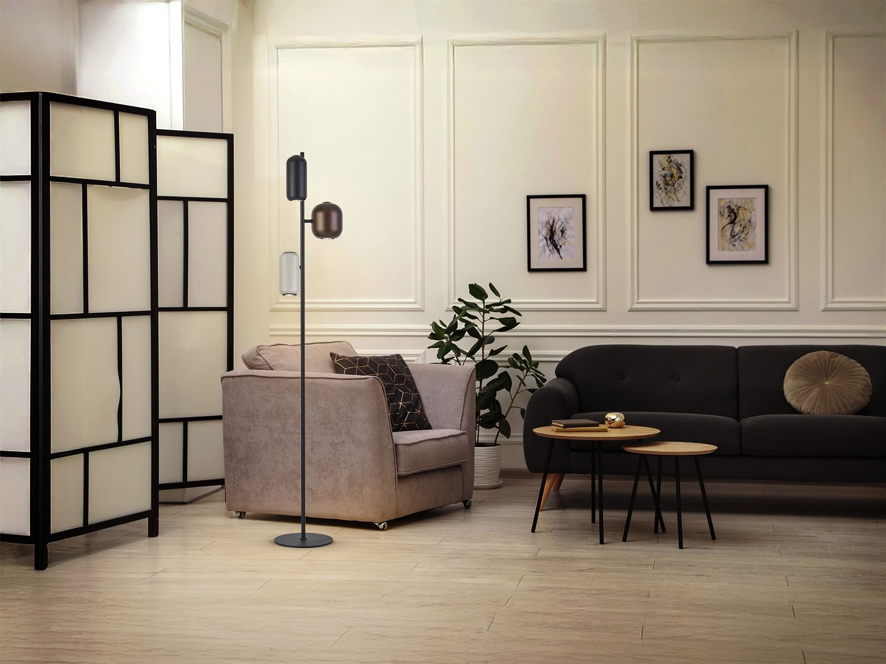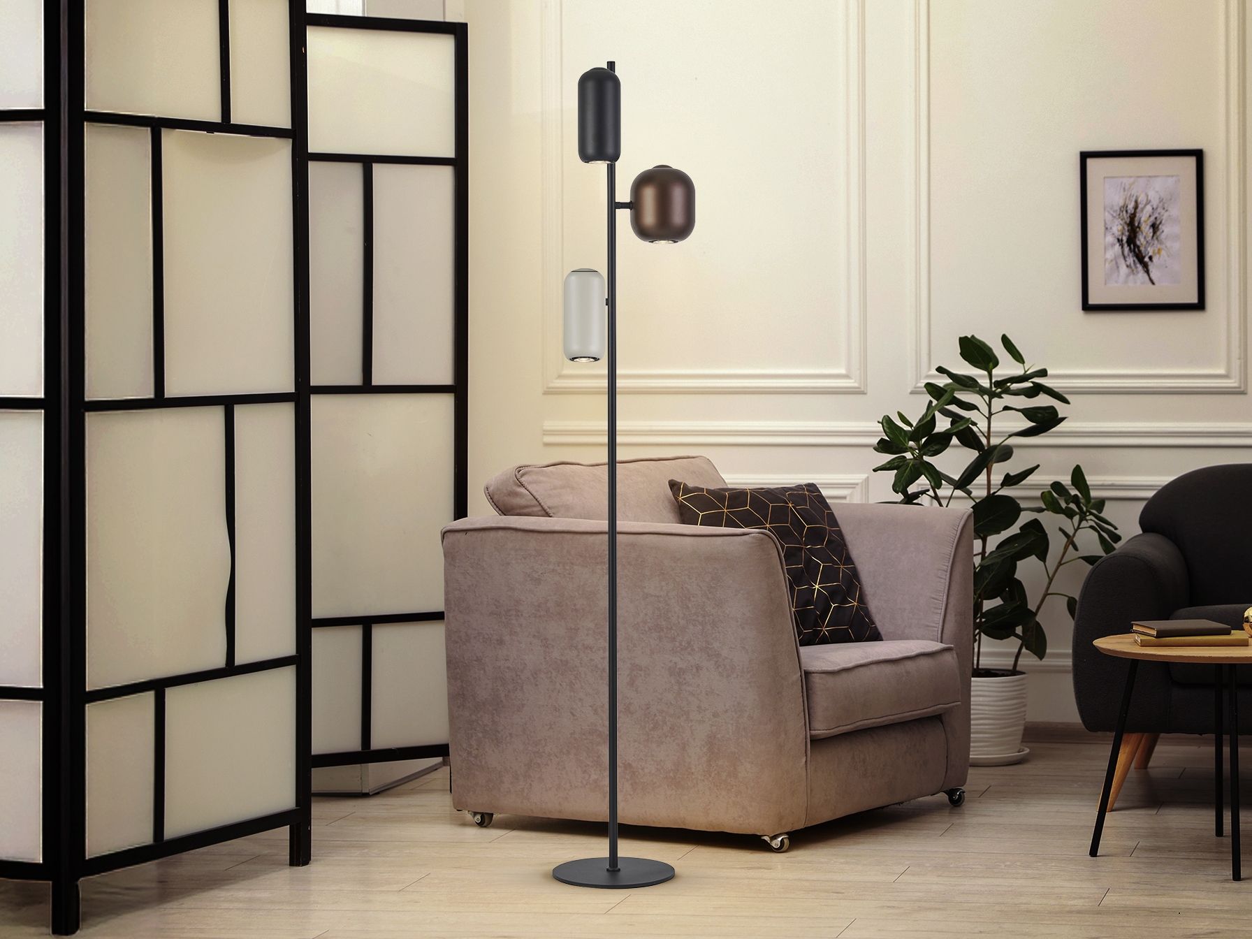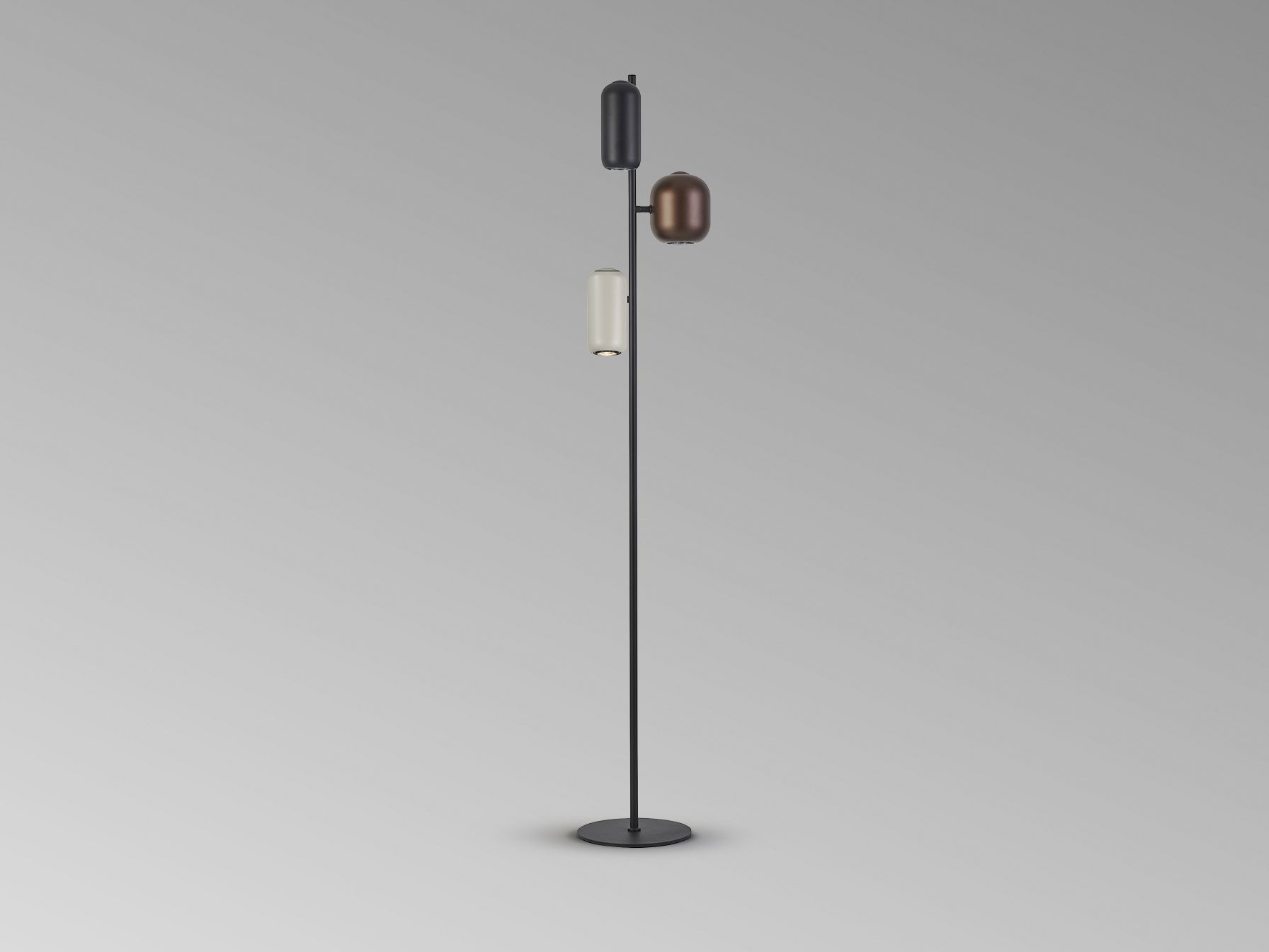 Напольный светильник из металла, окрашенного в матово-черный цвет. 3 металлических плафона матово-черного, темно-коричневого и светло-серого цветов. Патроны GU10.