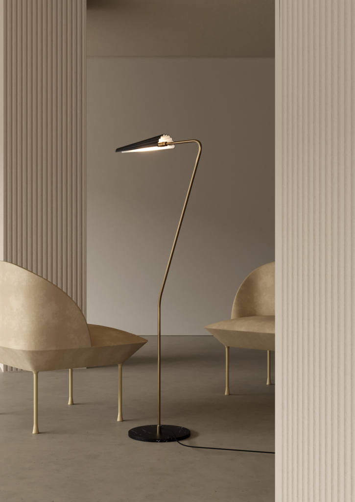 Торшер, выполненный из мрамора и металла в черной или золотой отделке.